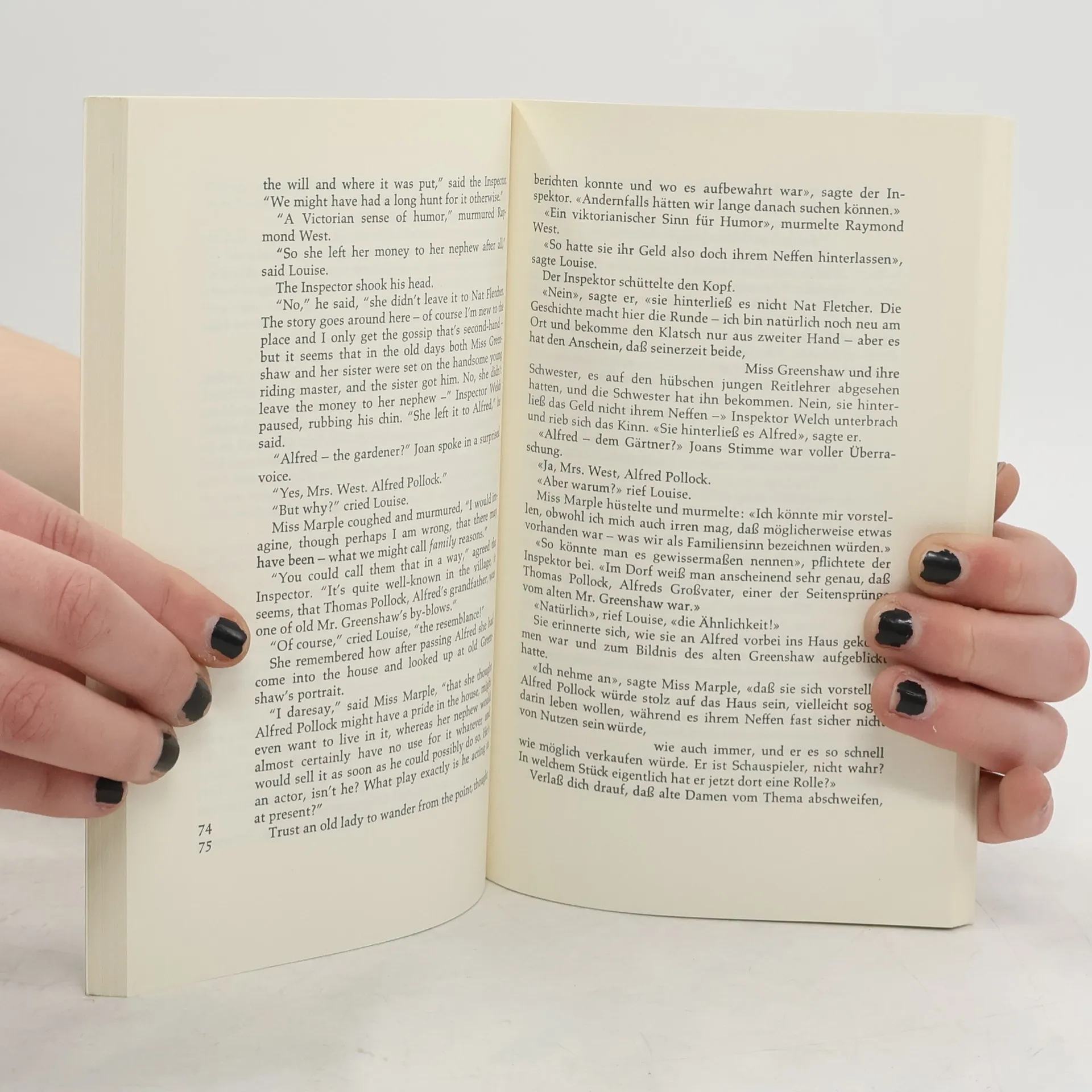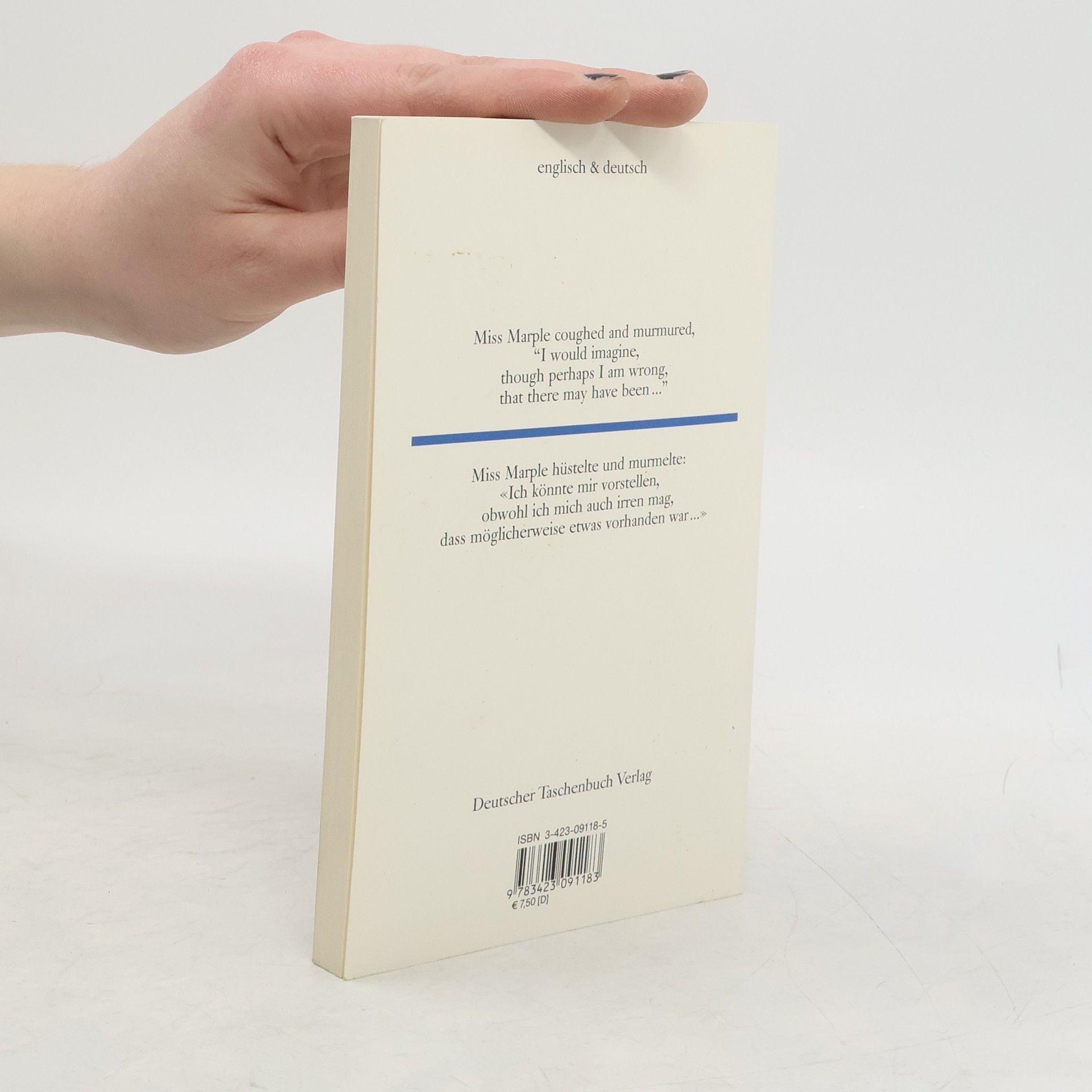 Dieser Band enthält in englisch-deutschem Paralleldruck drei Erzählungender Großmeisterin Agatha Christie (1890-1976), drei Kirminalfälle - nunja, der erste ist gerade eine Fingerübung für Hercule Poirot (warnend erhobenerZeigefinger für kleine Mädchen), unblutig ...in der zweiten geht es umein schaurig-schönes Schloß (und kein Alibi hindert Miss Marple daran,nachdenklich weiter zu hüsteln) ...in der dritten geht es - geht es umLe ... - geht es um Alix Martin, geb. King (und jedes weitere Wort wärehier schon zu viel).