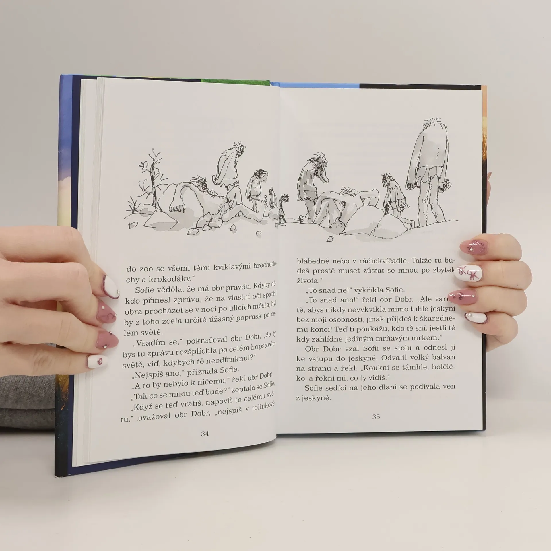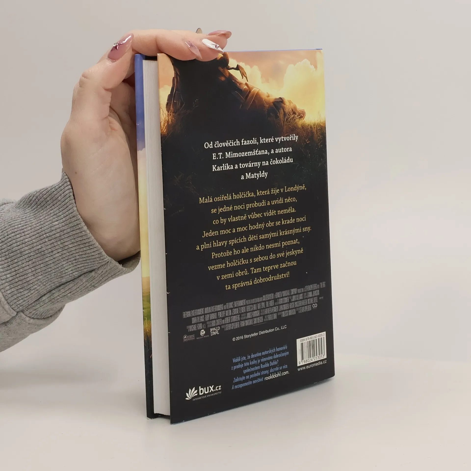 Malá osiřelá holčička, která žije v Londýně, se jedné noci probudí a uvidí něco, co by vlastně vůbec vidět neměla. Jeden moc a moc hodný obr se krade nocí a plní hlavy spících dětí samými krásnými sny. Protože ho ale nikdo nesmí poznat, vezme holčičku s sebou do své jeskyně v zemi obrů. Tam teprve začnou ta správná dobrodružství! Knihu zfilmoval Steven Spielberg. Stejnojmenný film přijde do českých kin 30.6.2016.
