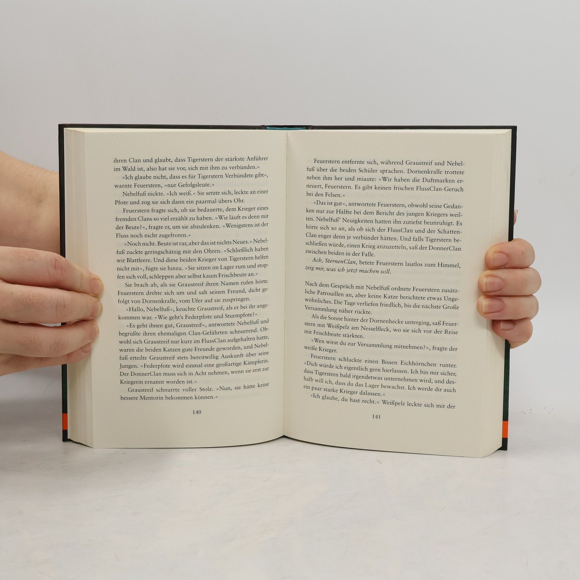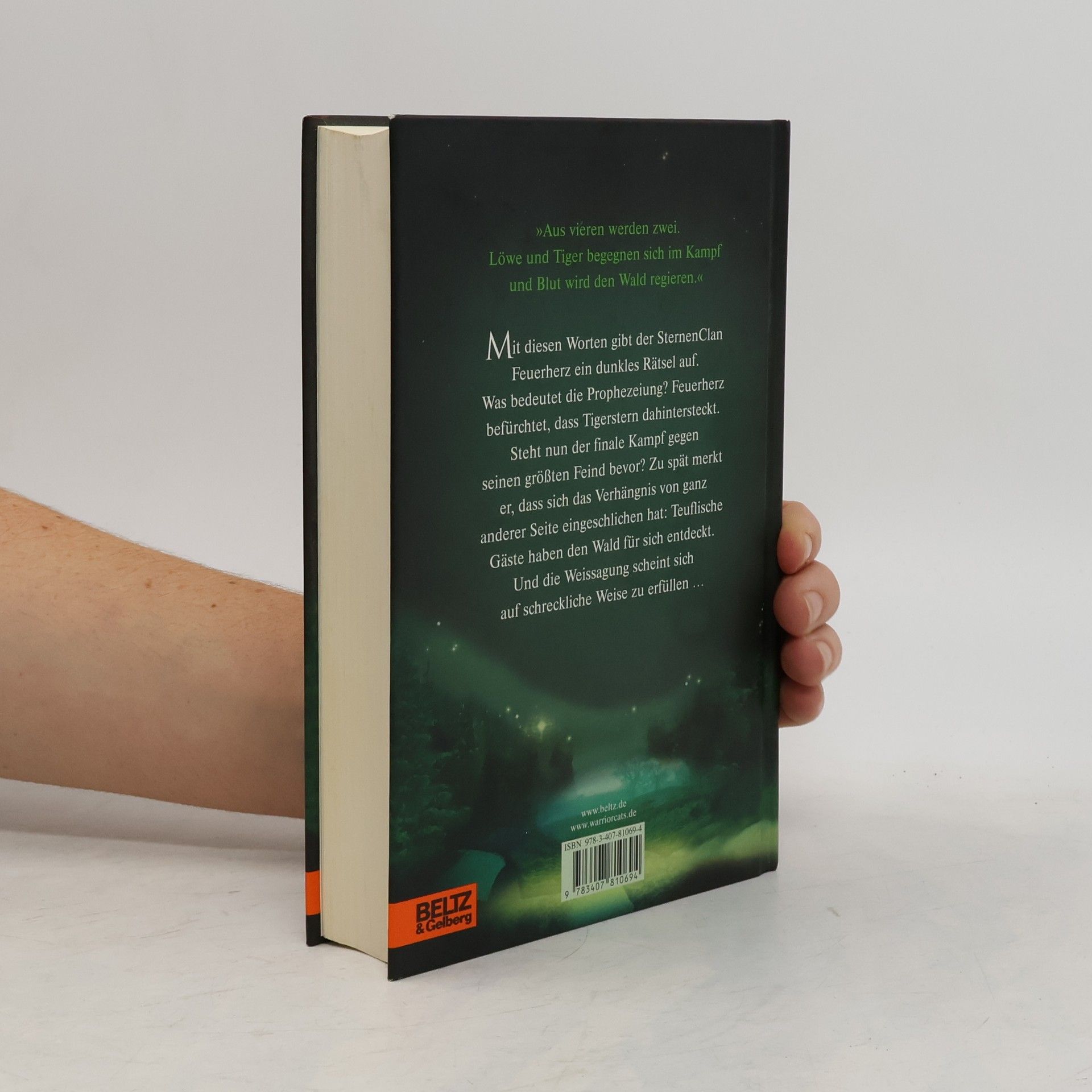 'Aus vieren werden zwei. Löwe und Tiger begegnen sich im Kampf und Blut wird den Wald regieren.' Mit diesen Worten gibt der SternenClan Feuerherz ein dunkles Rätsel auf. Was bedeutet die Prophezeiung? Feuerherz befürchtet, dass Tigerstern dahintersteckt. Steht nun der finale Kampf gegen seinen größten Feind bevor? Zu spät merkt er, dass sich das Verhängnis von ganz anderer Seite eingeschlichen hat: Teuflische Gäste haben den Wald für sich entdeckt. Und die Weissagung scheint sich auf schreckliche Weise zu erfüllen …