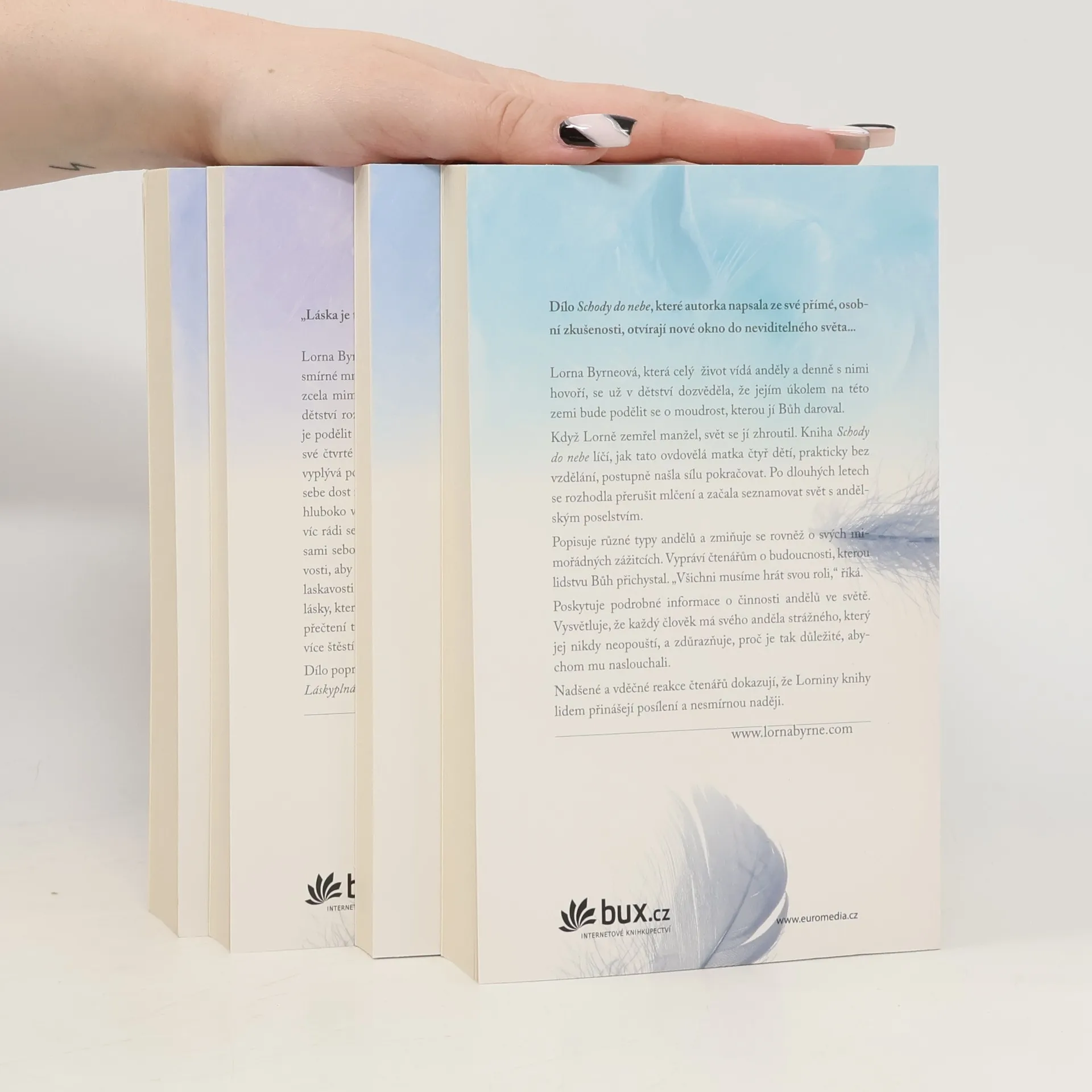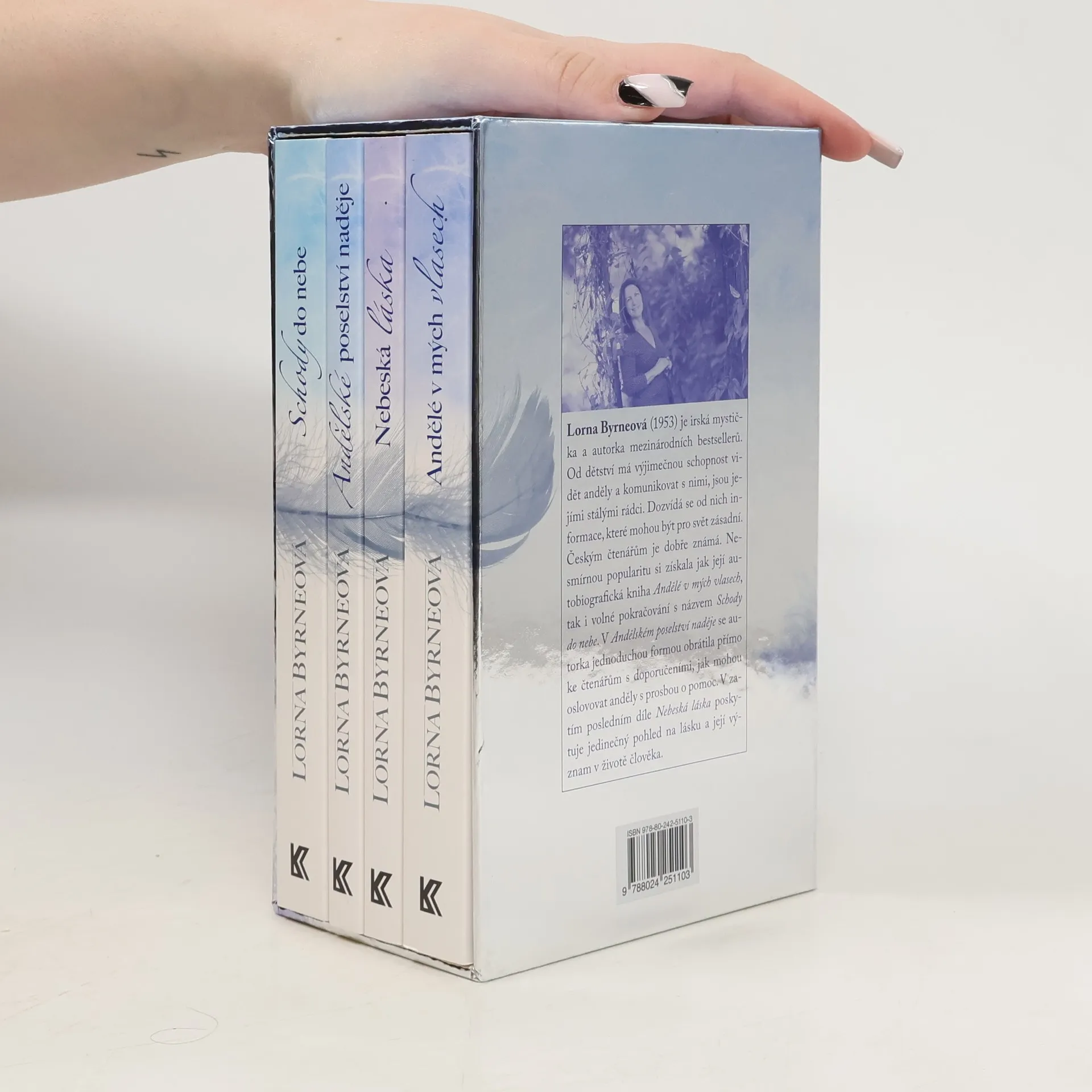 Lorna Byrneová (1953) je irská mystička a autorka mezinárodních bestsellerů. Od dětství má výjimečnou schopnost vidět anděly; po celý život se od nich dozvídá informace, které mohou být pro svět zásadní. Poprvé nyní vychází komplet všech jejích děl, obsahující autobiografickou knihu Andělé v mých vlasech, volné pokračování s názvem Schody do nebe, dále Andělské poselství naděje, v němž autorka radí, jak oslovovat anděly s prosbou o pomoc, a zatím poslední Nebeskou lásku, která je rozšířena o novou kapitolu Láskyplná stezka. Sedm dní, v nichž se naučíte mít víc rádi sami sebe. Čtenáře potěší i 8 andělských karet a pírko.