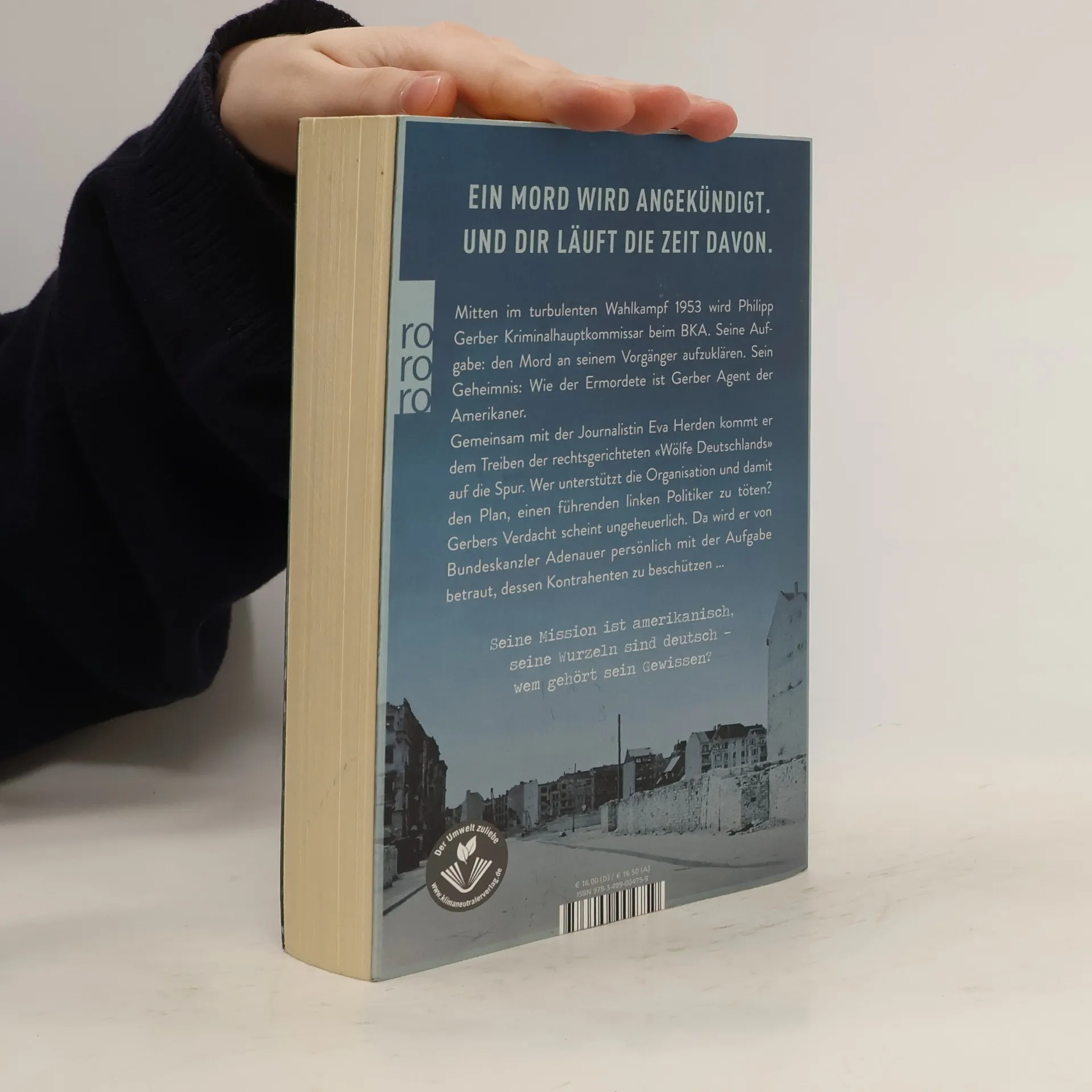 Die dunklen Geheimnisse einer jungen Demokratie. Die Entstehung des BKA. Das biedere Rheinland als Hitzekessel der Mächte, auf das der Schatten des Kalten Krieges fällt. Mitten im Wahlkampf 1953 wird Philipp Gerber Kriminalhauptkommissar beim BKA. Seine Aufgabe: den Mord an seinem Vorgänger aufzuklären. Sein Geheimnis: Wie der Ermordete ist Gerber Agent der Amerikaner. Gemeinsam mit der Journalistin Eva Herden findet er heraus, dass die rechtsgerichteten «Wölfe Deutschlands» noch aktiv sind. Um ein Zeichen gegen den Kommunismus setzen, wollen sie einen der führenden linken Politiker töten. Bundeskanzler Adenauer persönlich betraut Gerber mit der Aufgabe, seinen Kontrahenten zu beschützen …