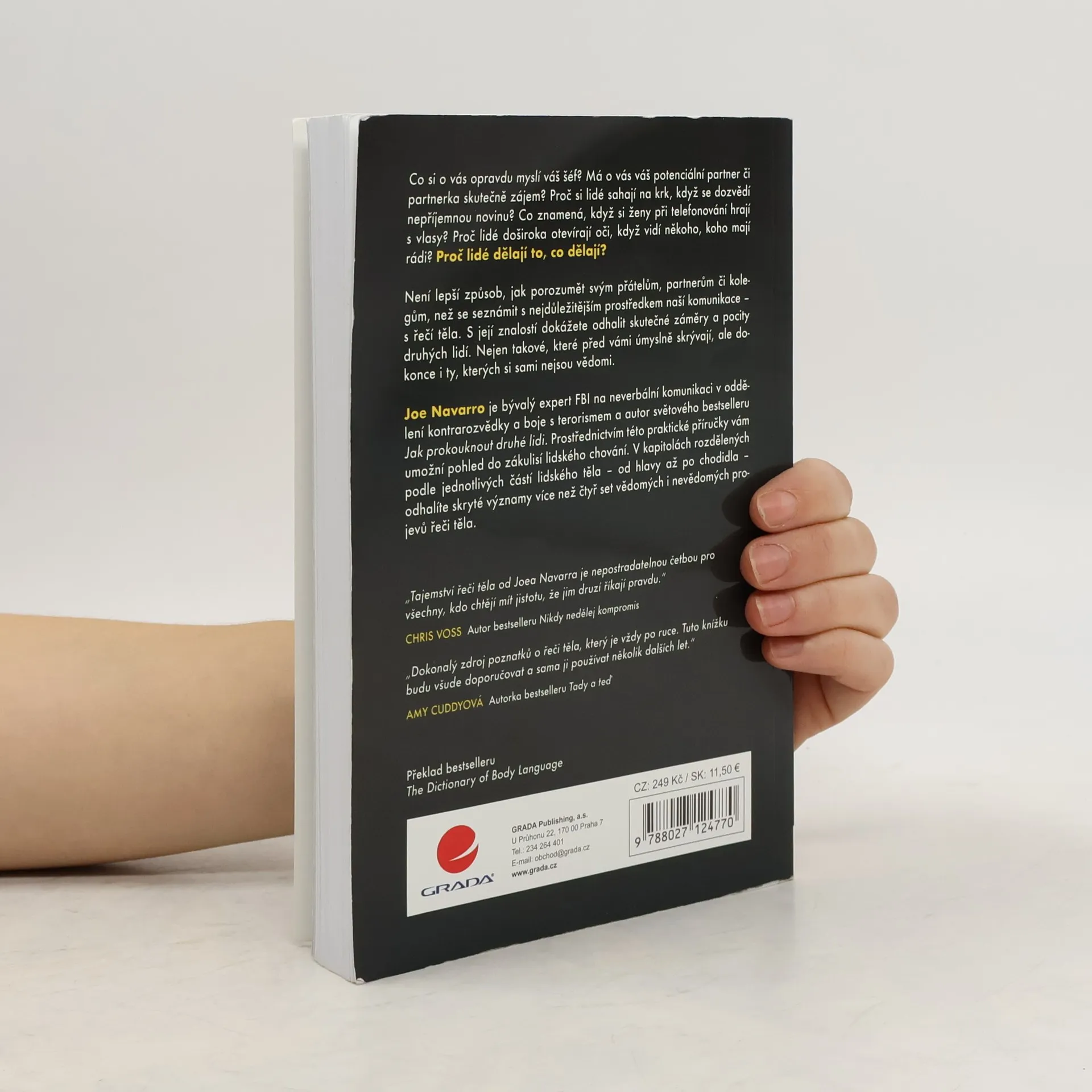 • Co si o vás opravdu myslí váš šéf? • Má o vás váš potenciální partner či partnerka skutečně zájem? • Proč si lidé sahají na krk, když se dozví nepříjemnou novinu? • Co znamená, když si ženy při telefonování hrají s vlasy? • Proč lidé doširoka otevírají oči, když vidí někoho, koho mají rádi? Proč lidé dělají to, co dělají? Není lepší způsob, jak porozumět svým přátelům, partnerům či kolegům, než se seznámit s nejdůležitějším prostředkem naší komunikace – s řečí těla. S její znalostí dokážete odhalit skutečné záměry a pocity druhých lidí. Nejen takové, které před vámi úmyslně skrývají, ale dokonce i ty, kterých si sami nejsou vědomi. Joe Navarro je bývalý expert FBI na neverbální komunikaci v oddělení kontrarozvědky a boje s terorismem a autor světového bestselleru Jak prokouknout druhé lidi. Prostřednictvím této praktické příručky vám umožní pohled do zákulisí lidského chování. V kapitolách rozdělených podle jednotlivých částí lidského těla – od hlavy až po chodidla – odhalíte skryté významy více než čtyř set vědomých i nevědomých projevů řeči těla.