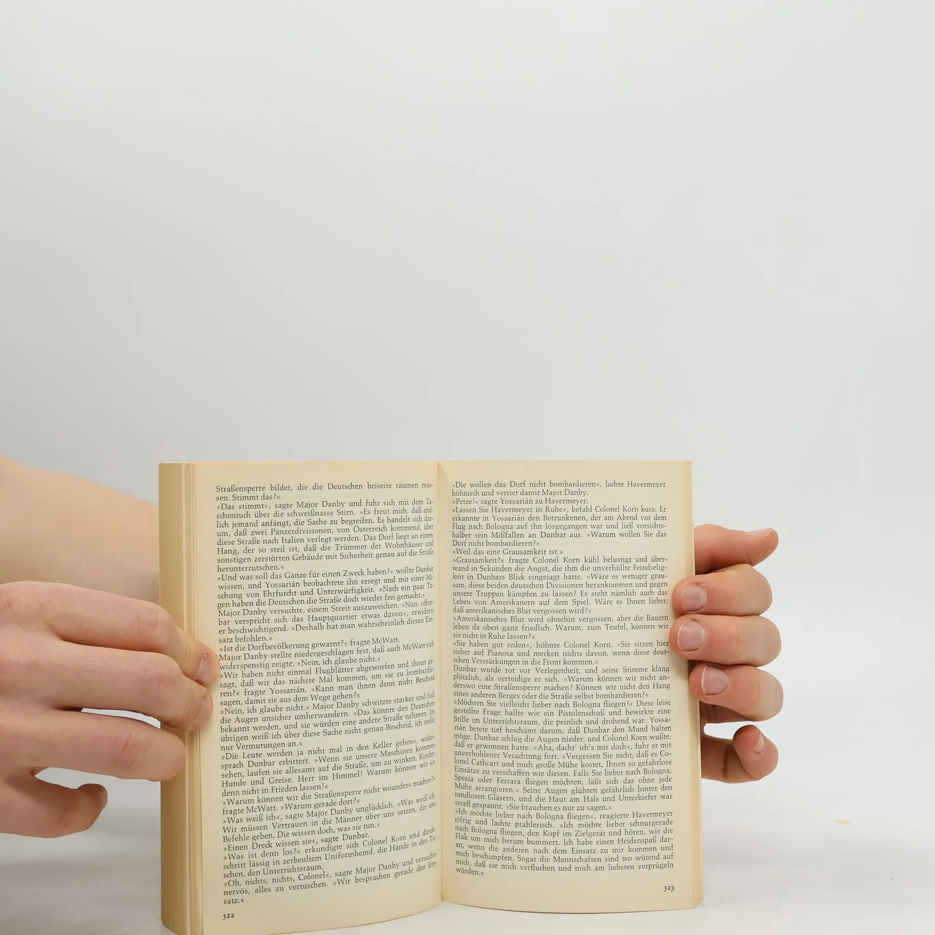"Catch 22, also Falle 22 oder Trick 22- das ist die ebenso irrsinnige wie ausweglose Dienstanweisung für das amerikanische Bombengeschwader, der zufolge Bomberpilot Yossarian nur dann von weiteren Einsätzen verschont bleibt, wenn er als verrückt anerkannt wird. Verrückt aber kann niemand sein, der sich weigern will, immer weitere großenteils sinnlose Einsätze zu fliegen. Also muß Yossarian ebenso wie seine Kameraden weiterfliegen, obwohl er sich die größte Mühe gibt, als verrückt zu erscheinen. Durch scheinbar absurdes Verhalten der militärischen Maschinerie ihre eigene Absurdität zu demonstrieren. Aber die Kriegsmaschinerie, gespeist aus persönlichem Ehrgeiz, Dummheit, Brutalität und Duckmäuserei, erkennt ihren eigenen Irrsinn nicht in dem Spiegel, den Yossarian - im Grunde der einzig Normale unter lauter Verrückten - vorhält." (fischer)