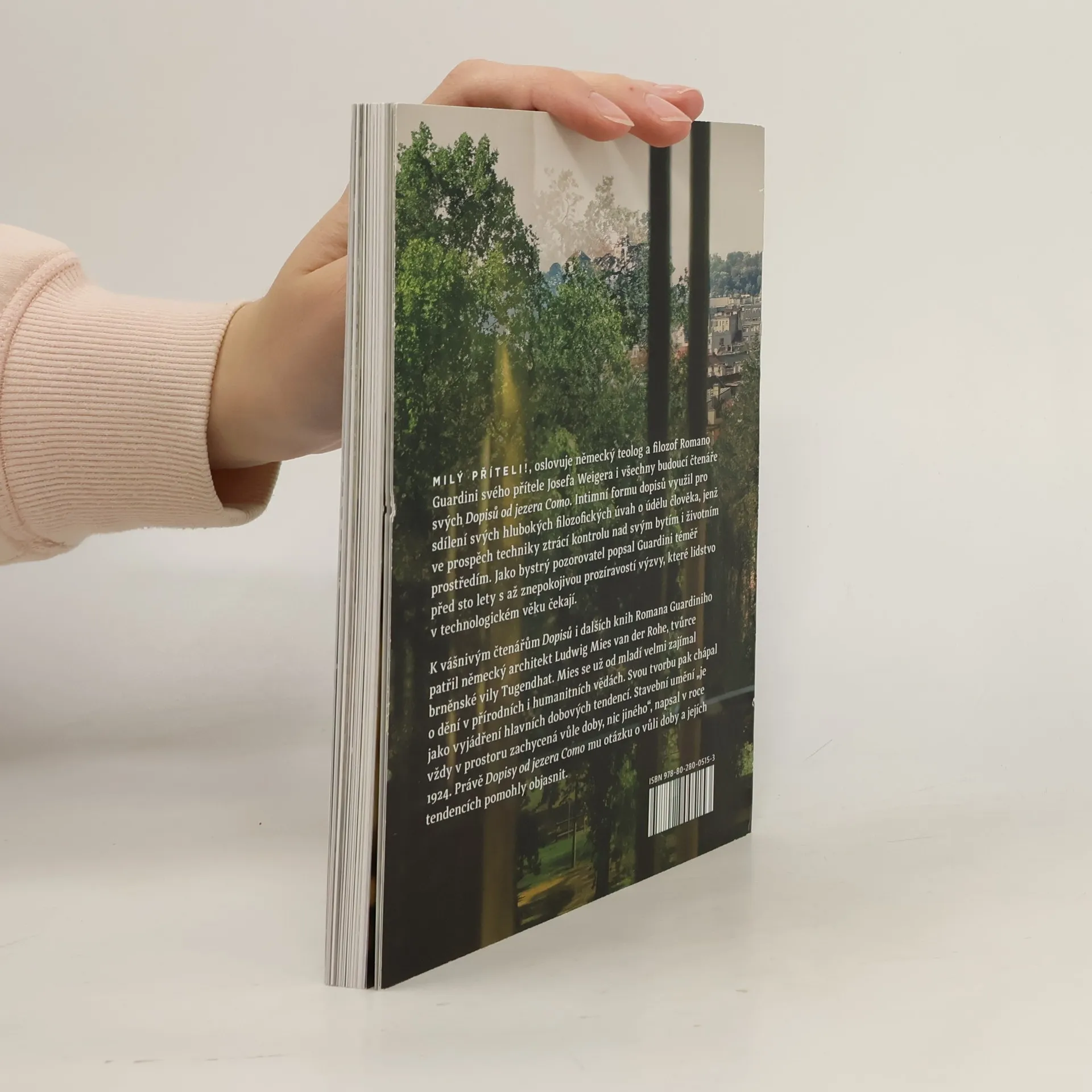 Milý příteli! , oslovuje německý teolog a filozof Romano Guardini svého přítele Josefa Weigera i všechny budoucí čtenáře svých Dopisů od jezera Como. Intimní formu dopisů využil pro sdílení svých hlubokých filozofických úvah o údělu člověka, jenž ve prospěch techniky ztrácí kontrolu nad svým bytím i životním prostředím. Jako bystrý pozorovatel popsal Guardini téměř před sto lety s až znepokojivou prozíravostí výzvy, které lidstvov technologickém věku čekají. K vášnivým čtenářům Dopisů i dalších knih Romana Guardiniho patřil německý architekt Ludwig Mies van der Rohe, tvůrce brněnské vily Tugendhat. Mies se už od mladí velmi zajímal o dění v přírodních i humanitních vědách. Svou tvorbu pak chápal jako vyjádření hlavních dobových tendencí. Stavební umění „je vždy v prostoru zachycená vůle doby, nic jiného“, napsal v roce 1924. Právě Dopisy od jezera Como mu otázku o vůli doby a jejích tendencích pomohly objasnit.