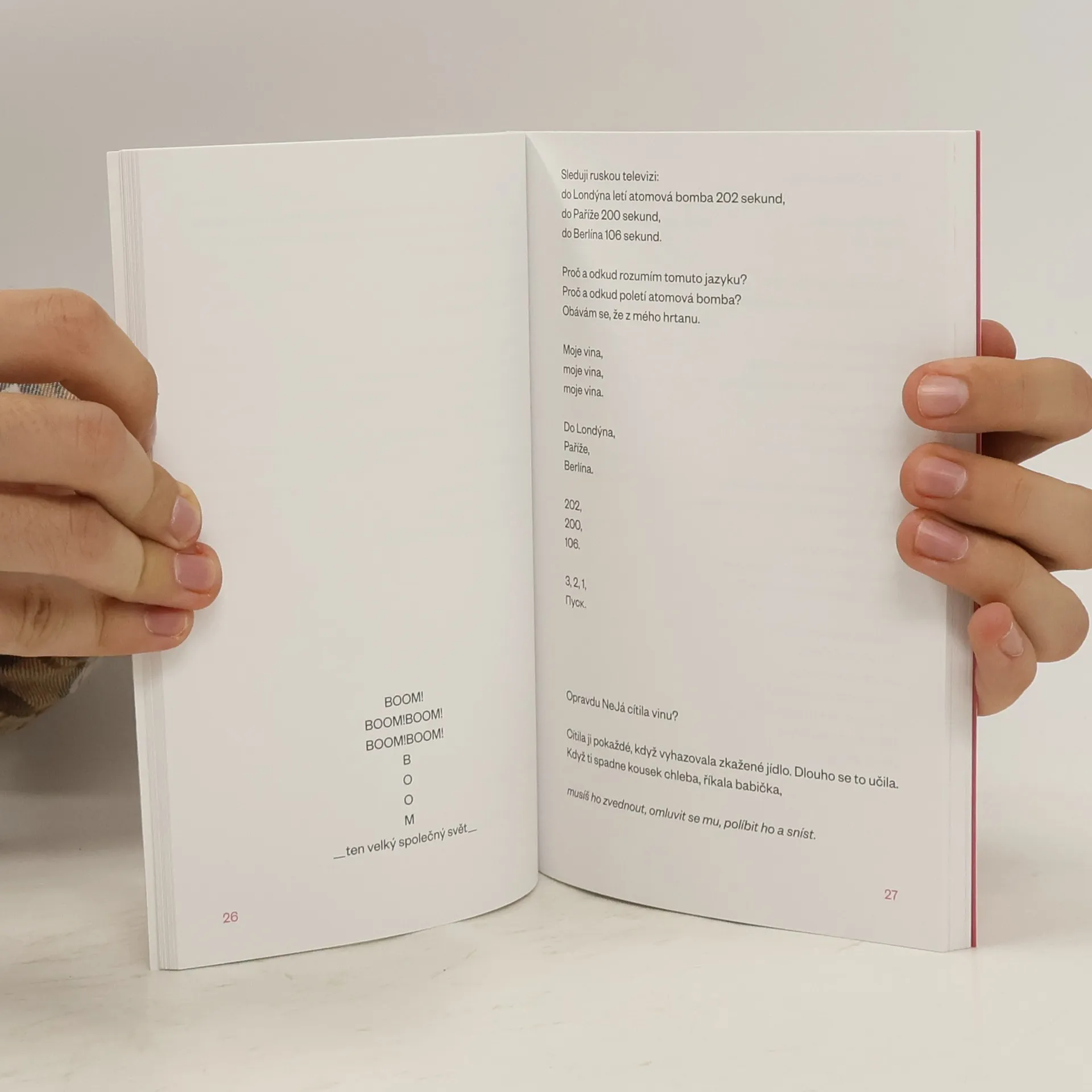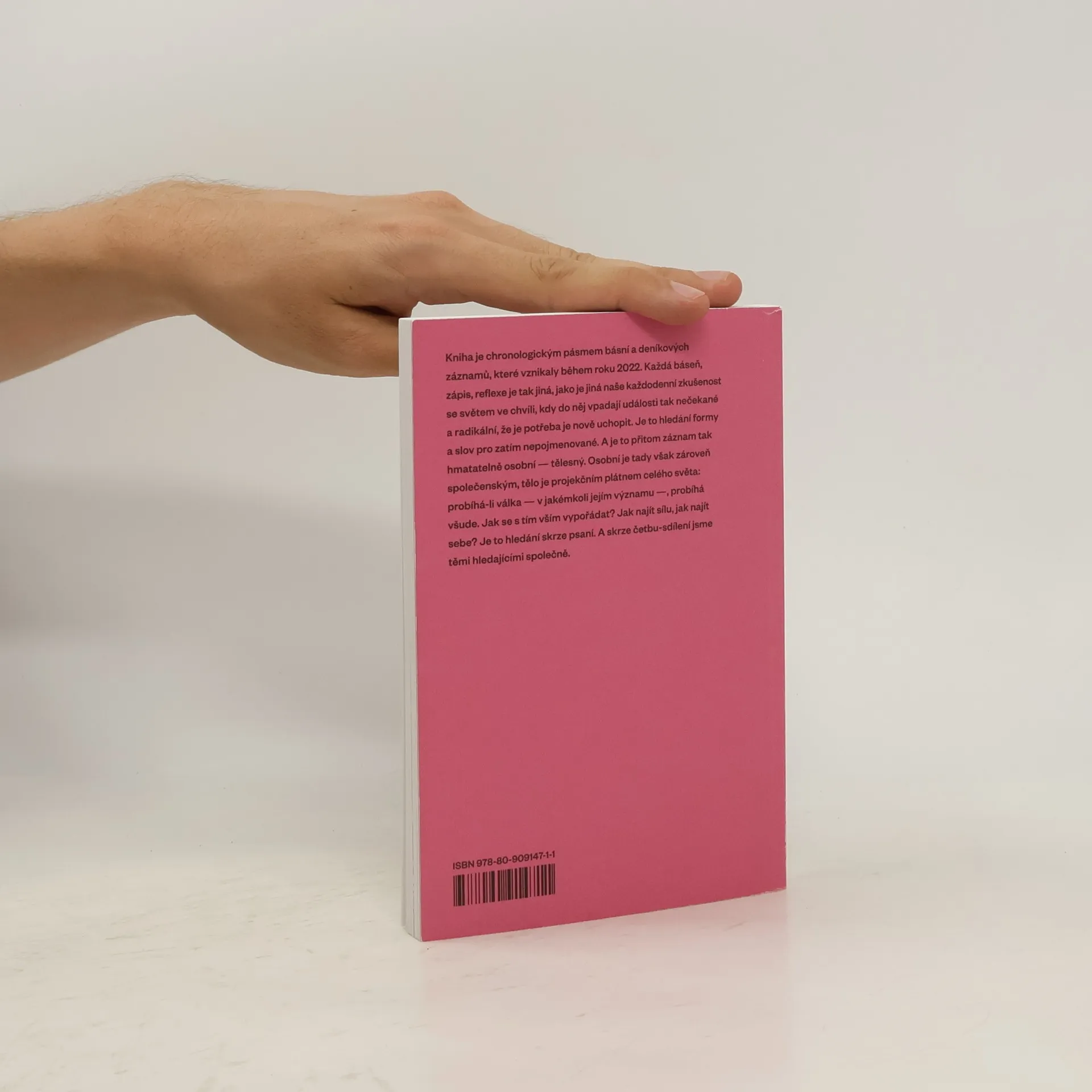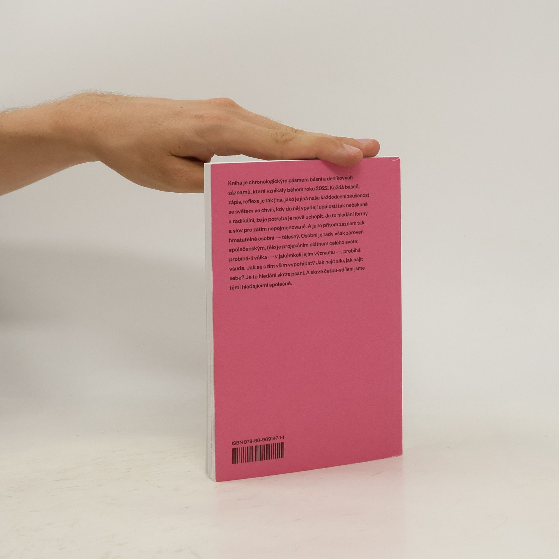 Kniha je chronologickým pásmem básní a deníkových záznamu, které vznikaly během roku 2022. Každá báseň, zápis, reflexe je tak jiná, jako je jiná naše každodenní zkušenost se světem ve chvíli, kdy do něj vpadají události tak nečekané a radikální, že je potřeba je nove uchopit. Je to hledání formy a slov pro zatím nepojmenované. A je to přitom záznam tak hmatatelné osobní — tělesný. Osobní je tady však zároveň společenským, tělo je projekčním plátnem celého světa: probíhá-li válka — v jakémkoli jejím významu —, probíhá všude. Jak se s tím vším vypořádat? Jak najít sílu, jak najít sebe? Je to hledání skrze psaní. A skrze četbu-sdílení jsme těmi hledajícími společně.