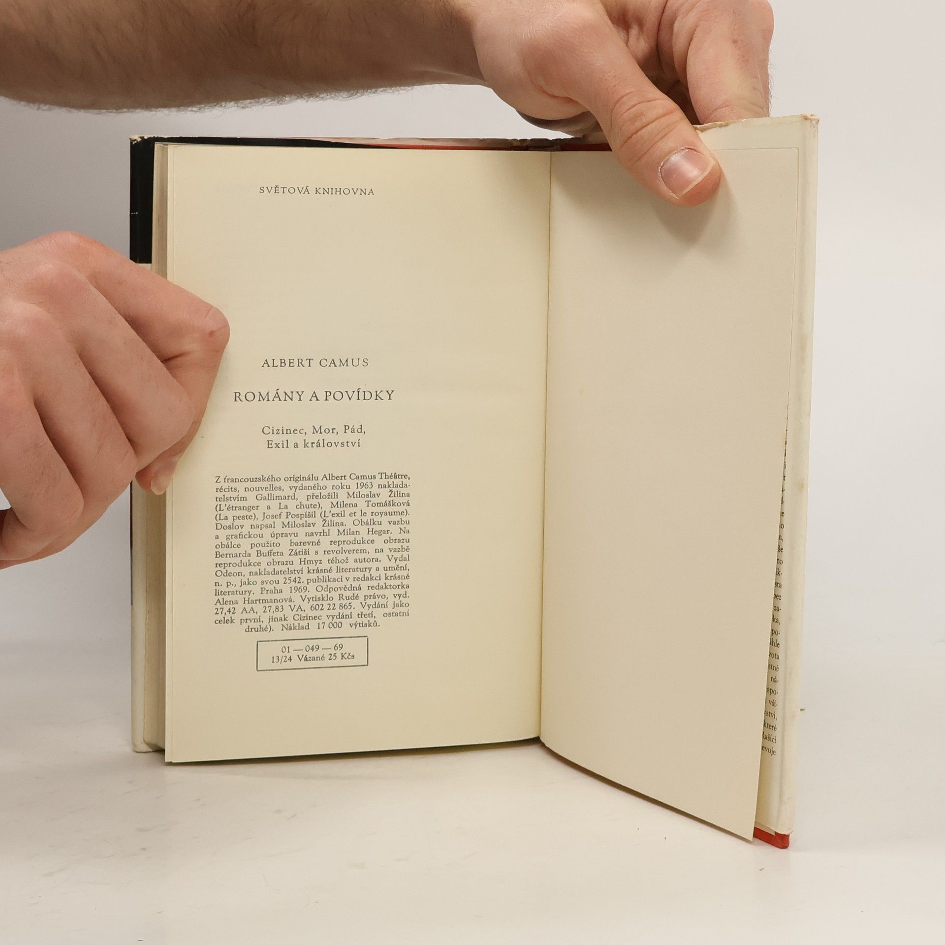 Svazek přináší Camusovy romány Cizinec (1942), Mor (1947), Pád (1956) a šest povídek ze sbírky Exil a království (1956; Cizoložnice, Odpadlík aneb zmatení mysli, Němí, Host, Jonáš aneb umělec při práci, Rašící kámen), z nichž každá má osobitou stylovou i myšlenkovou rovinu. Jeho beletristické dílo, shrnuté do jednoho svazku, dává tak čtenáři možnost proniknout do autorova světa a sledovat jeho vývoj.