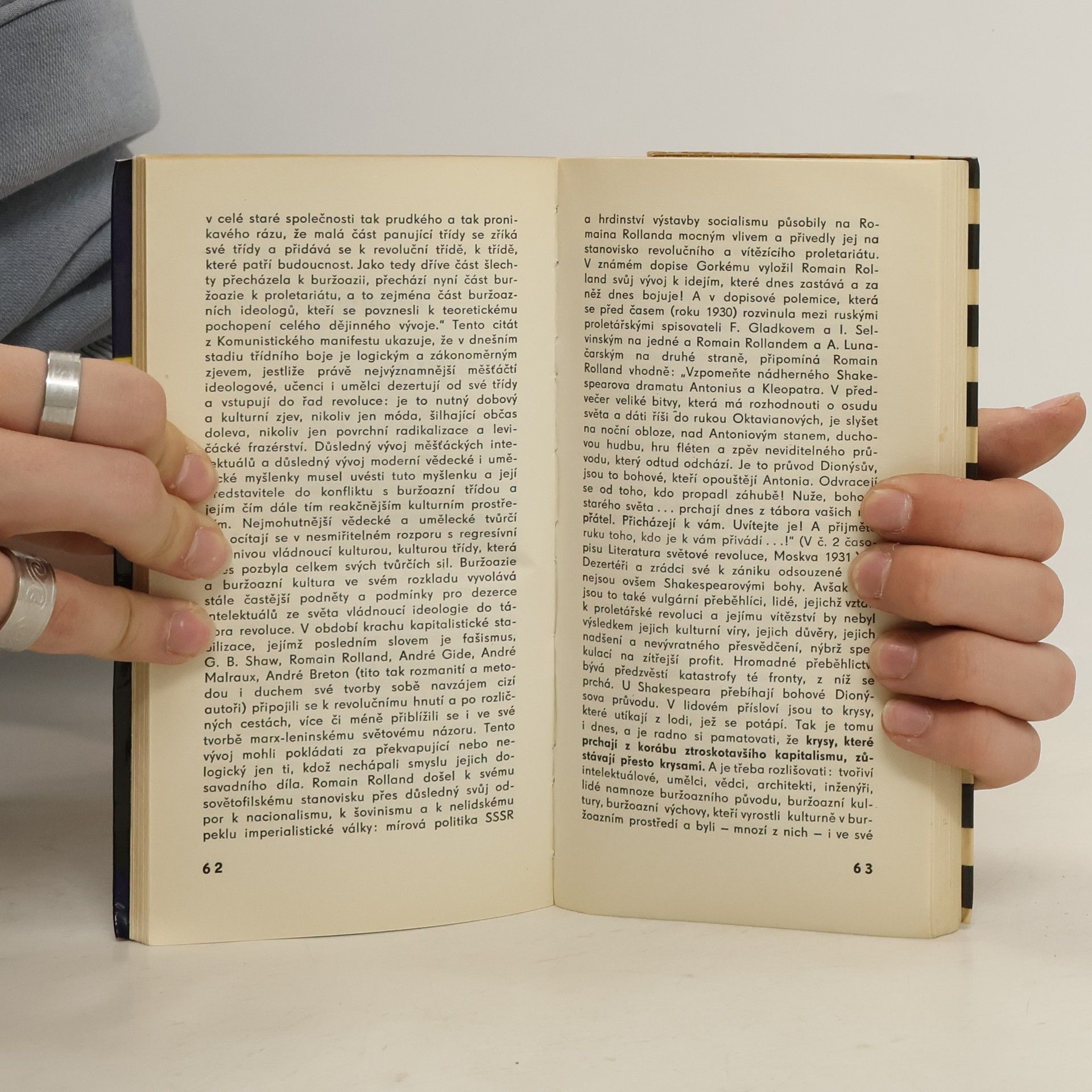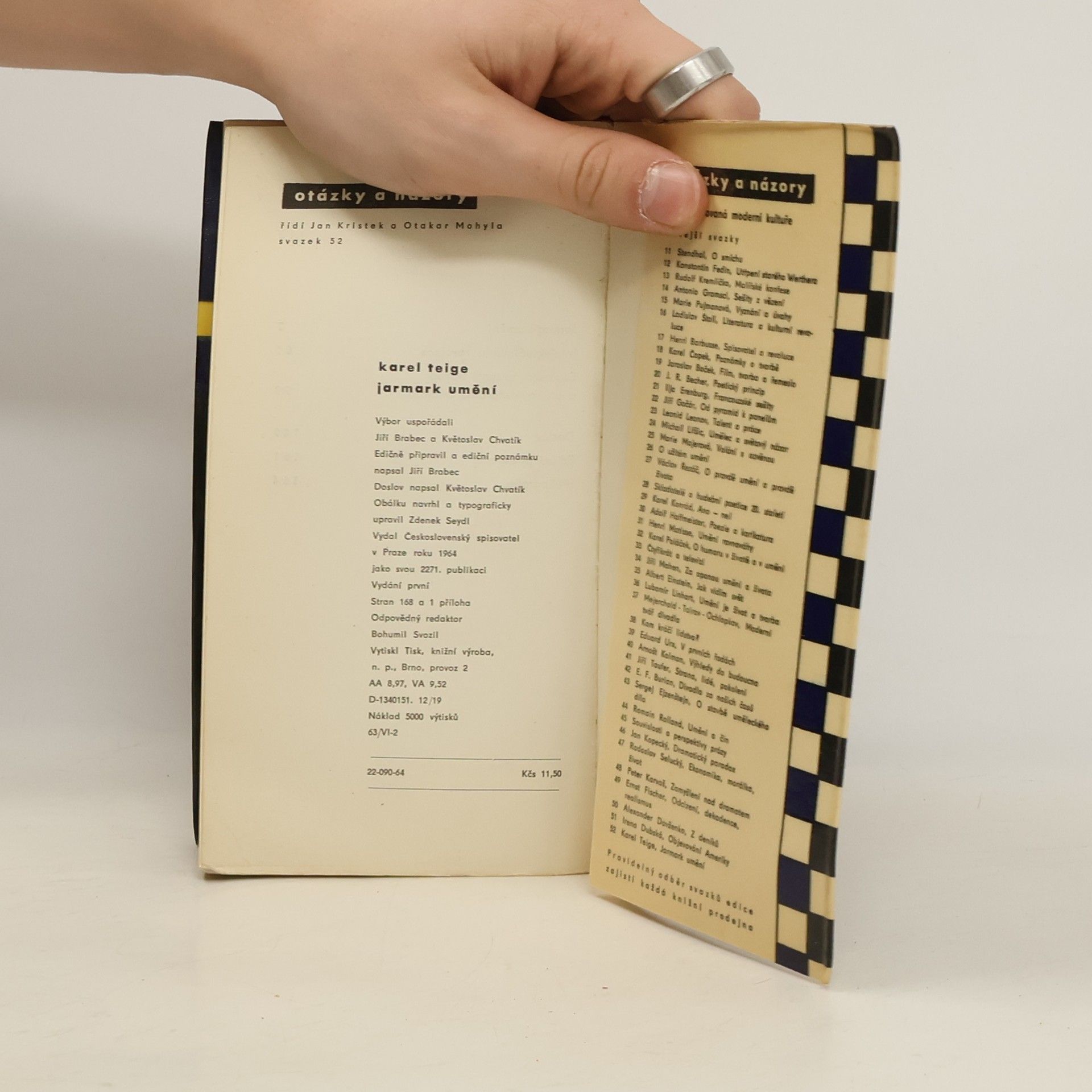 Z rozsáhlého díla význačného teoretika české meziválečné avantgardy a sociologa moderního umění jsou vybrány tři studie: „Jarmark umění“ o postavení umělce a funkci umění v kapitalistické společnosti, „Intelektuálové a revoluce“ o cestě buržoazní inteligence k socialismu a „Sovětská kulturní tvorba a otázky kulturního dědictví“, ve které bojuje jak proti podceňování kulturního dědictví, tak proti jeho fetišizaci.