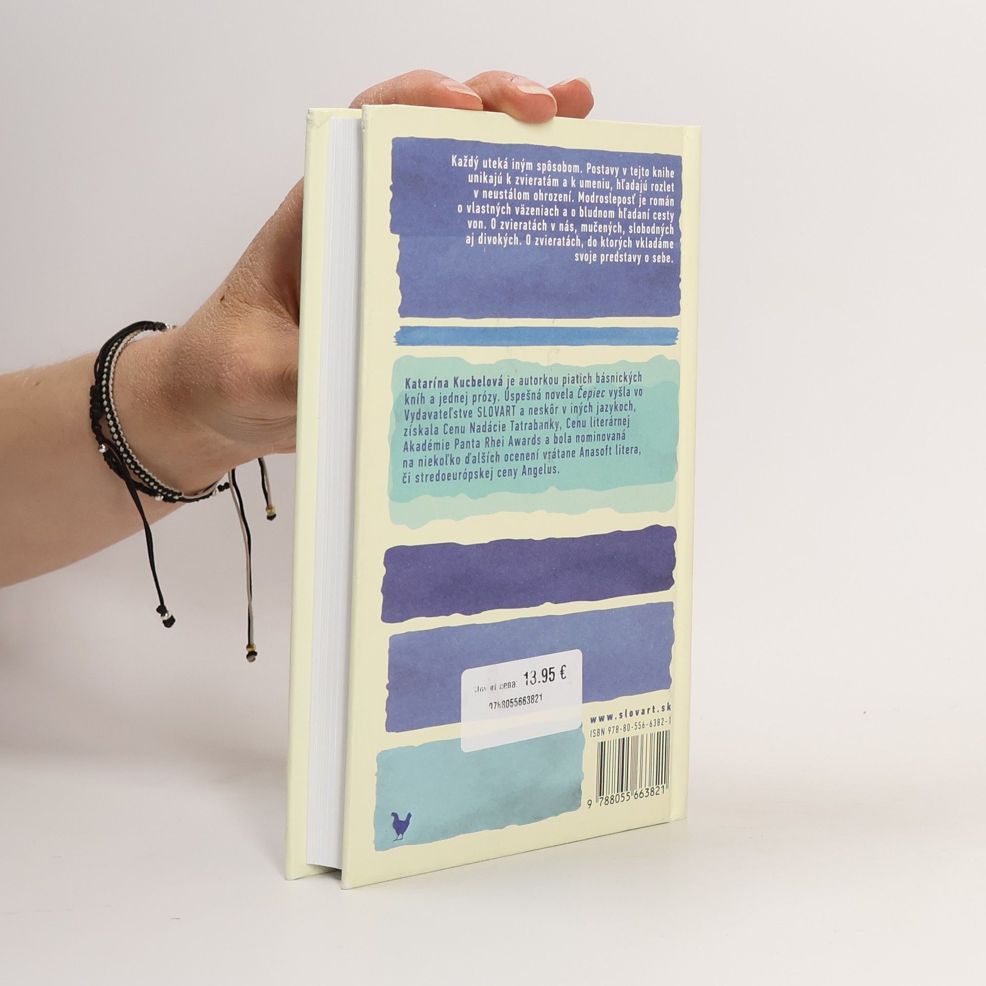 Každý uteká iným spôsobom. Postavy v tejto knihe unikajú k zvieratám a k umeniu, hľadajú rozlet v neustálom ohrození. Modrosleposť je román o vlastných väzeniach a bludnom hľadaní cesty von. O zvieratách v nás, mučených, slobodných aj divokých. O zvieratách, do ktorých vkladáme svoje predstavy o sebe.