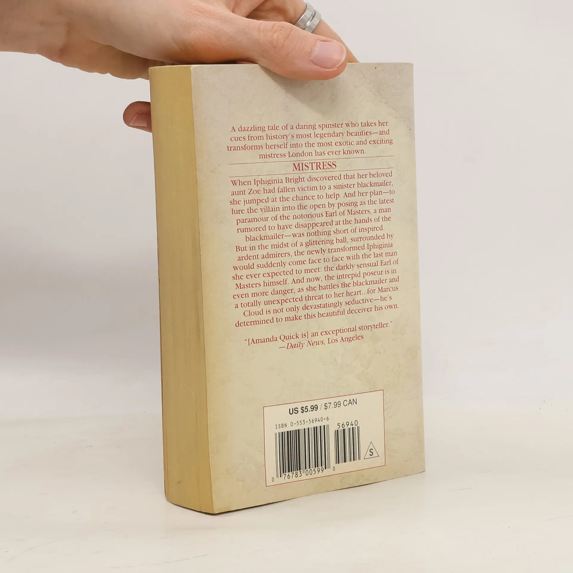 After a year of grand adventures touring the classical ruins of Italy and Greece, Iphiginia Bright returned to England to discover that the real excitement was at home. It seems that her Aunt Zoe has fallen victim to a sinister blackmailer and only Iphiginia can hope to stop the culprit before he can do more harm. Her plan is inspired: Imitating history's most legendary beauties--Cleopatra, Helen of Troy, Aphrodite--the former schoolmistress will remake herself, and descend upon London Society as the dazzling mistress of Marcus Valerius Cloud, the infamous Earl of Masters. Rumors hint that the Earl has disappeared at the blackmailer's hands, and by posing as his unknown mistress, Iphiginia is convinced she can ferret out the villain. Overnight, Iphiginia is transformed into a vision with a host of eager admirers, including one she does not expect -- the Earl of Masters himself, who strides into a shimmering ballroom one evening to cooly reclaim his "mistress". He is everything they say he is... arrogant, attractive, devastatingly seductive, and Iphiginia can't help but be enthralled. But when Marcus agrees to play along with her charade, she doesn't know that the determined earl has plans of his own: to tease and tempt her, until the beautiful deceiver becomes more than his mistress in name only.