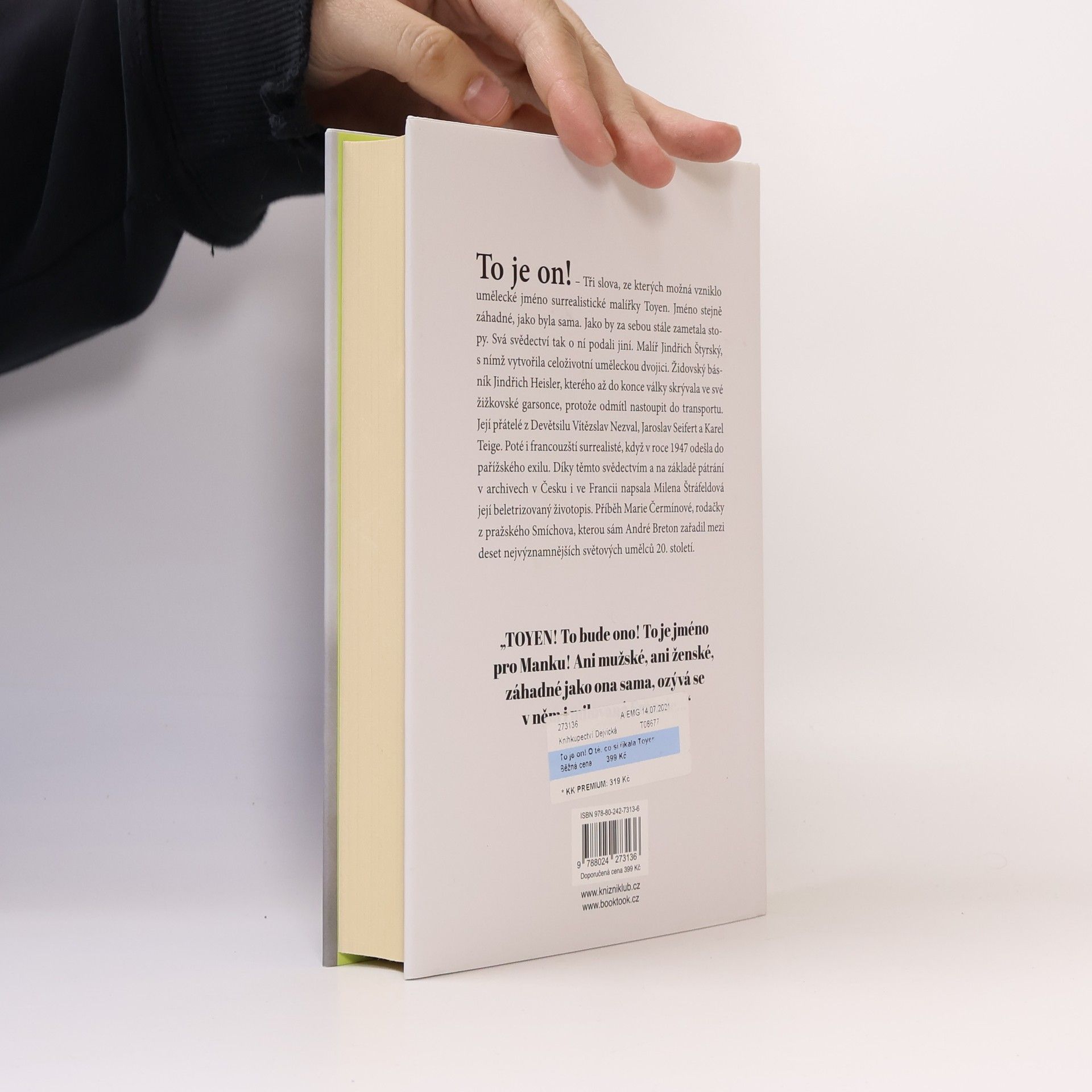 To je on! – Tři slova, ze kterých možná vzniklo umělecké jméno surrealistické malířky Toyen. Jméno stejně záhadné, jako byla sama. Jako by za sebou stále zametala stopy. Svá svědectví tak o ní podali jiní. Malíř Jindřich Štyrský, se kterým vytvořila celoživotní uměleckou dvojici. Židovský básník Jindřich Heisler, kterého až do konce války skrývala ve své žižkovské garsonce, protože odmítl nastoupit do transportu. Její přátelé z Devětsilu Vítězslav Nezval, Jaroslav Seifert nebo Karel Teige. Nebo francouzští surrealisté, když v r. 1947 odešla do pařížského exilu. Díky těmto svědectvím, ale i na základě pátrání v archivech v Česku a ve Francii, napsala Milena Štráfeldová její beletrizovaný životopis. Příběh Marie Čermínové, rodačky z pražského Smíchova, kterou sám André Breton zařadil mezi deset nejvýznamnějších světových umělců 20. století.