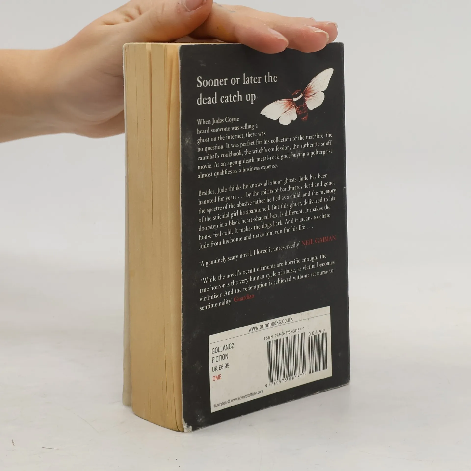 Aging, self-absorbed rock star Judas Coyne has a thing for the macabre -- his collection includes sketches from infamous serial killer John Wayne Gacy, a trepanned skull from the 16th century, a used hangman's noose, Aleister Crowley's childhood chessboard, etc. -- so when his assistant tells him about a ghost for sale on an online auction site, he immediately puts in a bid and purchases it. The black, heart-shaped box that Coyne receives in the mail not only contains the suit of a dead man but also his vengeance-obsessed spirit. The ghost, it turns out, is the stepfather of a young groupie who committed suicide after the 54-year-old Coyne callously used her up and threw her away. Now, determined to kill Coyne and anyone who aids him, the merciless ghost of Craddock McDermott begins his assault on the rocker's sanity.