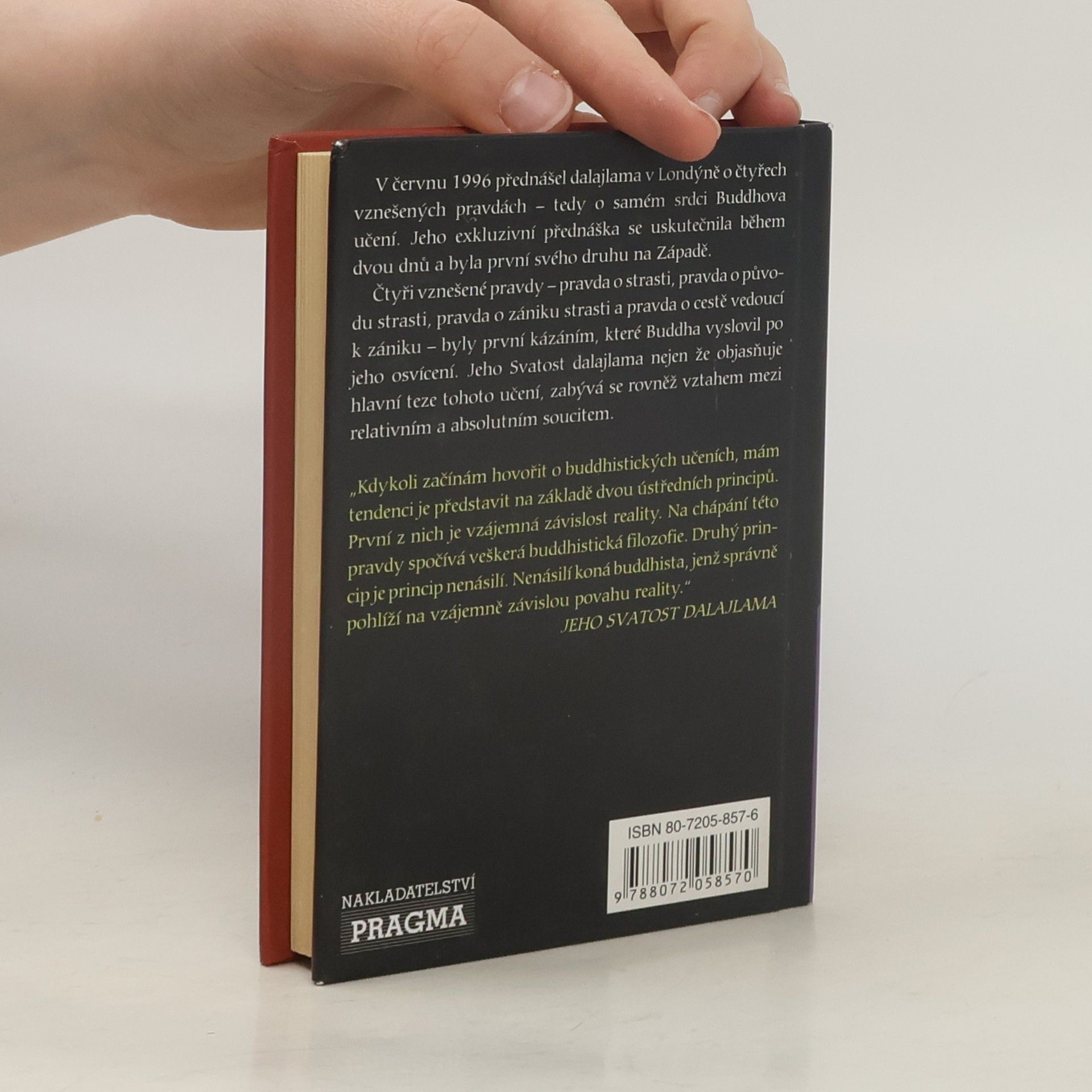 V červnu 1996 přednášel dalajlama v Londýně o čtyřech vznešených pravdách - tedy o samém srdci Buddhova učení. Jeho exkluzivní přednáška se uskutečnila během dvou dnů a byla první svého druhu na Západě. Čtyři vznešené pravdy - pravda o strasti, pravda o původu strasti, pravda o zániku strasti a pravda o cestě vedoucí k zániku - byly první kázáním, které Buddha vyslovil po jeho osvícení. Jeho Svatost dalajlama nejen že objasňuje hlavní teze tohoto učení, zabývá se rovněž vztahem mezi relativním a absolutním soucitem. "Kdykoli začínám hovořit o buddhistických učeních, mám tendenci je představit na základě dvou ústředních principů. První z nich je vzájemná závislost reality. Na chápání této pravdy spočívá veškerá buddhistická filozofie. Druhý princip je princip nenásilí. Nenásilí koná buddhista, jenž správně pohlíží na vzájemně závislou povahu reality." JEHO SVATOST DALAJLAMA