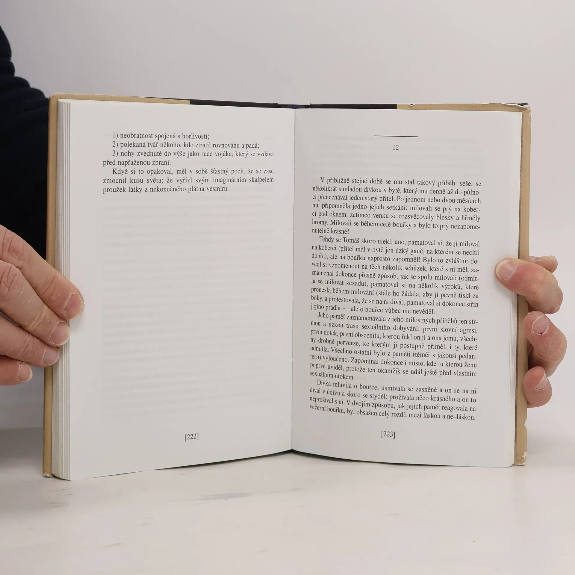 Slavný román Milana Kundery vychází poprvé v České republice; s obvyklou Poznámkou autora a s doslovem Květoslava Chvatíka. Poprvé vyšel ve francouzském překladu v roce 1984 v Paříži u Gallimarda, v roce 1985 česky v Kanadě v nakladatelství Sixty-Eight Publishers. Vyprávění o lásce, o Tereze a Tomášovi, o Sabině a Franzovi, o lehkosti a tíze bytí... „Po čtyřech letech strávených v Ženevě ubytovala se Sabina v Paříži a nemohla se vzpamatovat z melancholie. Kdyby se jí někdo ze ptal, co se jí stalo, nenašla by pro to slov. Životní drama se dá vždycky vyjádřit metaforou tíže. Říkáme, že na člověka dopadlo nějaké břemeno. Člověk to břemeno unese nebo neunese, padá pod ním, zápasí s ním, prohrává nebo vítězí. Ale co se vlastně stalo Sabině? Nic. Opustila jednoho muže, protože ho chtěla opustit. Pronásledoval ji pak? Mstil se jí? Ne. Její drama nebylo dramatem tíhy, ale lehkosti. Na Sabinu dopadlo nikoli břemeno, ale nesnesitelná lehkost bytí.“
