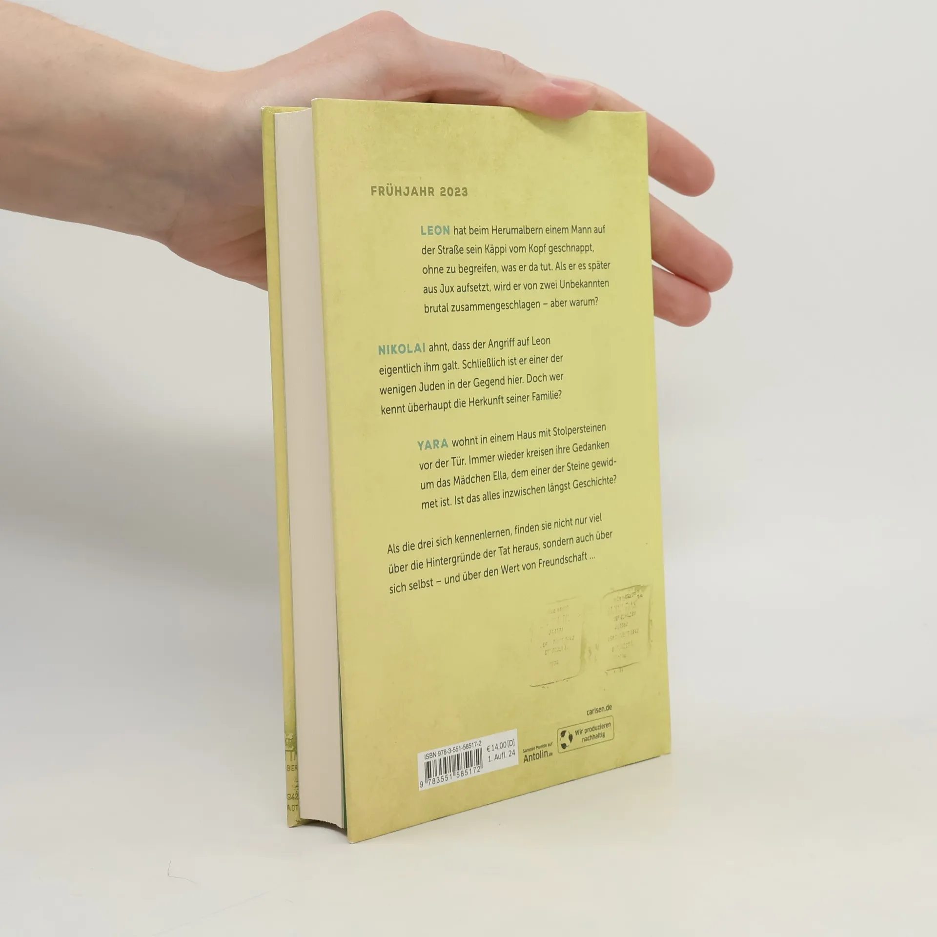 Frühjahr 2023: Leon hat beim Herumalbern einem Mann auf der Straße sein Käppi vom Kopf geschnappt, ohne zu begreifen, was er da tut. Als er es später aus Jux aufsetzt, wird er von zwei Unbekannten brutal zusammengeschlagen - aber warum? Nikolai ahnt, dass der Angriff auf Leon eigentlich ihm galt. Schließlich ist er einer der wenigen Juden in der Gegend hier. Doch wer kennt überhaupt die Herkunft seiner Familie? Yara wohnt in einem Haus mit Stolpersteinen vor der Tür. Immer wieder kreisen ihre Gedanken um das Mädchen Ella, dem einer der Steine gewidmet ist. Ist das alles inzwischen längst Geschichte? Als die drei sich kennenlernen, finden sie nicht nur viel über die Hintergründe der Tat heraus, sondern auch über sich selbst - und über den Wert von Freundschaft ....