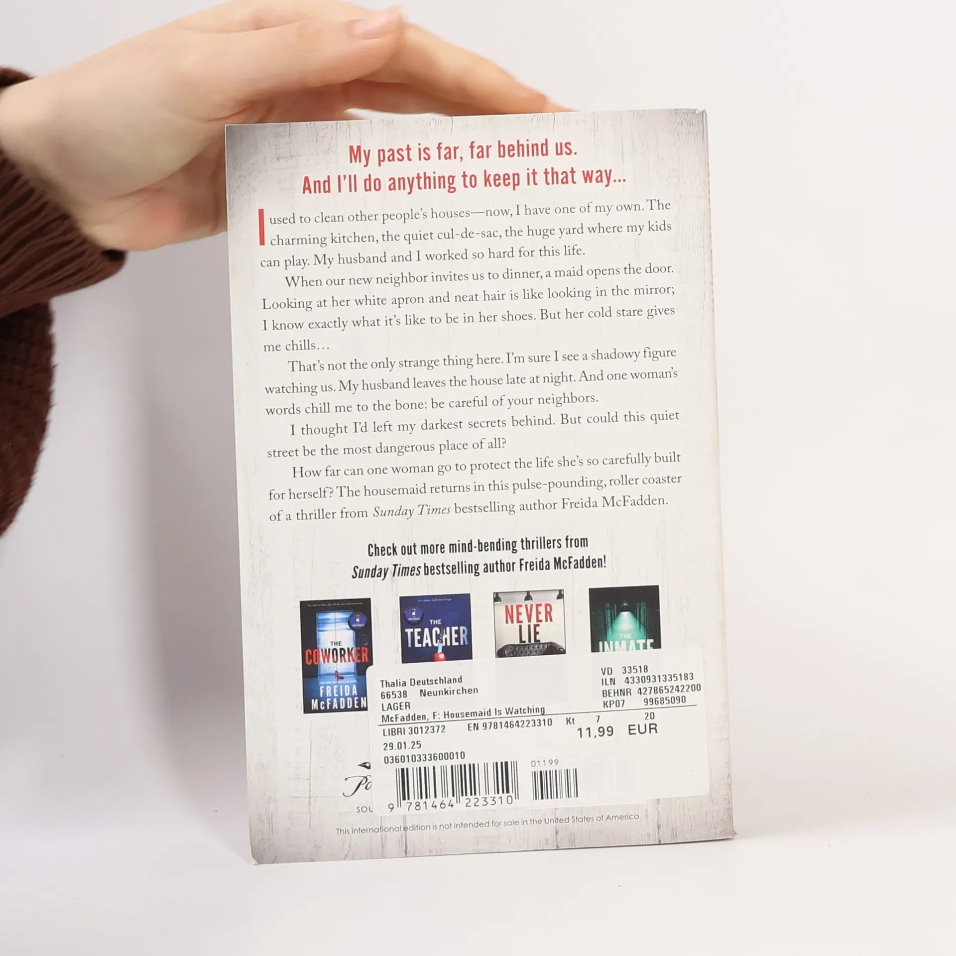 A twisting, pulse-pounding thriller from Freida McFadden, the New York Times bestselling author of The Housemaid and The CoworkerYou must be our new neighbors! Mrs. Lowell gushes and waves across the picket fence. I clutch my daughter's hand and smile back: but the second Mrs. Lowell sees my husband a strange expression crosses her face. In that moment I make a promise. We finally have a family home. My past is far, far behind us. And I'll do anything to keep it that way...I used to clean other people's houses-now, I can't believe this home is actually mine. The charming kitchen, the quiet cul- de-sac, the huge yard where my kids can play. My husband and I saved for years to give our children the life they deserve.Even though I'm wary of our new neighbor Mrs. Lowell, when she invites us over for dinner it's our chance to make friends. Her maid opens the door wearing a white apron, her hair in a tight bun. I know exactly what it's like to be in her shoes. But her cold stare gives me chills...The Lowells' maid isn't the only strange thing on our street. I'm sure I see a shadowy figure watching us. My husband leaves the house late at night. And when I meet a woman who lives across the way, her words chill me to the bone: Be careful of your neighbors.Did I make a terrible mistake moving my family here?I thought I'd left my darkest secrets behind. But could this quiet suburban street be the most dangerous place of all?