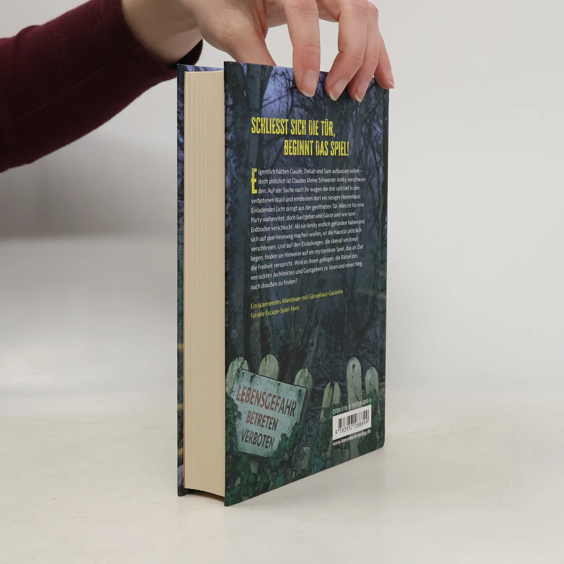 Kannst du das Rätsel lösen und aus dem Haus entkommen? Eigentlich hätten Claude, Deliah und Sam aufpassen sollen – doch plötzlich ist Claudes kleine Schwester Amity verschwunden. Auf der Suche nach ihr wagen sich die drei tief in den verbotenen Wald, in dem schon viele Kinder verschwunden sind, und entdecken dort Manvers Hall, ein riesiges Herrenhaus. Alles ist für eine Party vorbereitet und die Gäste müssten jederzeit eintreffen. „Wenn sich die Tür schließt, beginnt das Spiel!“, steht auf der Einladung – und tatsächlich müssen die Kinder bald feststellen, dass die Türen verschlossen sind und sie das Haus nicht verlassen können. Sie können nur entkommen, wenn es ihnen gelingt, die Rätsel des verrückten Architekten des Hauses zu lösen. Doch wie soll das gehen, wenn der schon seit neunzig Jahren tot ist und das Haus nur noch von Geistern bewohnt wird? Wird es Deliah, Claude, Sam und Amity gelingen, dem Haus zu entkommen? Ein nervenaufreibender Jugendthriller voller Rätsel und überraschender Wendungen, den du nicht mehr aus der Hand legen wirst. Für alle Fans von Escape-Rooms und Exit-Games!