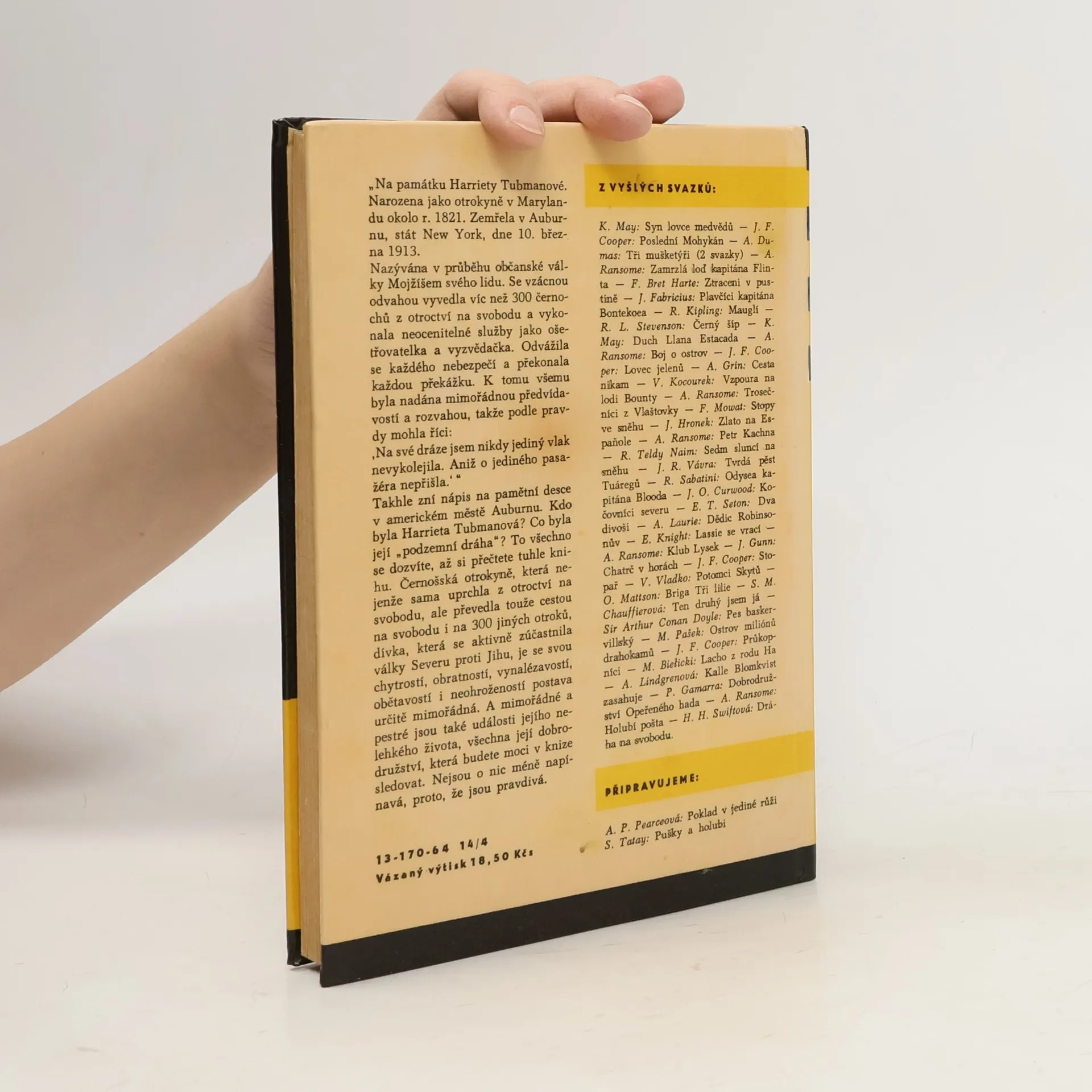 Na památku Harriety Tubmanové. Narozena jako otrokyně v Marylandu okolo r. 1821. Zemřela v Auburnu stát New York, dne 10. března 1913. Nazývána v průběhu občanské války Mojžíšem svého lidu. Se vzácnou odvahou vyvedla víc než 300 černochů z otroctví na svobodu a vykonala neocenitelné službyjako ošetřovatelka a vyzvědačka. Odvážila se každého nebezpečí a překonala každou překážku. K tomu všemu byla nadána mimořádnou předvídavostí a rozvahou, takže podle pravdy mohla říci: „Na své dráze jsem nikdy jediný vlak nevykolejila. Aniž o jediného pasažéra nepřišla.“ Takhle zní nápis na pamětní desce v americkém městě Auburnu. Kdo byla Harrieta Tubmanová? Co byla její „podzemní dráha" ? To všechno se dozvíte, až si přečtete tuhle knihu. Černošská otrokyně, která nejenže sama uprchla z otroctví na svobodu, ale převedla stejnou cestou na svobodu i na 300 jiných otroků, dívka, která se aktivně zúčastnila války Severu proti Jihu, je se svou chytrostí, obratností, vynalézavostí, obětavostí i neohrožeností postava určitě mimořádná. A mimořádně a pestré jsou také události jejího nelehkého života, všechna její dobrodružství, která budete moci v knize sledovat. Nejsou o nic méně napínavá, proto, že jsou pravdivá. (V