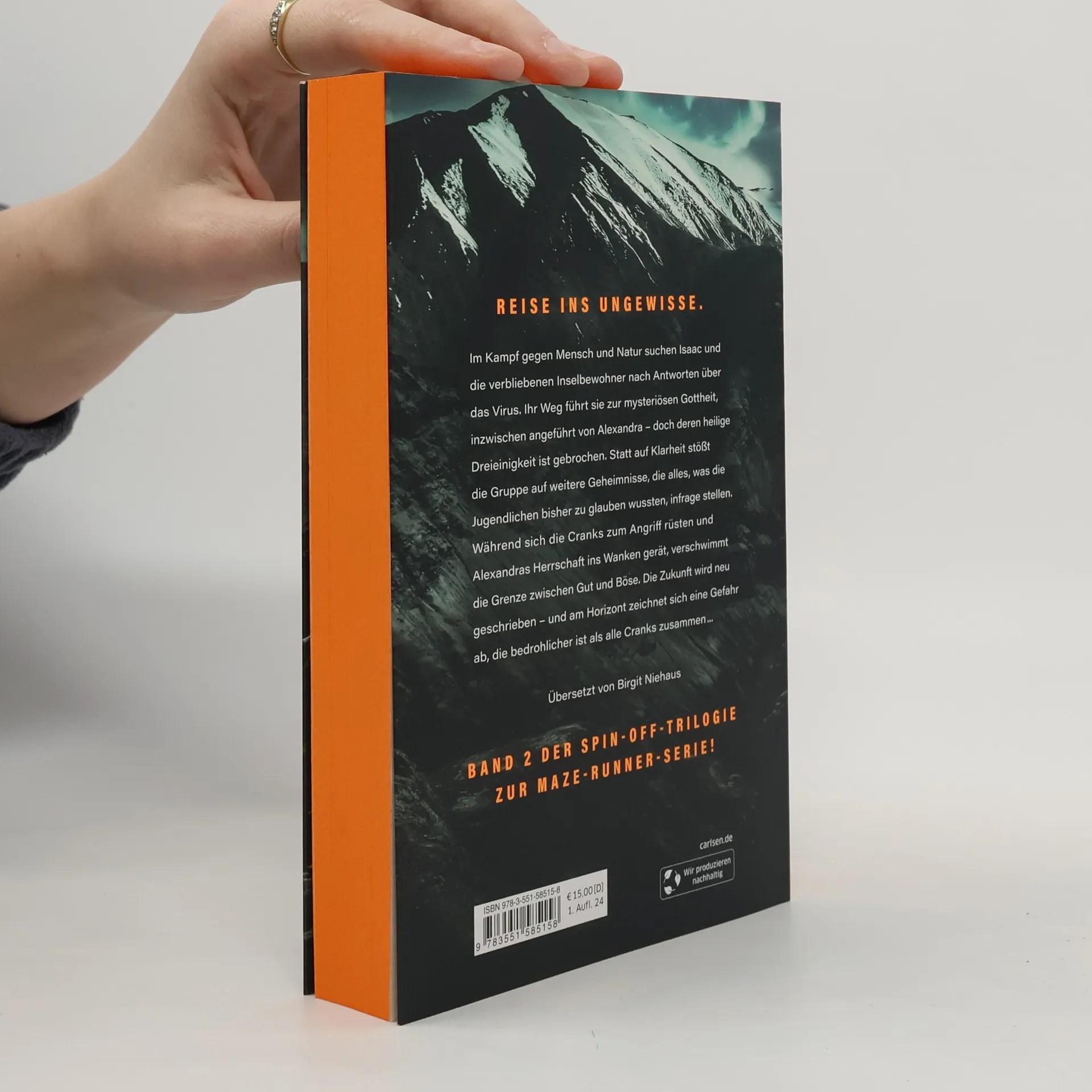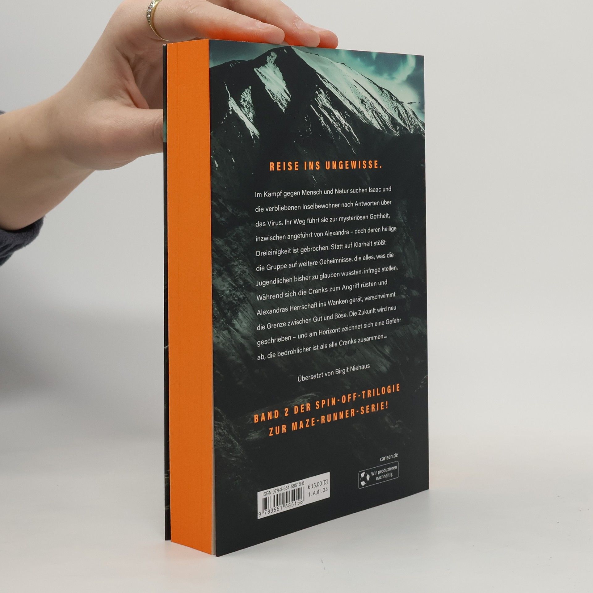 Gefährliche Reise ins Ungewisse Im Kampf gegen Mensch und Natur suchen Isaac und die Inselbewohner nach Antworten. Ihr Weg führt sie zur Gottheit – doch die Dreieinigkeit ist gebrochen. Statt auf Klarheit, stößt die Gruppe auf weitere Geheimnisse, die alles, was die Jugendlichen bisher zu glauben wussten, hinterfragen lassen. Während sich die Cranks zum Angriff rüsten und Alexandras Herrschaft ein vorschnelles Ende nimmt, verschwimmt die Grenze zwischen Gut und Böse. Die Zukunft wird neu geschrieben – und am Horizont zeichnet sich eine Gefahr ab, die bedrohlicher ist als alle Cranks zusammen. Band 2 der Spin-off-Trilogie zur MAZE-RUNNER-SERIE!