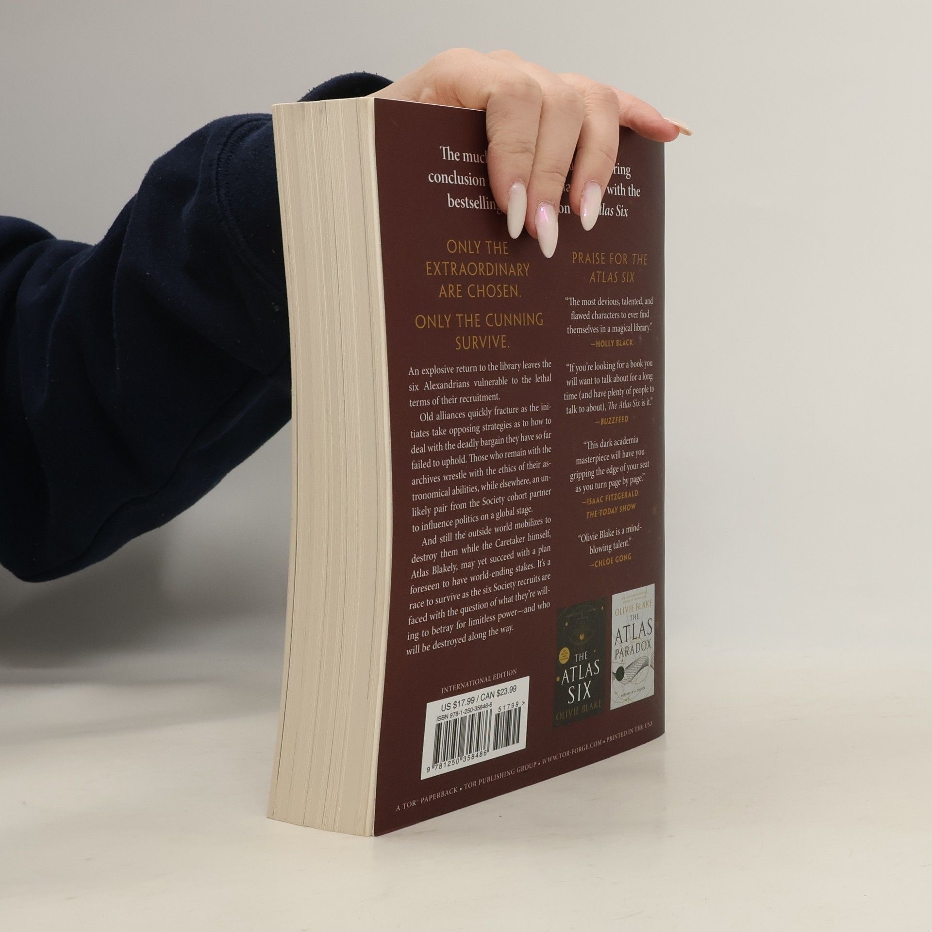 The Atlas Complex marks the much-anticipated, heart-shattering conclusion in Olivie Blake's trilogy that began with the New York Times bestselling phenomenon, The Atlas Six .Only the extraordinary are chosen.Only the cunning survive.An explosive return to the library leaves the six Alexandrians vulnerable to the lethal terms of their recruitment.Old alliances quickly fracture as the initiates take opposing strategies as to how to deal with the deadly bargain they have so far failed to uphold. Those who remain with the archives wrestle with the ethics of their astronomical abilities, while elsewhere, an unlikely pair from the Society cohort partner to influence politics on a global stage.And still the outside world mobilizes to destroy them, while the Caretaker himself, Atlas Blakely, may yet succeed with a plan foreseen to have world-ending stakes. It’s a race to survive as the six Society recruits are faced with the question of what they're willing to betray for limitless power―and who will be destroyed along the way.Also by Olivie BlakeThe Atlas SixThe Atlas ParadoxAlone with You in the EtherOne for My EnemyMasters of Death