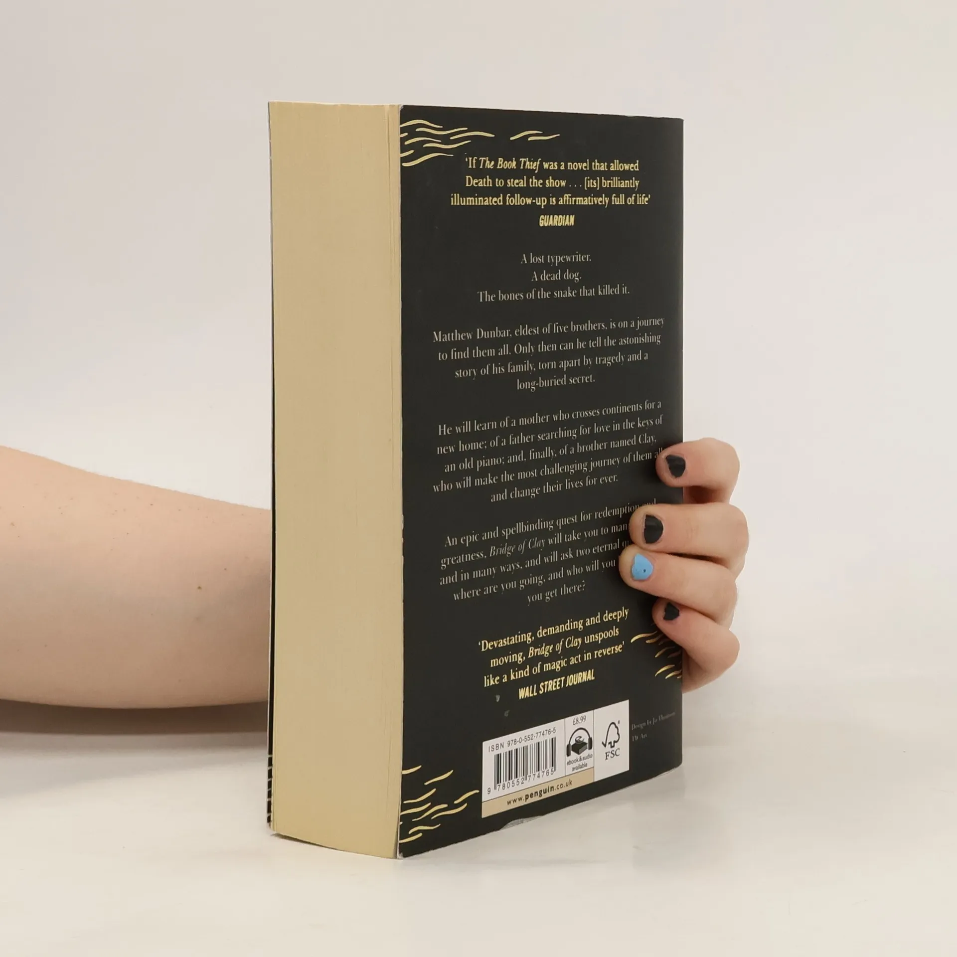 A lost typewriter. A dead dog. The bones of the snake that killed it. Matthew Dunbar, eldest of five brothers, is on a journey to find them all. Only then can he tell the astonishing story of his family, torn apart by tragedy and a long-buried secret. He will learn of a mother who crosses continents for a new home ; of a father searching for love in the keys 'of an old piano ; and, finally, of a brother named Clay, who will make the most challenging journey of them all, and change their lives for ever. An epic and spellbinding quest for redemption and greatness, Bridge of Clay will take you to many places, and in many ways, and will ask two eternal questions : where are you going, and who will you be when you get there ?