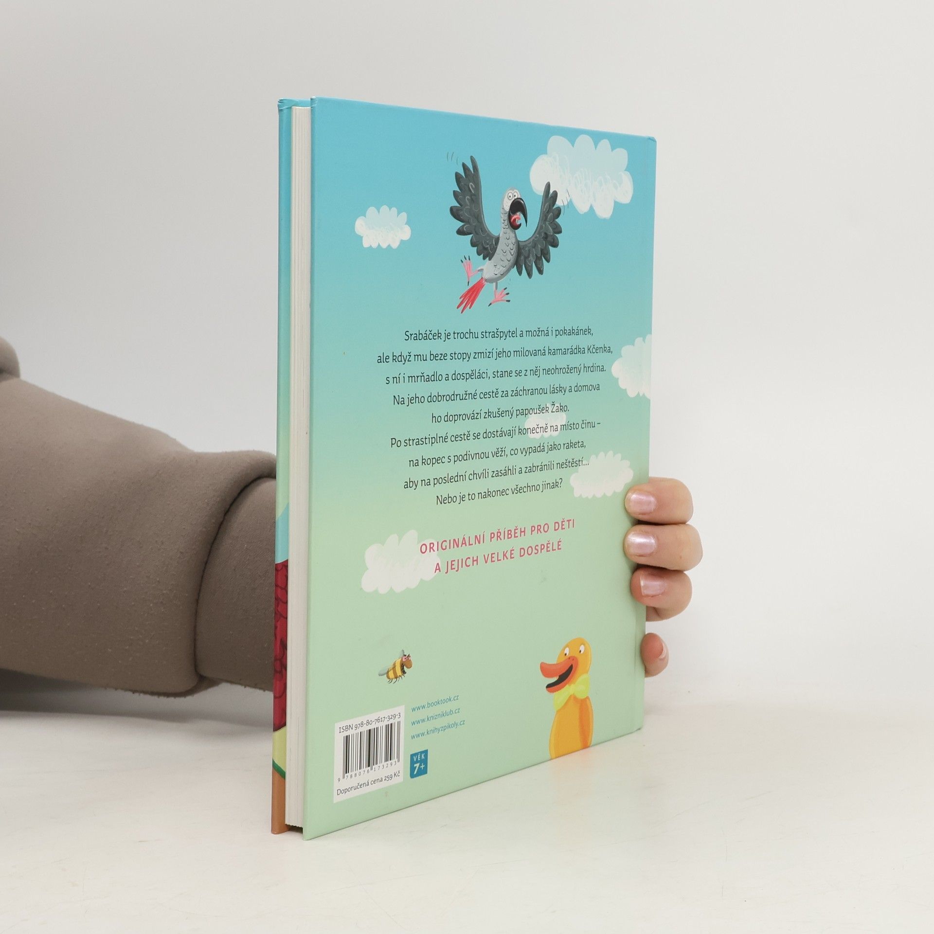 Říkají mu sice Srabáček, ale když zmizí plyšovému prasátku jeho milovaná kamarádka kačenka Kčenka, a s ní i miminko a celá rodina, stane z něj najednou neohrožený hrdina. Srabáček se vydává na dobrodružnou cestu za záchranou Kačenky a své rodiny. Parťákem mu je vypelichaný, ale zkušený papoušek Žako. Po cestě plné napínavých a humorných příhod se dostávají konečně na místo činu – do chalupy pod věží, co vypadá jako raketa, aby na poslední chvíli zasáhli a zabránili neštěstí… Nebo je to nakonec všechno jinak? Originální příběh pro děti od 7 let a jejich velké dospělé.