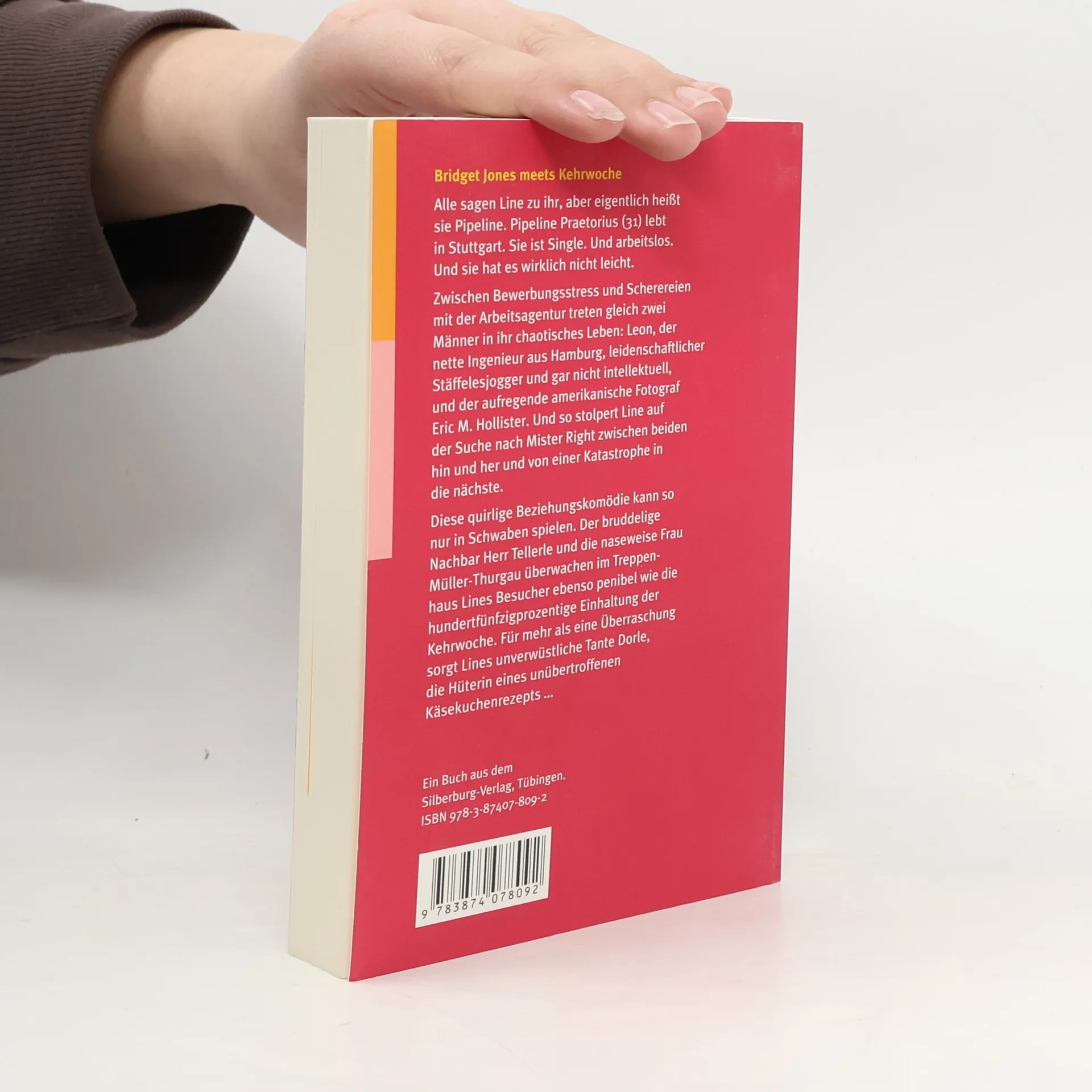 Alle sagen Line zu ihr, aber eigentlich heißt sie Pipeline. Pipeline Praetorius (31) lebt in Stuttgart. Sie ist Single. Und arbeitslos. Und sie hat es wirklich nicht leicht. Zwischen Bewerbungsstress und Scherereien mit der Arbeitsagentur treten gleich zwei Männer in ihr chaotisches Leben: Leon, der nette Ingenieur aus Hamburg, leidenschaftlicher Stäffelesjogger und gar nicht intellektuell, und der aufregende amerikanische Fotograf Eric M. Hollister. Und so stolpert Line auf der Suche nach Mister Right zwischen beiden hin und her und von einer Katastrophe in die nächste. Diese quirlige Beziehungskomödie kann so nur in Schwaben spielen. Der bruddelige Nachbar Herr Tellerle und die naseweise Frau Müller-Thurgau überwachen im Treppenhaus Lines Besucher ebenso penibel wie die hundertfünfzigprozentige Einhaltung der Kehrwoche. Für mehr als eine Überraschung sorgt Lines unverwüstliche Tante Dorle, Hüterin eines unübertroffenen Käsekuchenrezepts ... Frei nach dem Motto »Bridget Jones meets Kehrwoche« legt die Stuttgarter Autorin Elisabeth Kabatek einen frechen, turbulenten Frauenroman vor. Zum Brüllen komisch!