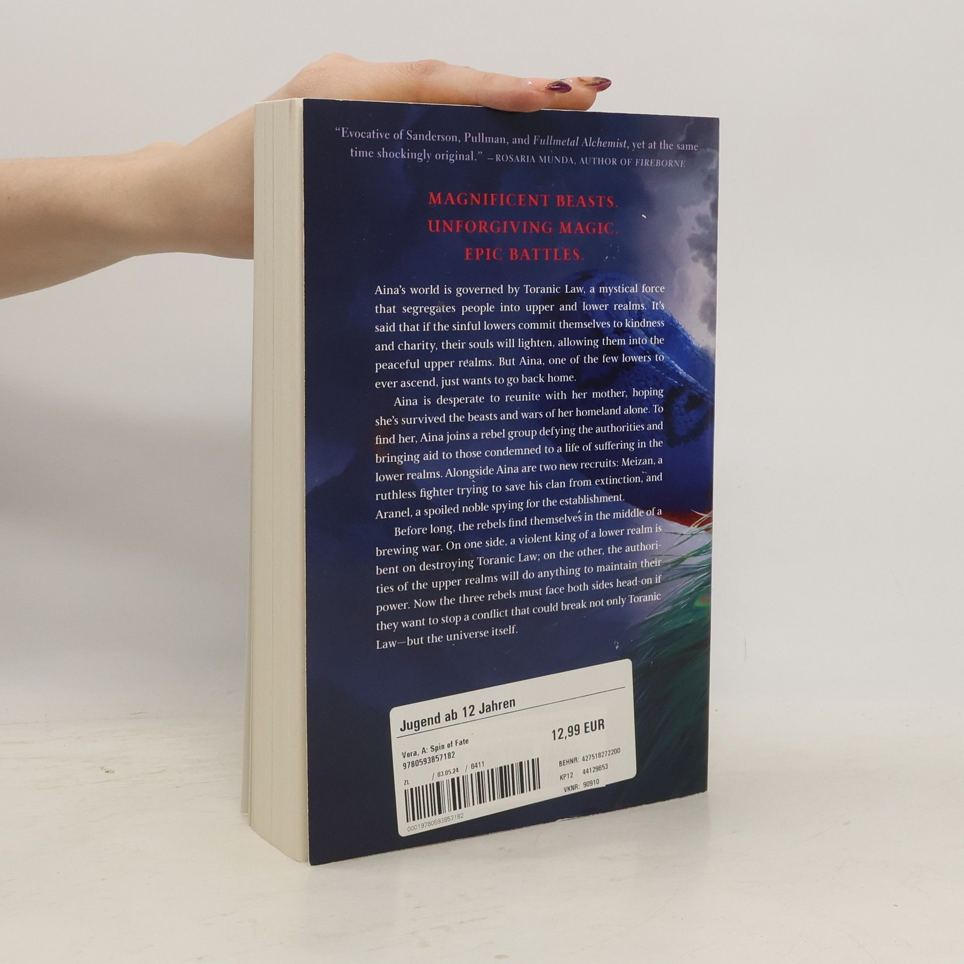 Magnificent Beasts. Buried Gods. Unforgiving Magic. Epic Battles.Perfect for fans of Avatar: The Last Airbender and Naruto, this propulsive high fantasy debut features intricate world-building, and a scientific hard magic system inspired loosely by the law of karma.The world is governed by Toranic Law, an ancient magical force that segregates people into upper and lower realms based on their morality. It’s said that if the sinful lowers commit themselves to kindness, their souls will lighten, allowing them into the blissful upper realms.But Aina, one of the few lowers to ever ascend, just wants to go back. Desperate to reunite with her mother, who remains stuck in their horror-infested homeland, Aina joins the Balancers—a group that defies Toranic Law by bringing aid to those condemned to a life of suffering in the lower realms.Alongside Aina are two new recruits: Aranel, a spoiled noble spying for the upper authorities; and Meizan, a ruthless fighter trying to save his clan from extinction.Before long, Aina, Aranel, and Meizan find themselves in the midst of a brewing war. On one side, a violent lower king is bent on destroying Toranic Law; on the other, the upper authorities will do anything to stay on top.The trio must face both sides head-on if they want to stop a conflict that could break not only Toranic Law... but the universe itself."An exhilarating series opener." - Kirkus (Starred Review)