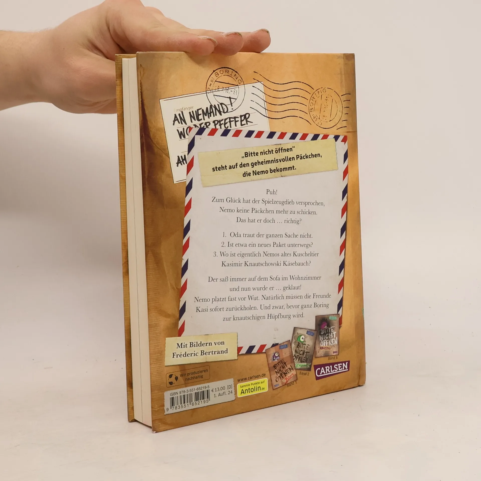 Was ist lustig, knautschig und immer schläfrig? Nemos neue Monsterpost! Eigentlich soll Nemo keine Päckchen mehr bekommt. Doch Oda traut der ganzen Sache nicht. Ist etwa ein neues Paket unterwegs? Und wo ist Nemos altes Kuscheltier Kasimir Knautschowski Käsebauch? Kasi saß immer auf dem Sofa im Wohnzimmer und nun ist er ... geklaut! Nemo platzt fast vor Wut. Natürlich müssen die drei Freunde Kasi retten. Und zwar, bevor ganz Boring zur knautschigen Hüpfburg wird. Wenn Spielzeug plötzlich lebendig wird Nemo und seine Freunde Oda und Fred bekommen immer wieder seltsame Pakete zugeschickt. Eigentlich dürfen sie die Päckchen gar nicht öffnen, aber sie machen es trotzdem – mit abenteuerlichen Folgen! Denn aus jedem Paket springt ein Wesen, das nach Hause will. Quicklebendig, riesengroß und selten hilfreich. Die Buchreihe "Bitte nicht öffnen": • Geheimnisvolle Pakete, urkomische Figuren und spannende Abenteuer: Für Fans von mysteriösen Detektivgeschichten und lustiger Fantasy • Yeti, Drache oder Vampir – hinter jedem Band versteckt sich ein anderes Monster • Große Schrift und viele Bilder – ideal für Leseanfänger*innen und Zweitklässler*innen ab 8 Jahren Ein verlorenes Wesen, das nach Hause will, drei mutige Freunde und viele Überraschungen - für abenteuerlustige Mädchen und Jungen zum Vor- oder Selberlesen.