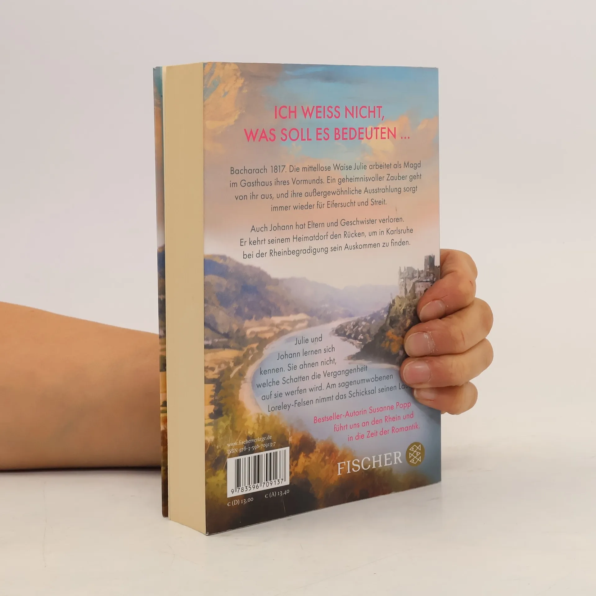 Bestsellerautorin Susanne Popp (»Die Teehändlerin«) führt an die Ufer des Rheins und den sagenumwobenen Felsen in die Zeit der Romantik Bacharach 1817. Die mittellose Waise Julie arbeitet als Magd im Gasthaus ihres Vormunds. Ein geheimnisvoller Zauber geht von ihr aus, und ihre außergewöhnliche Schönheit sorgt immer wieder für Eifersucht und Streit. Der Pfarrer fordert gar, dass sie den Ort verlässt. Auch Johann hat Eltern und Geschwister verloren. Er kehrt seinem Heimatdorf den Rücken, um in Karlsruhe bei der Rheinbegradigung sein Auskommen zu finden. Nach einem entsetzlichen Ereignis verlässt er die Großbaustelle und wird Schiffer auf dem breiten Fluss. Julie und Johann lernen sich kennen. Sie ahnen nicht, welche Schatten die Vergangenheit auf sie werfen wird. Am sagenumwobenen Loreley-Felsen nimmt das Schicksal seinen Lauf. Ein mächtiger Fluss, eine märchenhafte Landschaft und eine berührende Liebe - Bestsellerautorin Susanne Popp macht die Romantik lebendig.