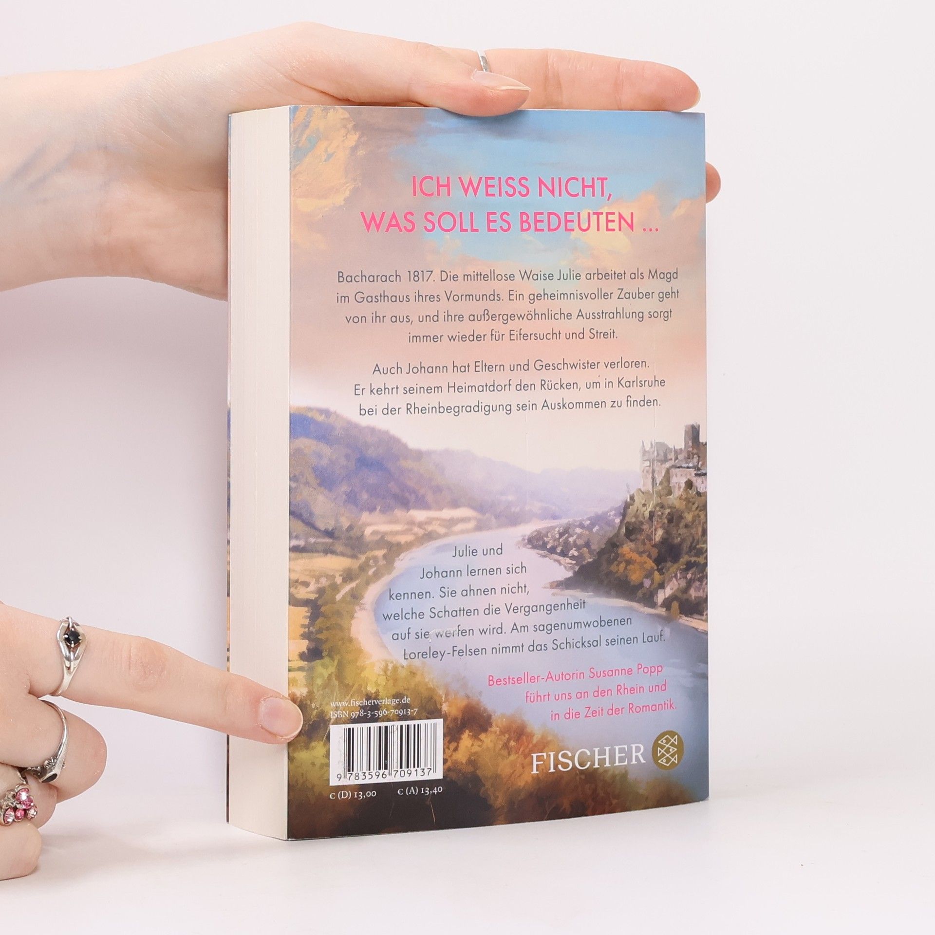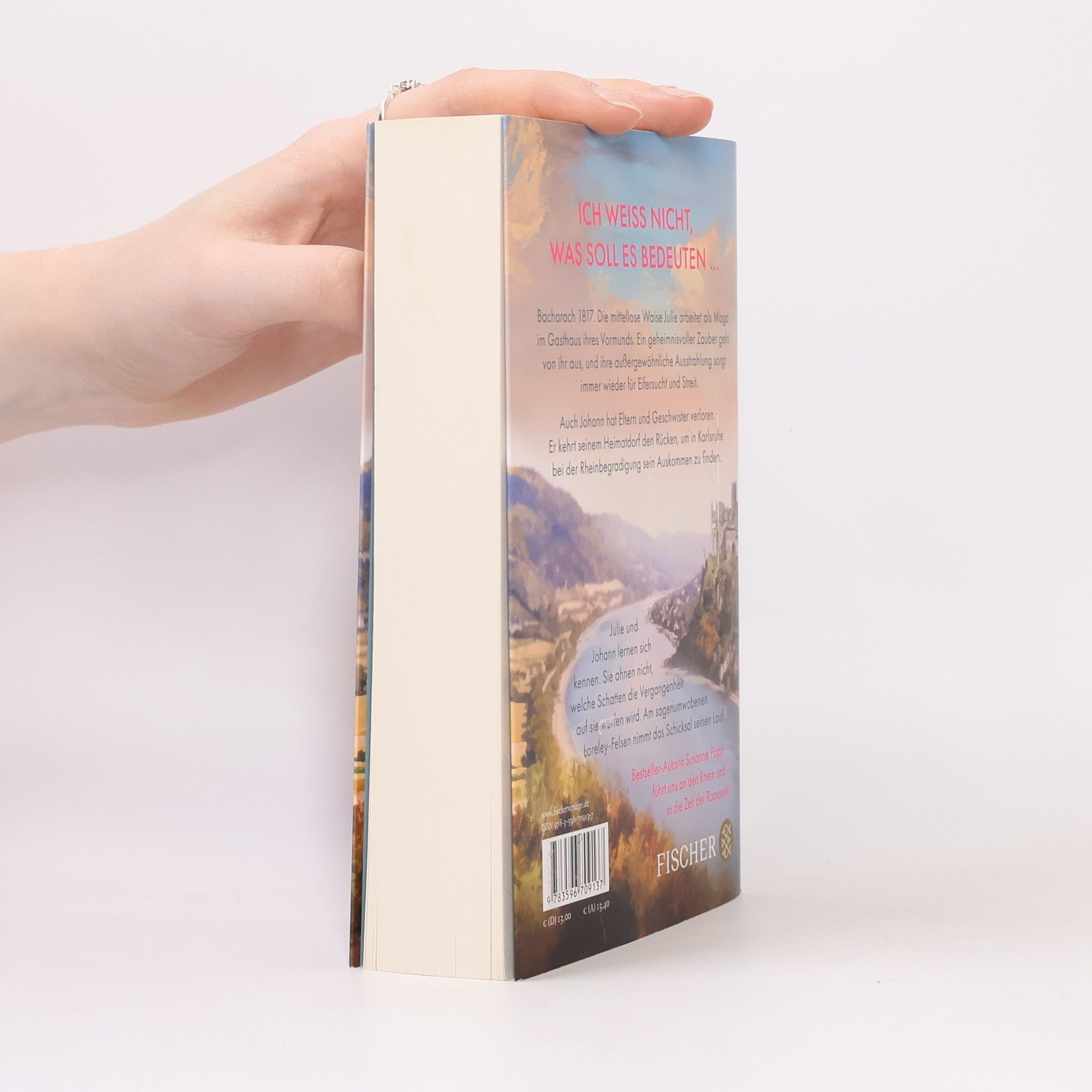 Bestsellerautorin Susanne Popp (»Die Teehändlerin«) führt an die Ufer des Rheins und den sagenumwobenen Felsen in die Zeit der Romantik Bacharach 1817. Die mittellose Waise Julie arbeitet als Magd im Gasthaus ihres Vormunds. Ein geheimnisvoller Zauber geht von ihr aus, und ihre außergewöhnliche Schönheit sorgt immer wieder für Eifersucht und Streit. Der Pfarrer fordert gar, dass sie den Ort verlässt. Auch Johann hat Eltern und Geschwister verloren. Er kehrt seinem Heimatdorf den Rücken, um in Karlsruhe bei der Rheinbegradigung sein Auskommen zu finden. Nach einem entsetzlichen Ereignis verlässt er die Großbaustelle und wird Schiffer auf dem breiten Fluss. Julie und Johann lernen sich kennen. Sie ahnen nicht, welche Schatten die Vergangenheit auf sie werfen wird. Am sagenumwobenen Loreley-Felsen nimmt das Schicksal seinen Lauf. Ein mächtiger Fluss, eine märchenhafte Landschaft und eine berührende Liebe - Bestsellerautorin Susanne Popp macht die Romantik lebendig.