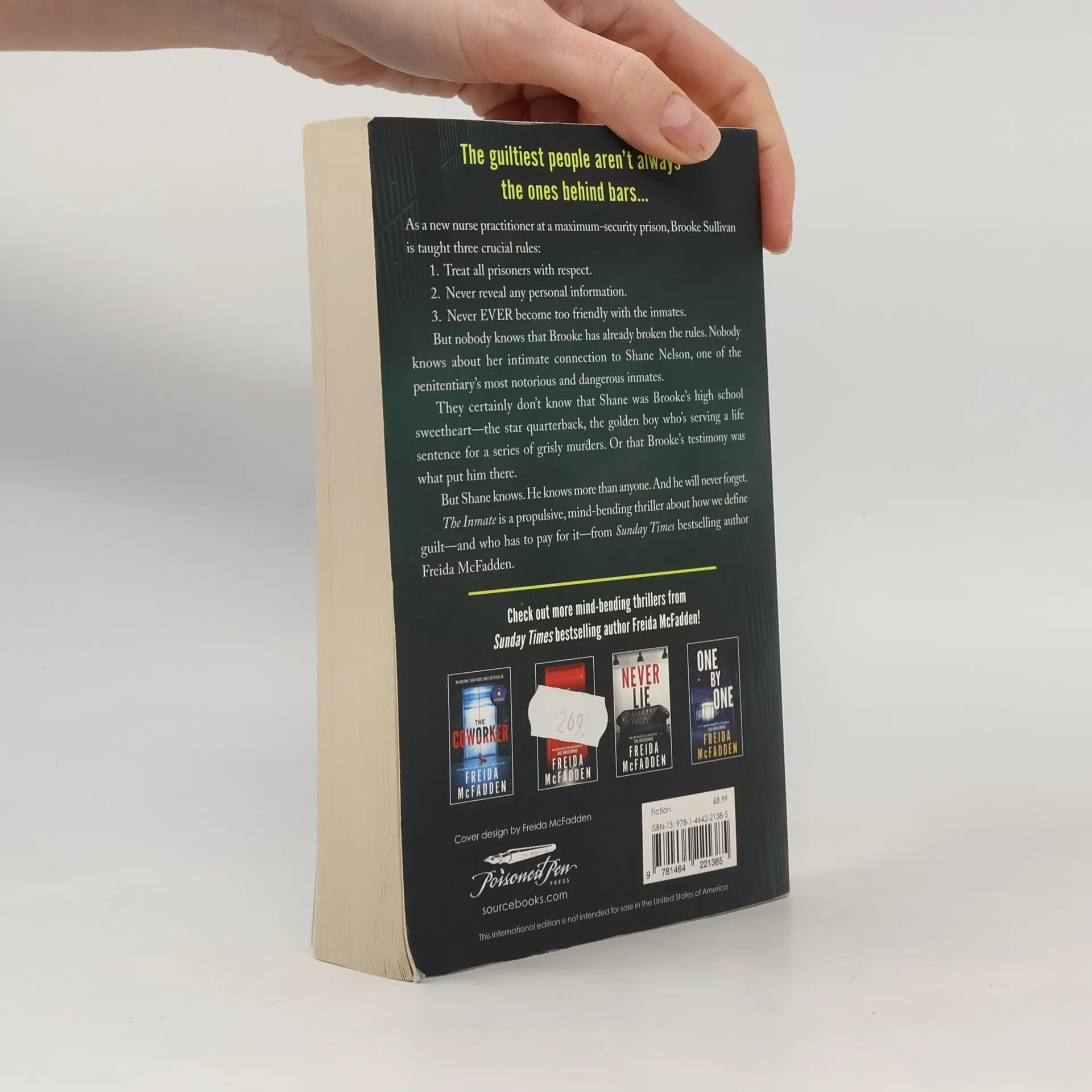 A gripping, twisty thriller from Freida McFadden, the Sunday Times bestselling author of The Housemaid and The Coworker! The guiltiest people aren't always the ones behind bars... As a new nurse practitioner at a maximum-security prison, Brooke Sullivan is taught three crucial rules: Treat all prisoners with respect. Never reveal any personal information. Never EVER become too friendly with the inmates. But nobody knows that Brooke has already broken the rules. Nobody knows about her intimate connection to Shane Nelson, one of the penitentiary's most notorious and dangerous inmates. They certainly don't know that Shane was Brooke's high school sweetheart--the star quarterback, the golden boy who's serving a life sentence for a series of grisly murders. Or that Brooke's testimony was what put him there. But Shane knows. He knows more than anyone. And he will never forget. The Inmate is a propulsive, mind-bending thriller about how we define guilt--and who has to pay for it, from Sunday Times bestselling author Freida McFadden.