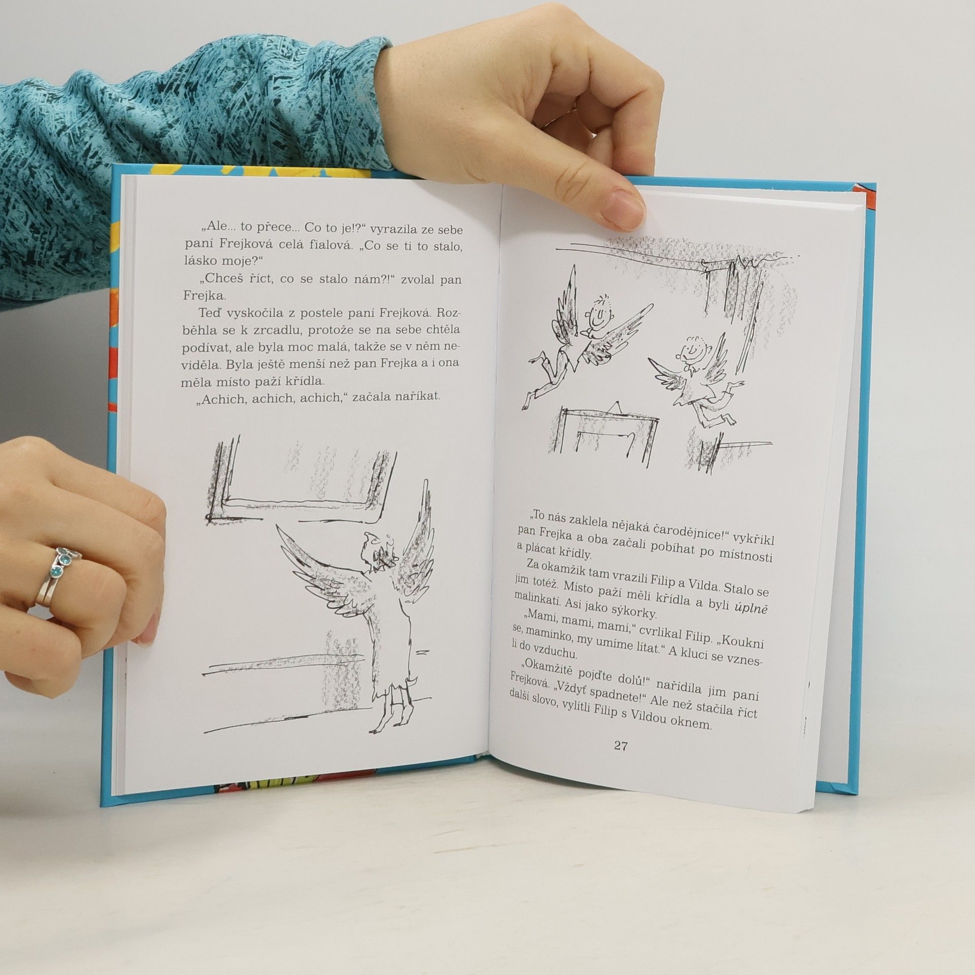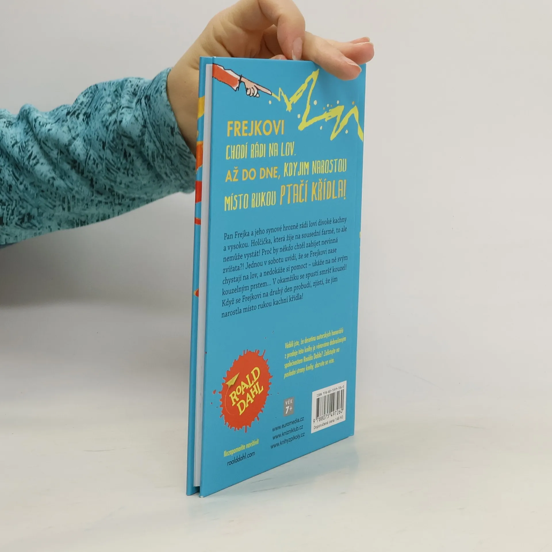 (1. vydání) Pan Frejka a jeho synové hrozně rádi loví divoké kachny a vysokou. Holčička, která žije na sousední farmě, to však nesnáší! Jednoho dne uvidí, že rodina se zase chystá na lov, ukáže na ně svým kouzelným prstem – a spustí se smršť kouzel a problémů! Den po lovu se Frejkovi probudí, a zjistí, že jim narostla místo rukou ptačí křídla! Musí přísahat, že se pušek navždy zbaví, a dostanou tak ještě jednu šanci... Kniha je určena čtenářům od 7 le