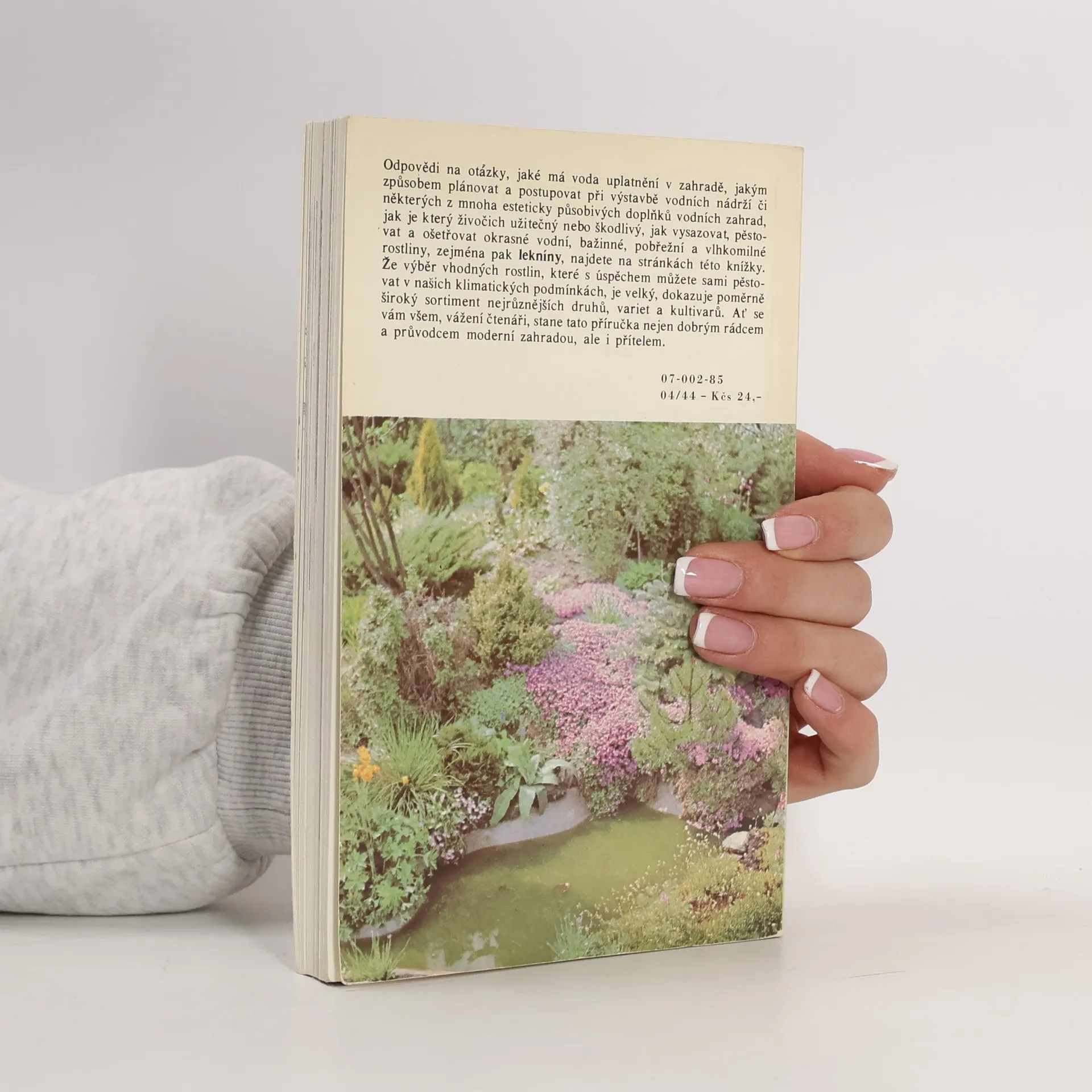 Odpovědi na otázky, jaké má voda uplatnění v zahradě, jakým způsobem plánovat a postupovat při výstavbě vodních nádrží či některých z mnoha esteticky působivých doplňků vodních zahrad, jak je který živočich užitečný nebo škodlivý, jak vysazovat, pěstovat a ošetřovat okrasné vodní, bažinné, pobřežní a vlhkomilné rostliny, zejména pak lekníny, najdete na stránkách této knížky. Že výběr vhodných rostlin, které s úspěchem můžete sami pěstovat v našich klimatických podmínkách, je velký, dokazuje poměrně široký sortiment nejrůznějších druhů, variet a kultivarů. Ať se vám všem, vážení čtenáři, stane tato příručka nejen dobrým rádcem l. a průvodcem moderní zahradou, ale i přítelem.