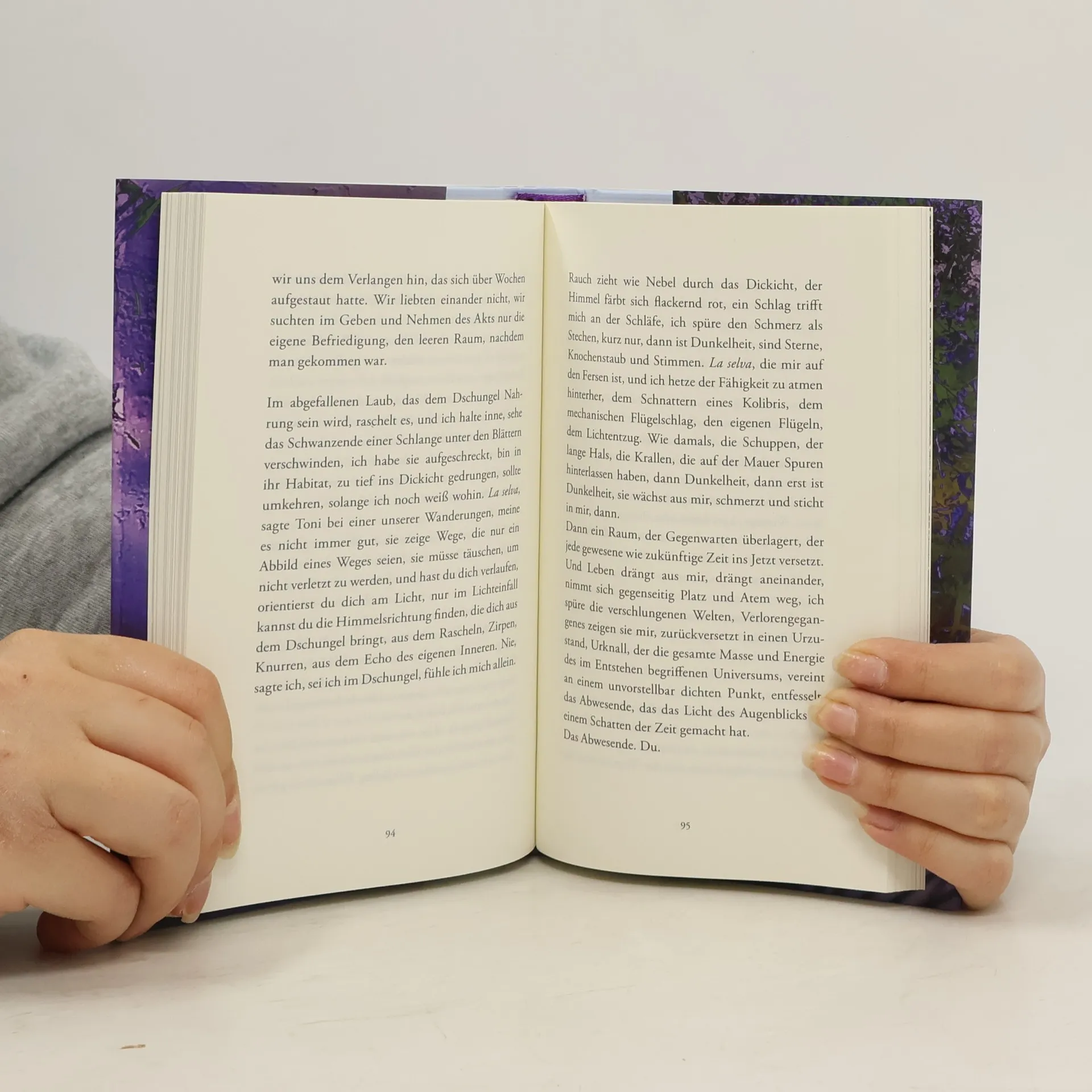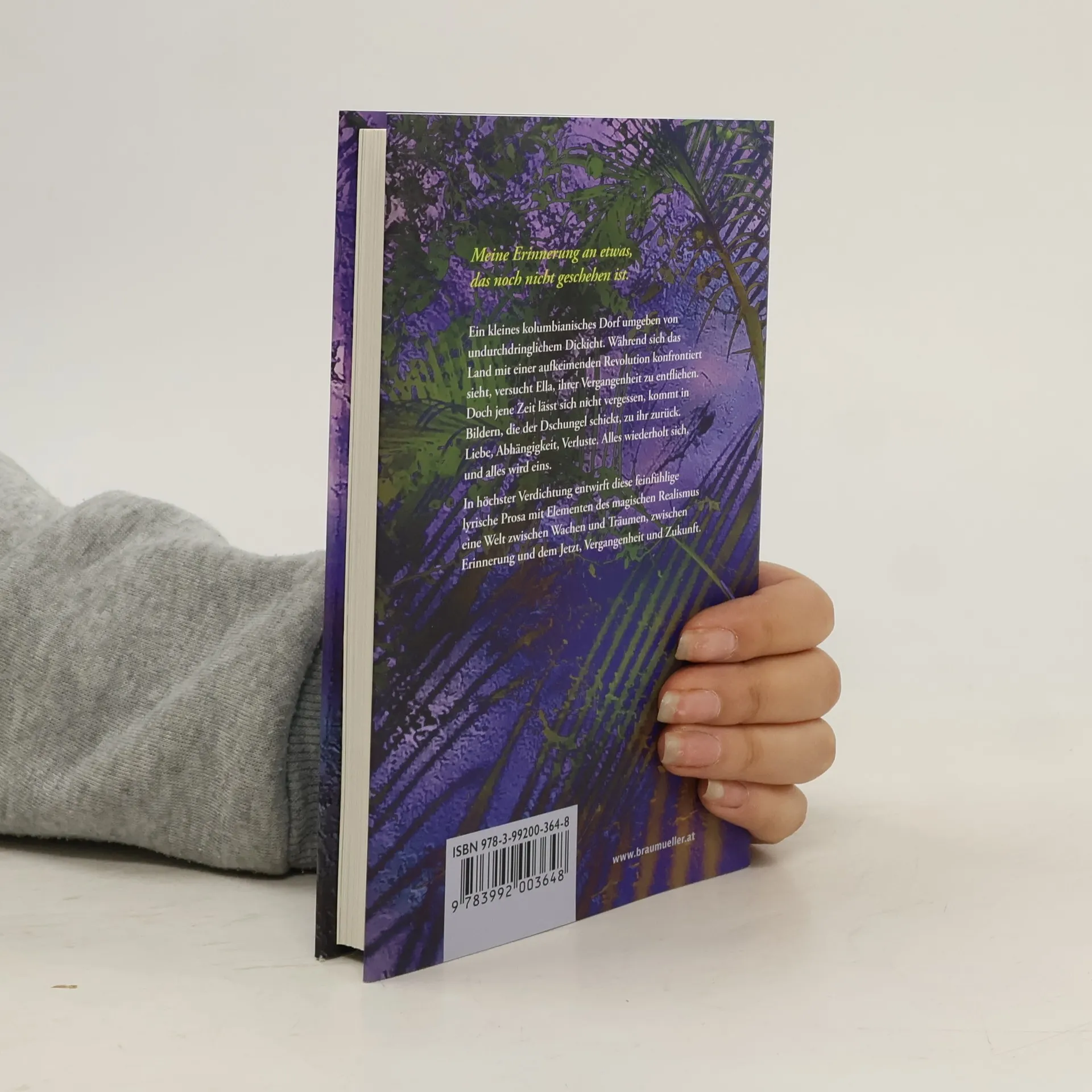 Blätter, die an Ella haften bleiben, sie festhalten, ihr Atem auf ihrer Haut. Der nahe Dschungel wird bedrohlicher, je länger sich Ella in dem kleinen kolumbianischen Dorf aufhält. Die Flucht vor ihrer Vergangenheit hat sie hierhergebracht. Doch jene Zeit lässt sich nicht vergessen. Nicht ihre Kindheit in Wien ohne Vater und mit einer psychisch kranken Mutter, nicht die Jugend bei ihrer Tante und dessen Mann in Paris, der ihre emotionale Abhängigkeit ausgenutzt hatte. Das undurchdringliche Dickicht, das sie umgibt, ruft diese Erinnerungen hervor. Und während die politischen Unruhen im Land zunehmen, scheint es Ella, als würde sie langsam mit dem Dschungel verwachsen. In dessen Überwucherung durchlebt Ella ein Bewegen in einer Gesellschaft, die nur noch wenig hat, an dem man sich festhalten kann.