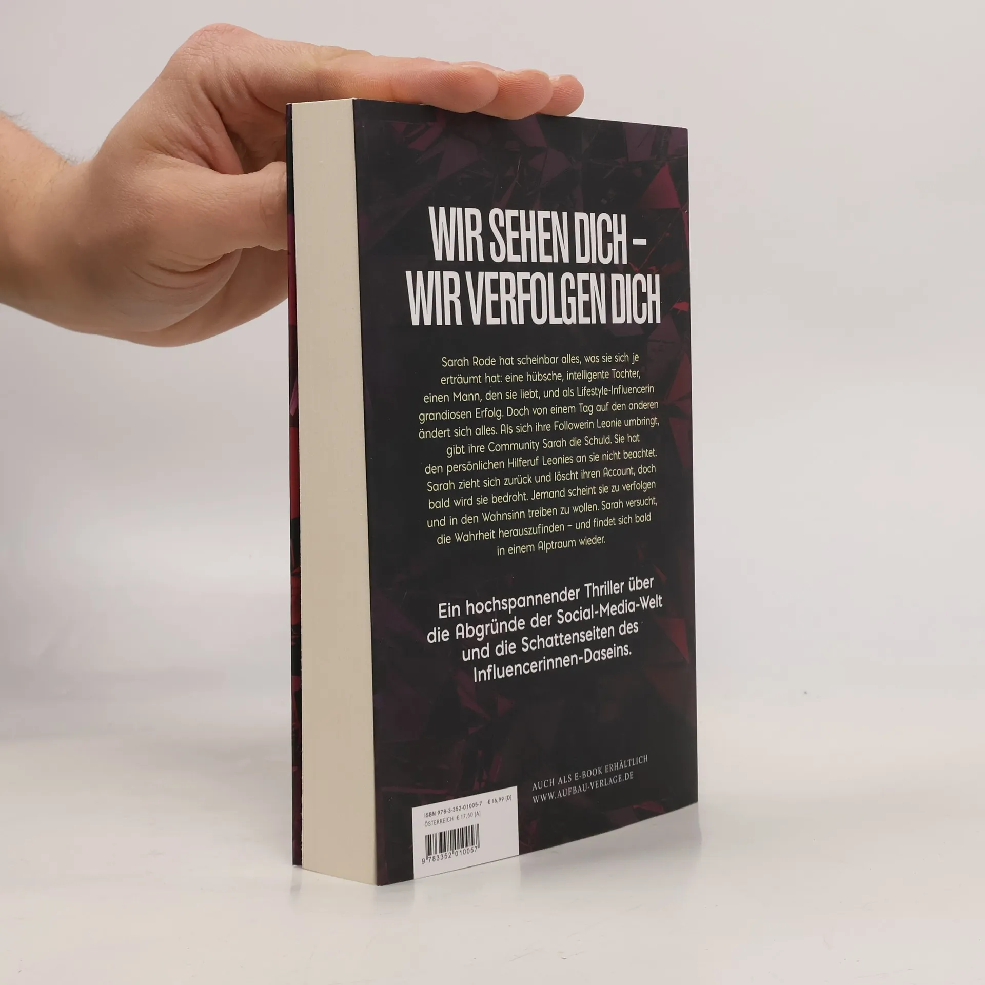 Wir sehen dich – wir verfolgen dich. Am Höhepunkt ihrer Online-Karriere verliert die Lifestyle-Influencerin Sarah Rode alles, wofür sie jahrelang gearbeitet hat. Die Online-Welt gibt ihr die Schuld am Tod einer Followerin. Nach einer Flutwelle aus Hass löscht Sarah all ihre Social-Media-Apps und verkriecht sich in ihrem Haus. Doch der Hass sickert bald über die Grenzen der Online Communities hinaus bis über ihre Türschwelle. Sie fühlt sich bedroht und verfolgt. Dann erscheint ein neuer Instagram-Account in Sarahs Namen. Wer steckt hinter dem Fake-Account? Wie kann es sein, dass der Betreiber ihre persönlichen Geheimnisse zu kennen scheint? In einem atemlosen Rausch kommt Sarah der erschütternden Wahrheit Schritt für Schritt näher ... Ein hochspannender Thriller über die Abgründe der Social Media-Welt und die Schattenseiten des Influencer*innen-Daseins.