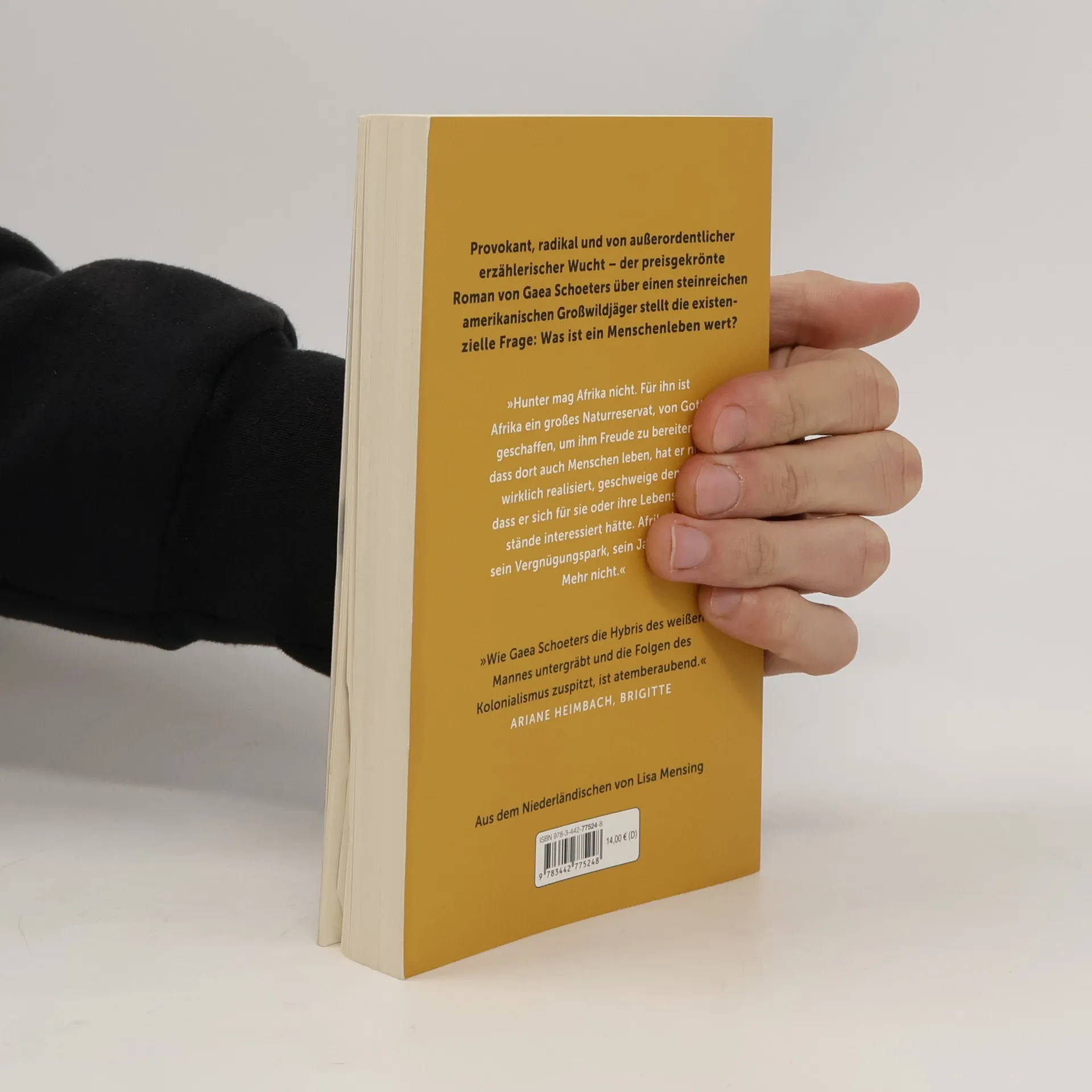 Provokant, absurd und sprachgewaltig stellt »Trophäe« die existenzielle Frage: Was ist ein Menschenleben wert? Hunter White, steinreich, Amerikaner und begeisterter Jäger, hatte schon fast alles vor dem Lauf. Endlich bietet ihm sein Freund Van Heeren ein Nashorn zum Abschuss an und damit die Chance, die »Big Five« vollzumachen. Hunter reist nach Afrika, doch dort wird sein Vorhaben jäh von Wilderern durchkreuzt. Er sinnt auf Rache, als ihn Van Heeren fragt, ob er schon einmal von den »Big Six« gehört habe. Ersatzweise könne er ihm eine andere Trophäe zum Abschuss anbieten ... Gaea Schoetersʼ preisgekrönter Roman ist von einer außerordentlichen erzählerischen Wucht. Die Tiefenschärfe, mit der sie die Geräusche und Gerüche der Natur beschreibt, lässt einen sinnlich erleben, was einen moralisch an die Grenzen zwischen Richtig und Falsch führt.