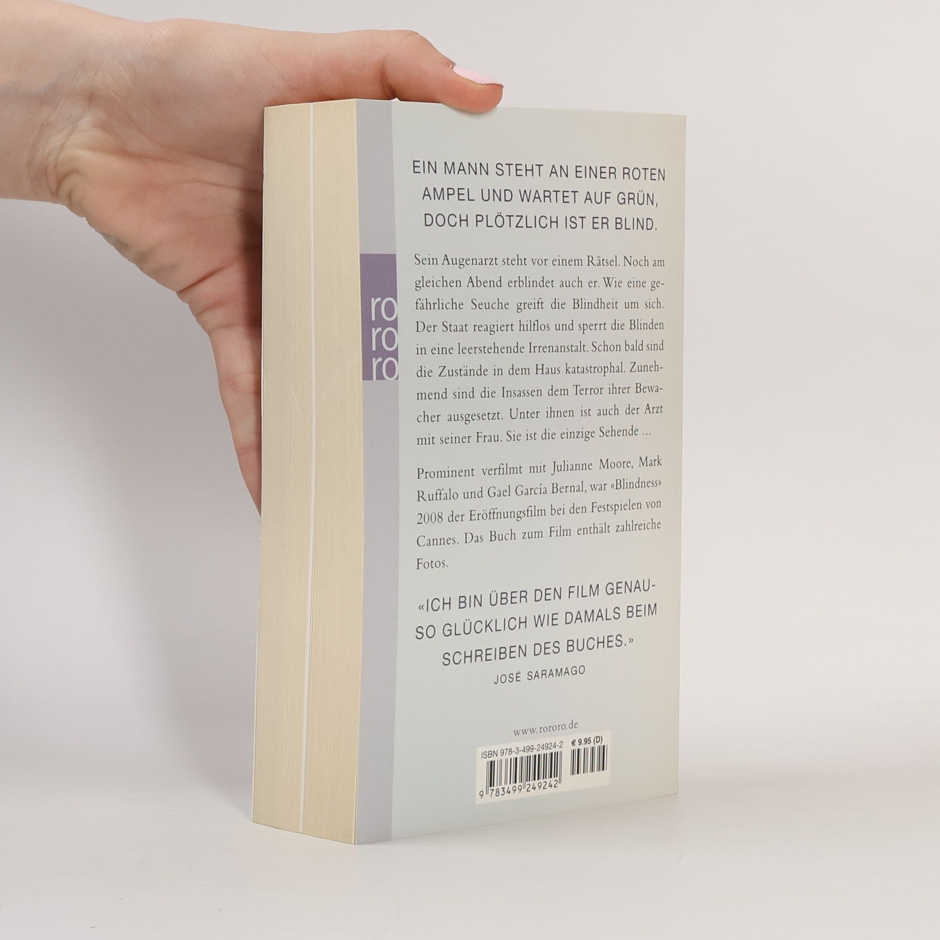 Ein Mann steht an einer roten Ampel und wartet auf Grün, doch plötzlich ist er blind. Sein Augenarzt steht vor einem Rätsel. Noch am gleichen Abend erblindet auch er. Wie eine gefährliche Seuche greift die Blindheit um sich. Der Staat reagiert hilflos und sperrt die Blinden in eine leerstehende Irrenanstalt. Schon bald sind die Zustände in dem Haus katastrophal. Zunehmend sind die Insassen dem Terror ihrer Bewacher ausgesetzt. Unter ihnen ist auch der Arzt mit seiner Frau. Sie ist die einzige Sehende … Prominent verfilmt mit Julianne Moore, Mark Ruffalo und Gael García Bernal war „Blindness“ 2008 der Eröffnungsfilm bei den Festspielen von Cannes. Das Buch zum Film enthält zahlreiche Fotos. „Ich bin über den Film genauso glücklich wie damals beim Schreiben des Buches.“ (José Saramago)