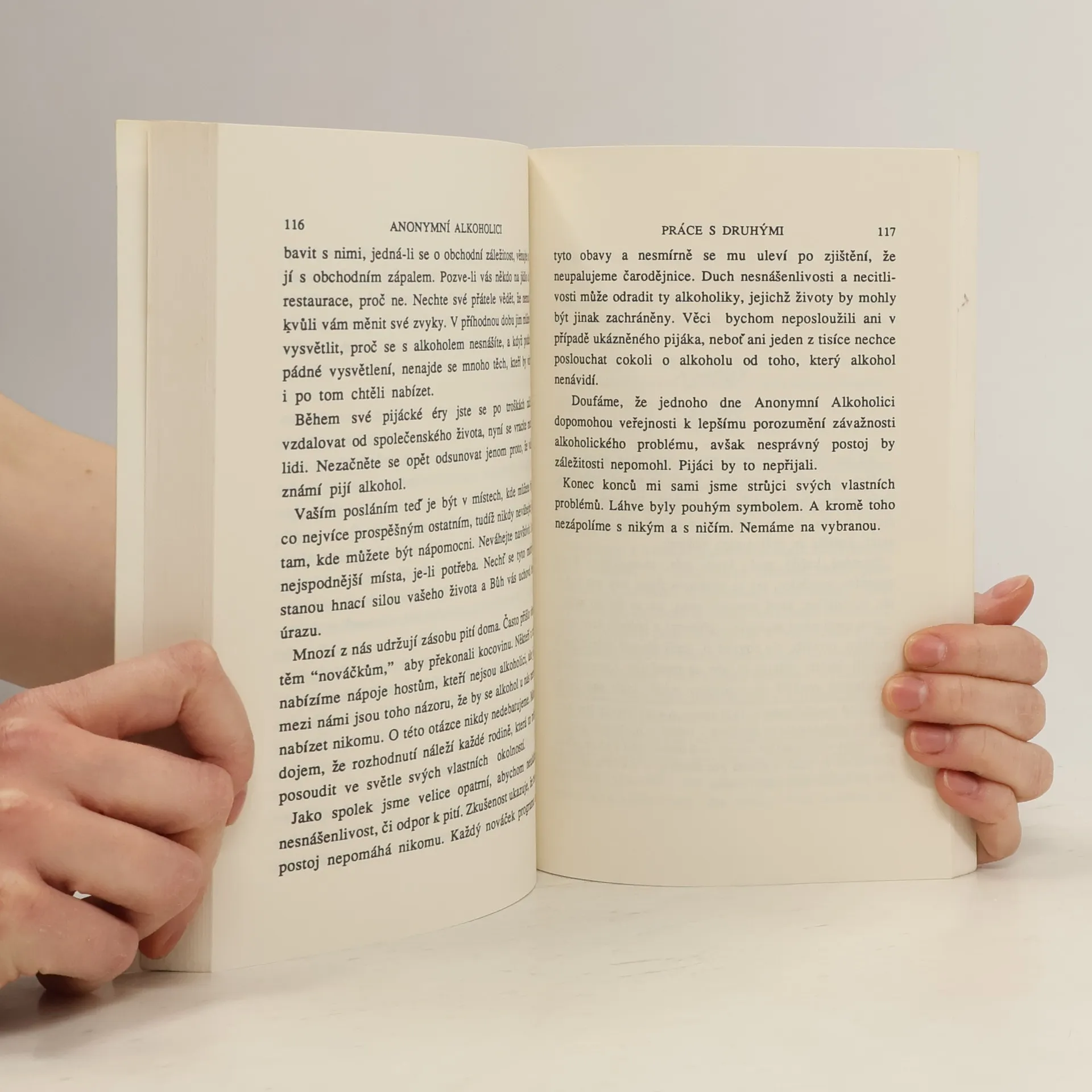 Překlad původního vydání textu z roku 1939 (4 roky poté,co bylo společenství AA založeno) nabízí jednoduchý i zajímavý,léty pravděpodobně i ověřený návod na léč- bu alkoholismu.Informuje o příčinách a podstatě alkoholismu,který je velmi závaž- nou chorobou,vysvětluje psychologii alkoholika a ukazuje,jak jednoduše AA pomáhá už léta šířit tyto informace po celém světě.Princip léčby spočívá v dodržování úplné abstinence,změně dosavadních návyků a přátel a podstatné motivaci pro nový život bez alkoholu.Zvláštní kapitoly jsou věnovány manželkám,dětem a zaměstnavate- lům alkoholiků.Kniha je doplněna životními osudy dvou zakládajících členů AA.