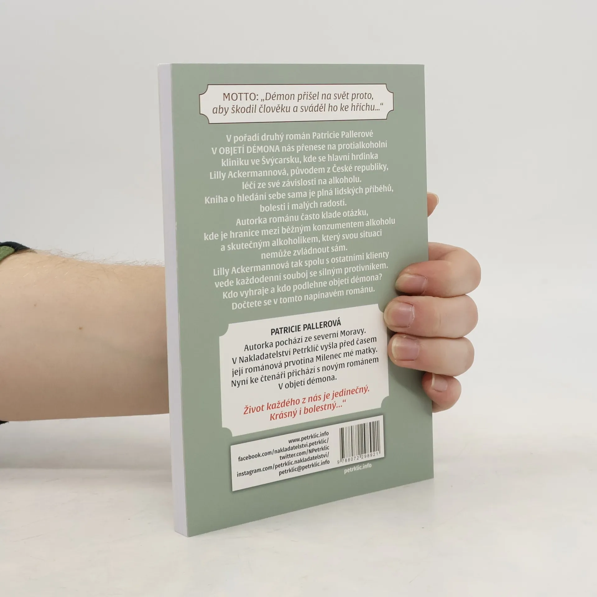V pořadí druhý román Patricie Pallerové V OBJETÍ DÉMONA nás přenese na protialkoholní kliniku ve Švýcarsku, kde se hlavní hrdinka Lilly Ackermannová, původem z České republiky, léčí ze své závislosti na alkoholu. Kniha o hledání sebe sama je plna lidských příběhů, bolesti i malých radostí. Autorka románu často klade otázku, kde je hranice mezi běžným konzumentem alkoholu a skutečným alkoholikem, který svou situaci nemůže zvládnout sám. Lilly Ackermannová tak spolu s ostatními klienty vede každodenní souboj se silným protivníkem. Kdo vyhraje a kdo podlehne objetí démona? Dočtete se v tomto napínavém románu.
