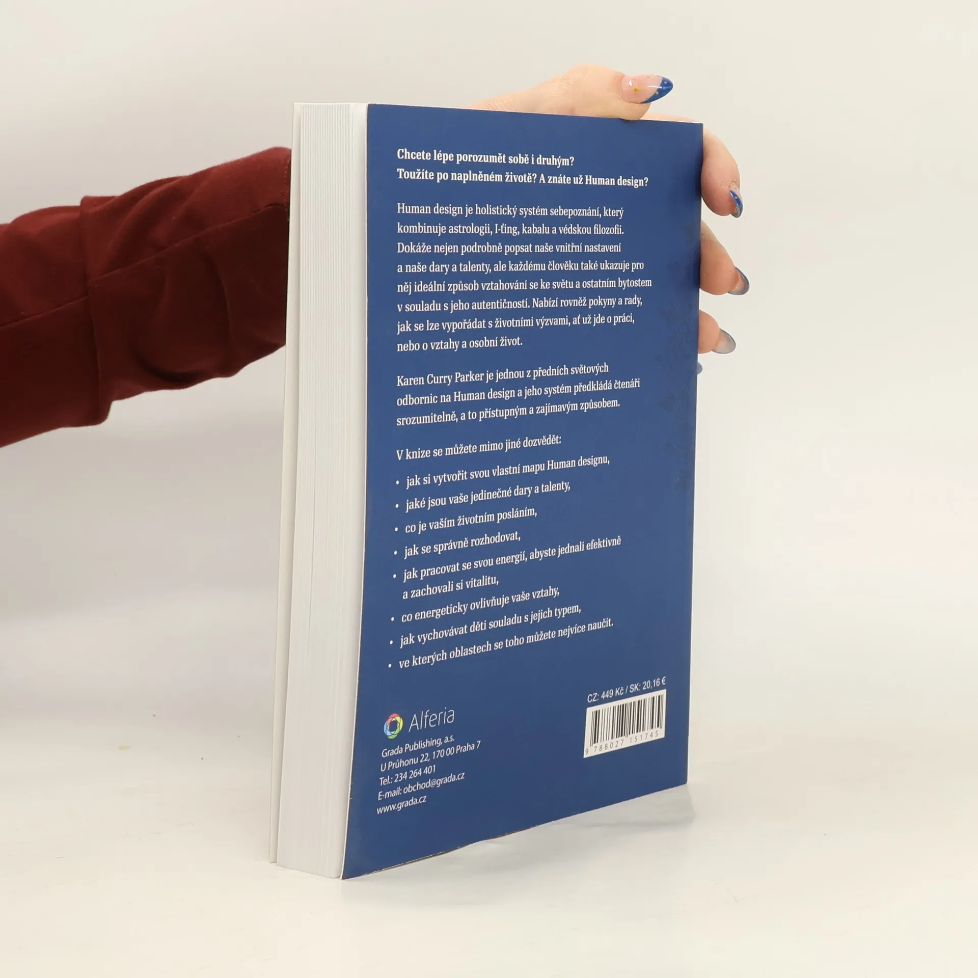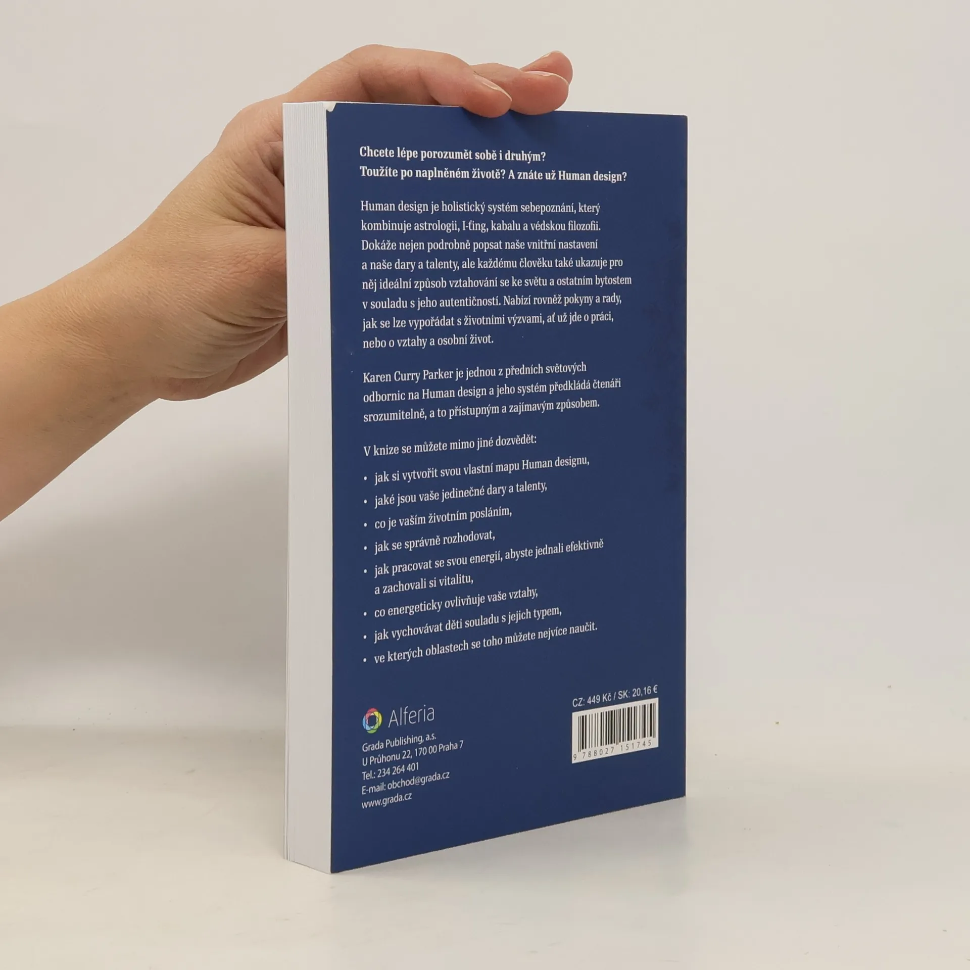 Chcete lépe porozumět sobě i druhým? Toužíte po naplněném životě? A znáte už Human design? Human design je holistický systém sebepoznání, který kombinuje astrologii, I-ťing, kabalu a védskou filozofii. Dokáže nejen podrobně popsat naše vnitřní nastavení a naše dary a talenty, ale každému člověku také ukazuje pro něj ideální způsob vztahování se ke světu a ostatním bytostem v souladu s jeho autentičností. Nabízí rovněž pokyny a rady, jak se lze vypořádat s životními výzvami, ať už jde o práci, nebo o vztahy a osobní život. Karen Curry Parker je jednou z předních světových odbornic na Human design a jeho systém předkládá čtenáři srozumitelně, a to přístupným a zajímavým způsobem. V knize se můžete mimo jiné dozvědět: jak si vytvořit svou vlastní mapu Human designu, jaké jsou vaše jedinečné dary a talenty, co je vaším životním posláním, jak se správně rozhodovat, jak pracovat se svou energií, abyste jednali efektivně a zachovali si vitalitu, co energeticky ovlivňuje vaše vztahy, jak vychovávat děti souladu s jejich typem, * ve kterých oblastech se toho můžete nejvíce naučit.