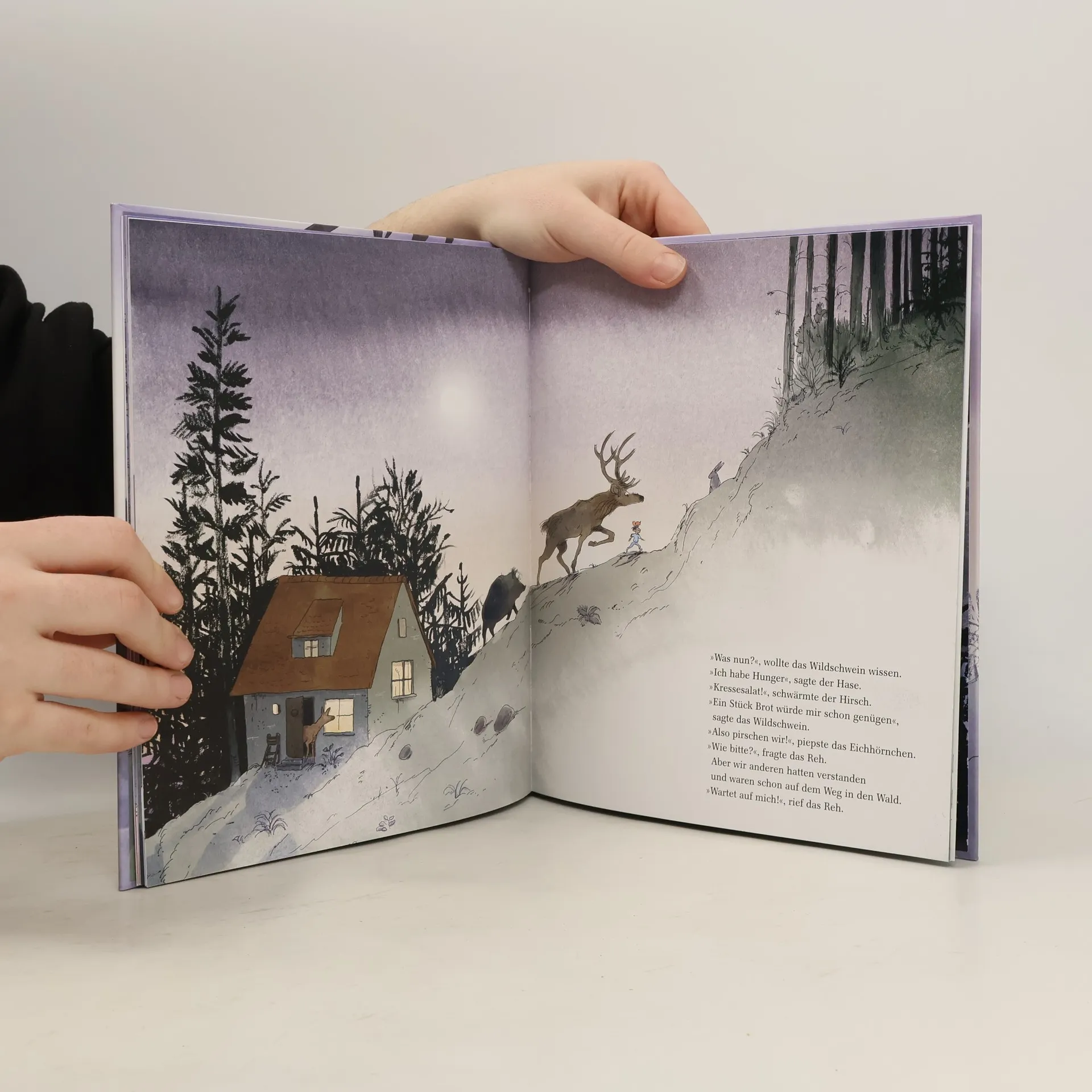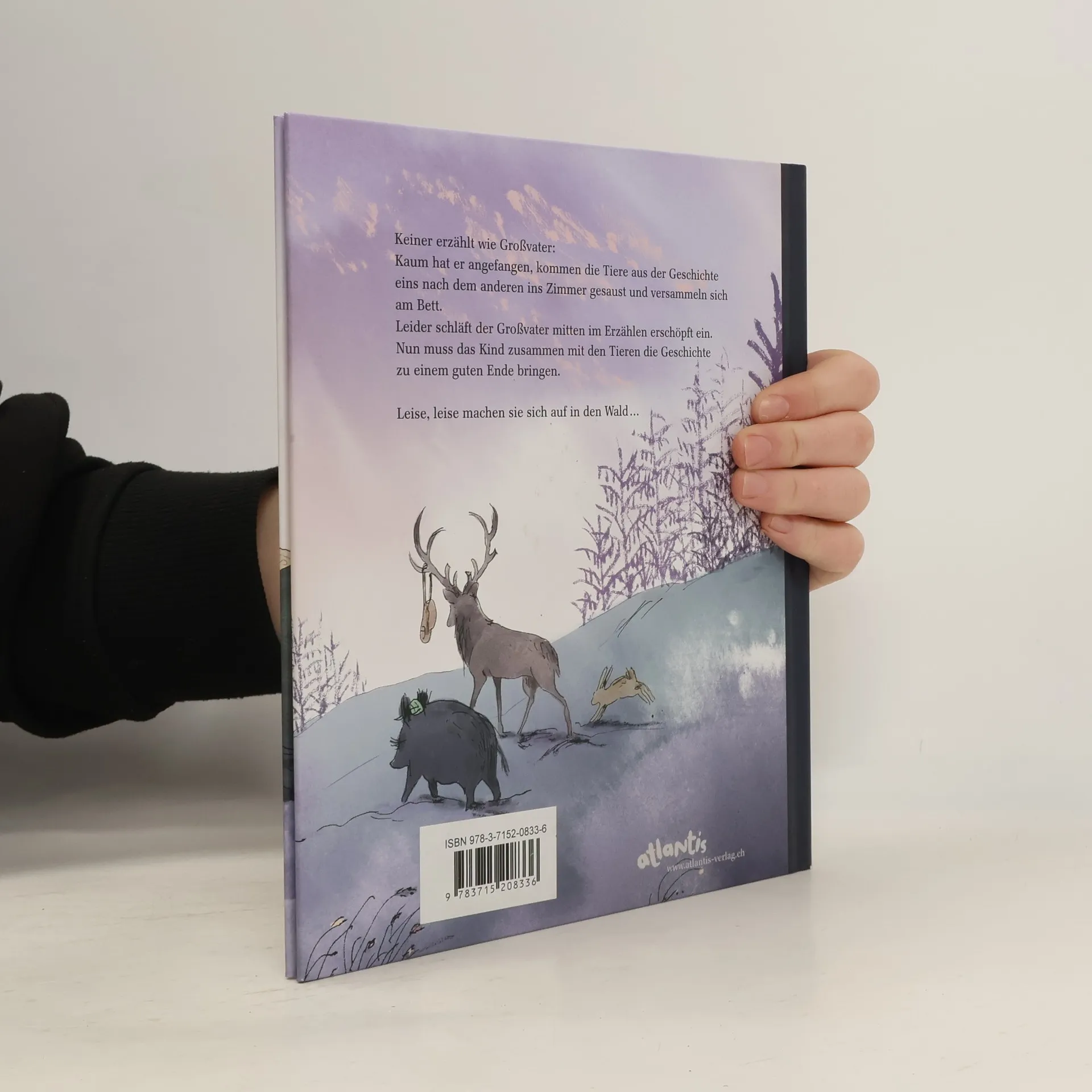 Keiner erzählt wie Großvater: Kaum hat er angefangen, kommen die Tiere aus der Geschichte eins nach dem anderen ins Zimmer gesaust und versammeln sich ums Bett. Leider schläft der Großvater mitten im Erzählen erschöpft ein. Leise macht sich das Kind mit den Tieren auf, um die Geschichte der Jägerin zu einem guten Ende zu bringen.