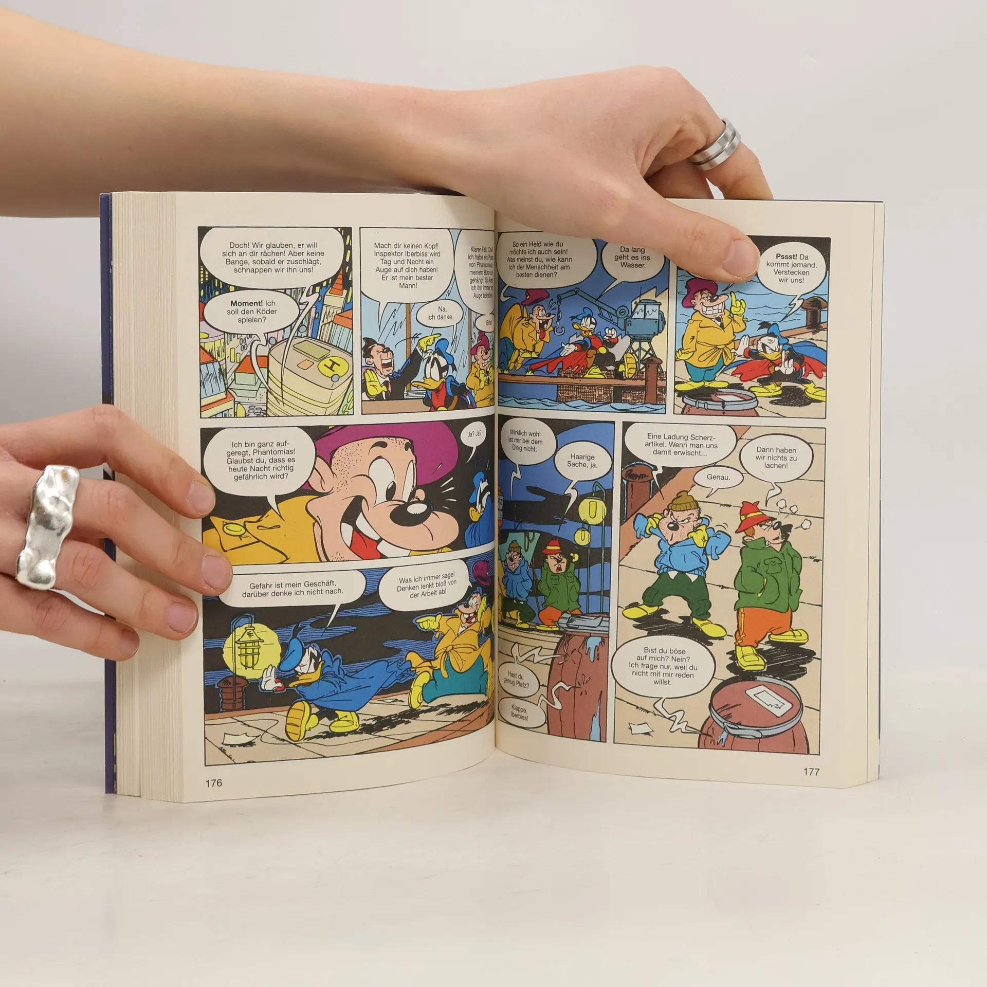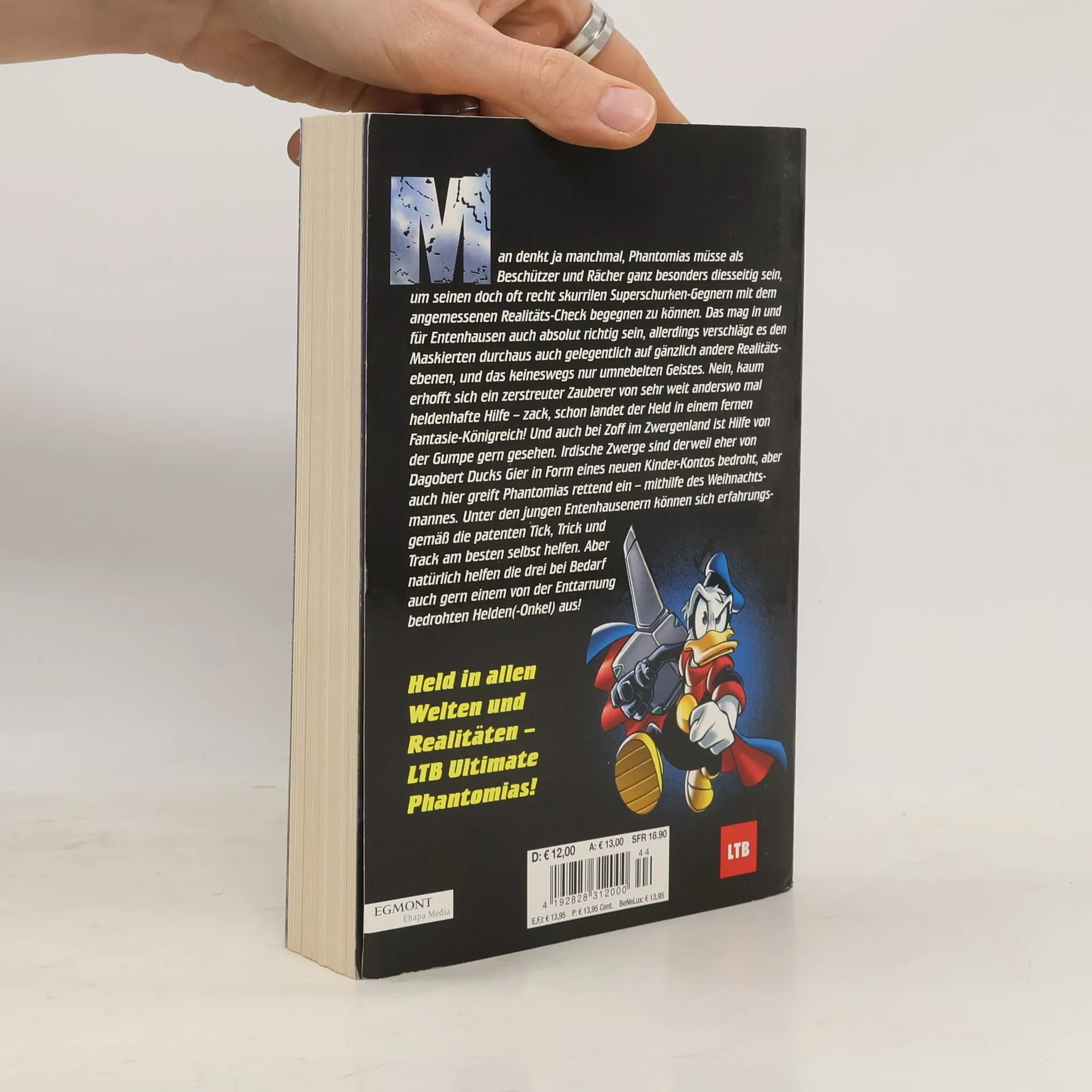 Man denkt ja manchmal, Phantomias müsse als Beschützer und Rächer ganz besonders diesseitig sein, um seinen doch oft recht skurrilen Superschurken-Gegnern mit dem angemessenen Realitäts-Check begegnen zu können. Das mag in und für Entenhausen auch absolut richtig sein, allerdings verschlägt es den Maskierten durchaus auch gelegentlich auf gänzlich andere Realitätsebenen, und das keineswegs nur umnebelten Geistes. Nein, kaum erhofft sich ein zerstreuter Zauberer von sehr weit anderswo mal heldenhafte Hilfe – zack, schon landet der Held in einem fernen Fantasie-Königreich! Und auch bei Zoff im Zwergenland ist Hilfe von der Gumpe gern gesehen. Irdische Zwerge sind derweil eher von Dagobert Ducks Gier in Form eines neuen Kinder-Kontos bedroht, aber auch hier greift Phantomias rettend ein – mithilfe des eihnachtsmannes. Unter den jungen Entenhausenern können sich erfahrungsgemäß die patenten Tick, Trick und Track am besten selbst helfen. Aber natürlich helfen die drei bei Bedarf auch gern einem von der Enttarnung bedrohten Helden(-Onkel) aus!