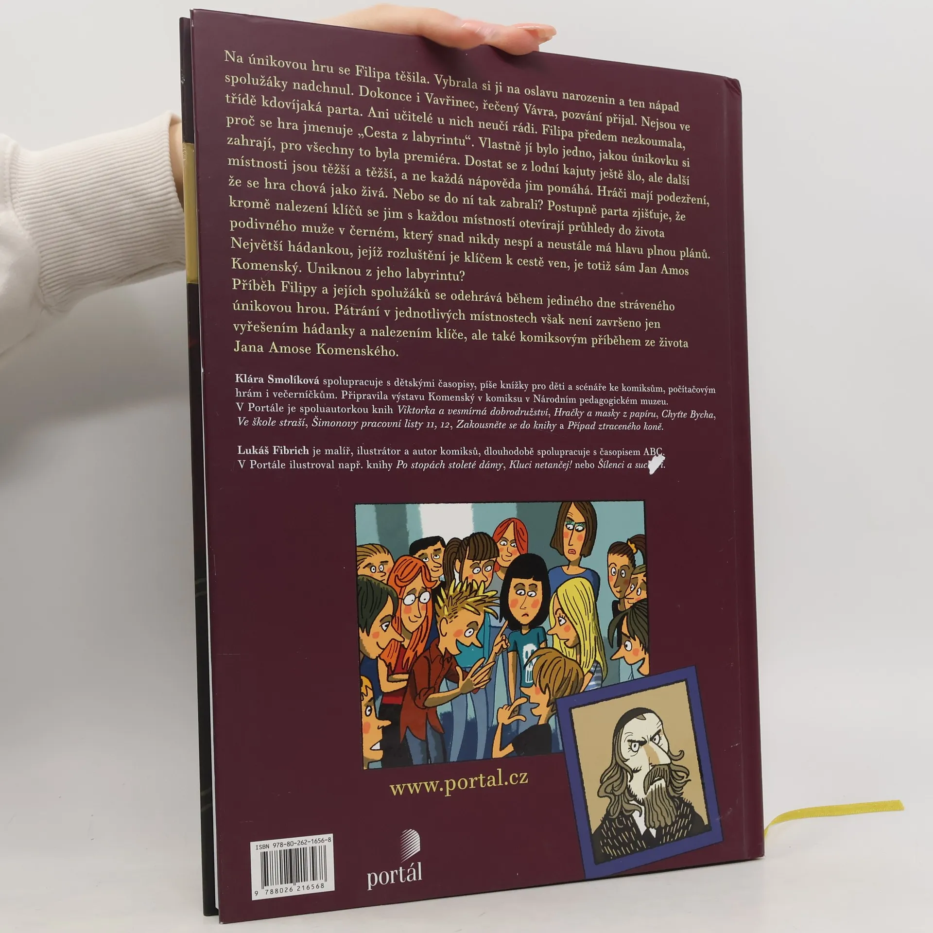 Na únikovou hru se Filipa těšila. Vybrala si ji na oslavu narozenin a ten nápad spolužáky nadchnul. Dokonce i Vavřinec, řečený Vávra, pozvání přijal. Nejsou ve třídě kdovíjaká parta. Ani učitelé u nich neučí rádi. Filipa předem nezkoumala, proč se hra jmenuje „Cesta z labyrintu“. Vlastně jí bylo jedno, jakou únikovku si zahrají, pro všechny to byla premiéra. Dostat se z lodní kajuty ještě šlo, ale další místnosti jsou těžší a těžší, a ne každá nápověda jim pomáhá. Hráči mají podezření, že se hra chová jako živá. Nebo se do ní tak zabrali? Postupně parta zjišťuje, že kromě nalezení klíčů se jim s každou místností otevírají průhledy do života podivného muže v černém, který snad nikdy nespí a neustále má hlavu plnou plánů. Největší hádankou, jejíž rozluštění je klíčem k cestě ven, je totiž sám Jan Amos Komenský. Uniknou z jeho labyrintu? Příběh Filipy a jejích spolužáků se odehrává během jediného dne stráveného únikovou hrou. Pátrání v jednotlivých místnostech však není završeno jen vyřešením hádanky a nalezením klíče, ale také komiksovým příběhem ze života Jana Amose Komenského.