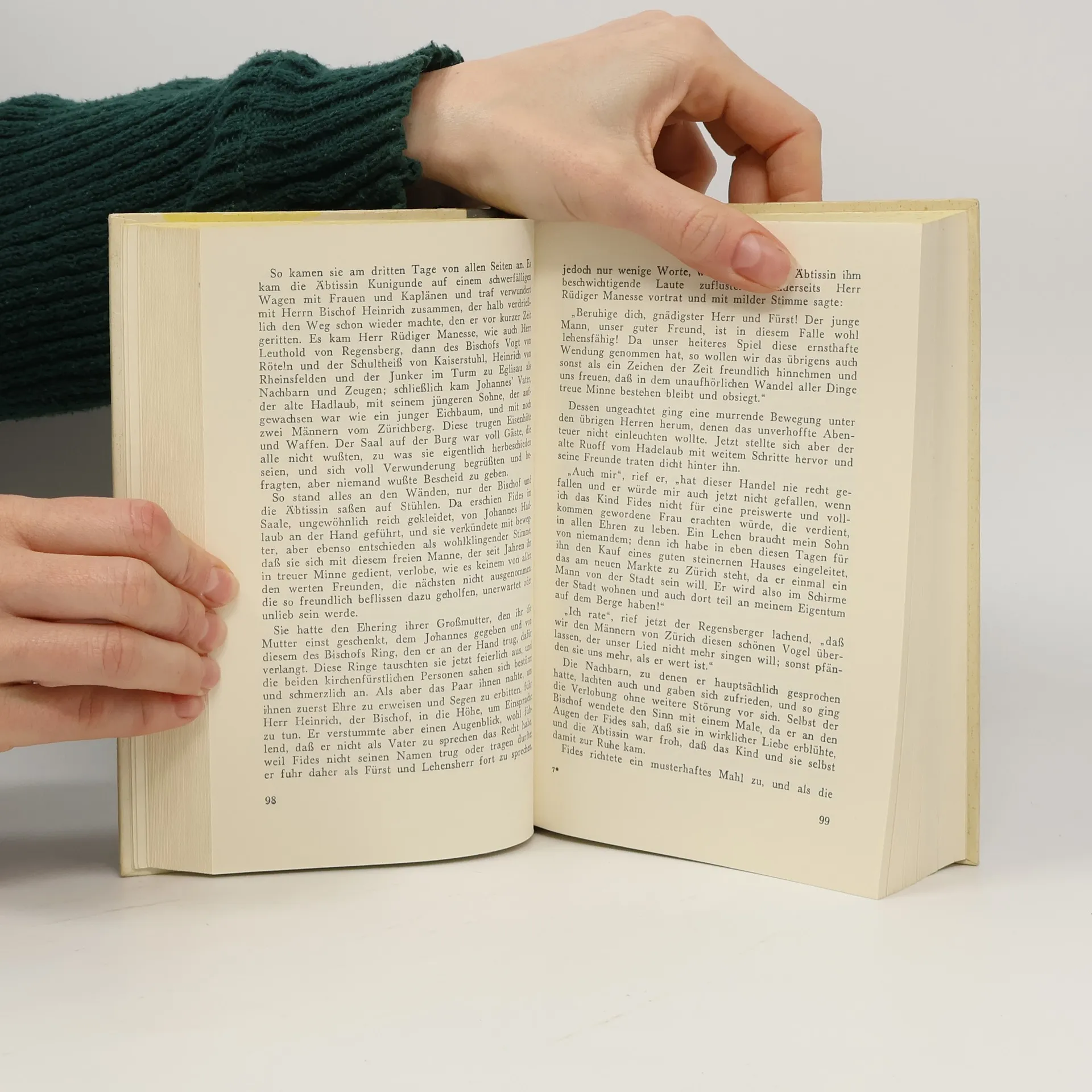 ... An einem solchen Orte traf Salomon Landolt, etwa in seinem funfundzwanzigsten Jahre, mit der jungen Salome zusammen. Sie standen zu dem Hause, von entgegengesetzter Seite her, in nicht naher Verwandtschaft, so da sie unter sich selbst nicht mehr fur verwandt gelten konnten und doch ein liebliches Gefuhl gemeinsamer Beziehung empfanden. Auerdem wurden sie wegen ihrer ahnlich lautenden Namen der Gegenstand heiterer Betrachtungen, und es gab manchen Scherz, der ihnen nicht zuwider war, wenn sie auf einen Ruf gleichzeitig sich umsahen und errotend wahrnahmen, da vom andern die Rede sei. Beide gleich hubsch, gleich munter und lebenslustig, schienen sie wohlgesinnten Freunden fur einander schicklich und eine Vereinigung nicht von vornherein untunlich zu sein. Freilich war Salomon nicht gerade in der Verfassung, schon ein eigenes Haus zu grunden; vielmehr kreuzte sein Lebensschifflein noch unschlussig vor dem Hafen herum, ohne auszufahren noch einzulaufen. ...
