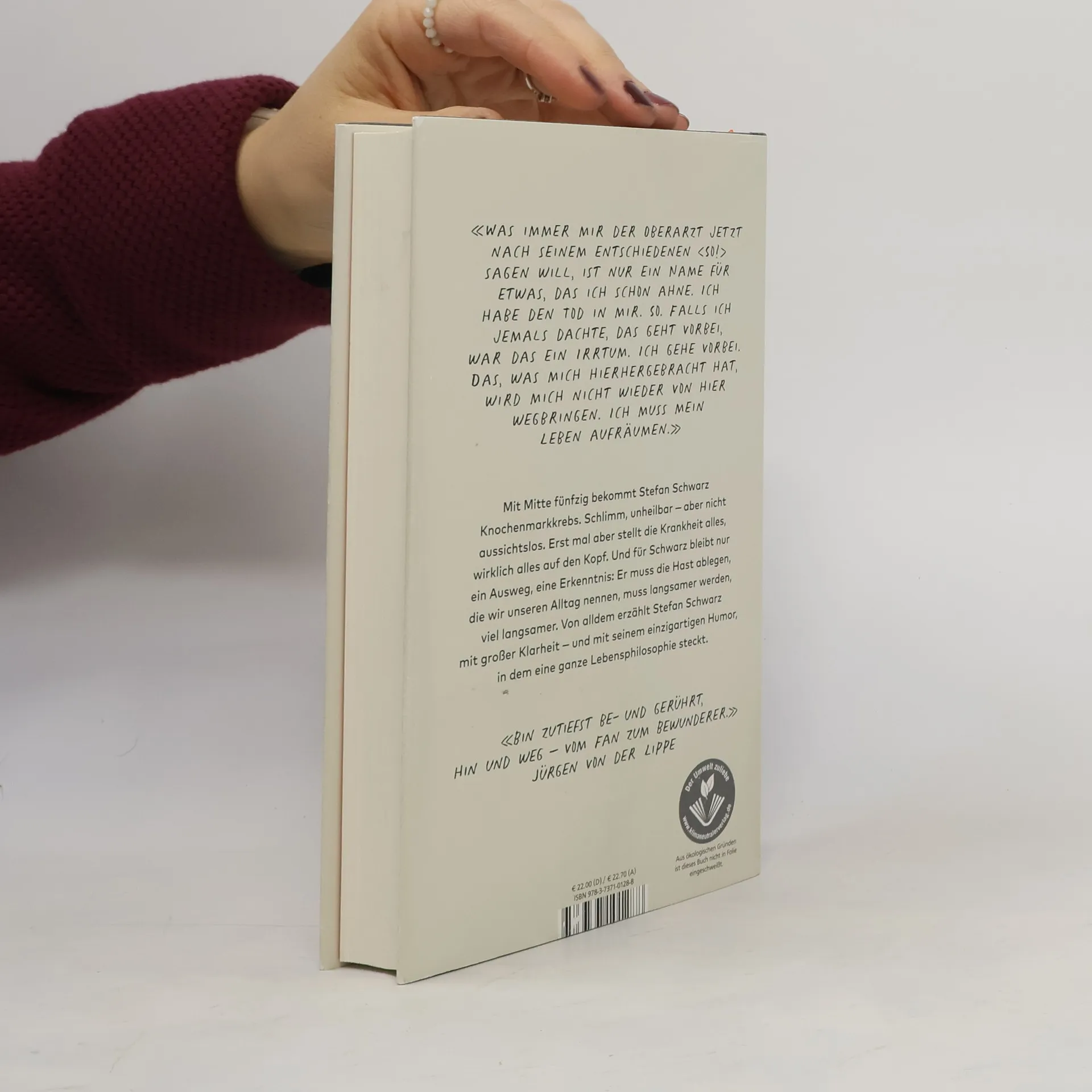 Mit Mitte fünfzig bekommt Stefan Schwarz Krebs. Besser gesagt, der Krebs bekommt ihn. Denn Schwarz ist erfahren im Umgang mit existenziellen Verwerfungen: «Wenn das Schicksal zuschlägt, schlage ich zurück!» Wie eine «Marie Kondo der Seele» beginnt er, sein Leben aufzuräumen, und macht dabei überraschende Entdeckungen. Auch legt er die Hast ab, die wir alle in unserem Alltag kennen, den ständigen Druck, mit irgendetwas fertigwerden zu müssen. Und besinnt sich auf die Langsamkeit, den Moment. Von all dem erzählt Stefan Schwarz mit großer Klarheit – und mit seinem einzigartigen Humor, in dem eine ganze Lebensphilosophie steckt. Ruhig, tief und mit wohltuender Selbstironie blickt er auf sein Dasein; innerlich frei und doch um Zukunft kämpfend, schreibt er über das mögliche Ende und das damit verbundene Aufwachen: «Das ist doch der ganze Sinn von Krebs. Dass man aufhört, sich und anderen was vorzumachen, dass man innehält, dass man aufwacht und sich die Augen reibt.» Und er schreibt über das, was stattgefunden hat und stattfindet: das Leben in seiner Fülle, das Stefan Schwarz wie unter einem Brennglas erfasst. Ein außergewöhnliches Buch – aufrüttelnd, bewegend, befreiend.