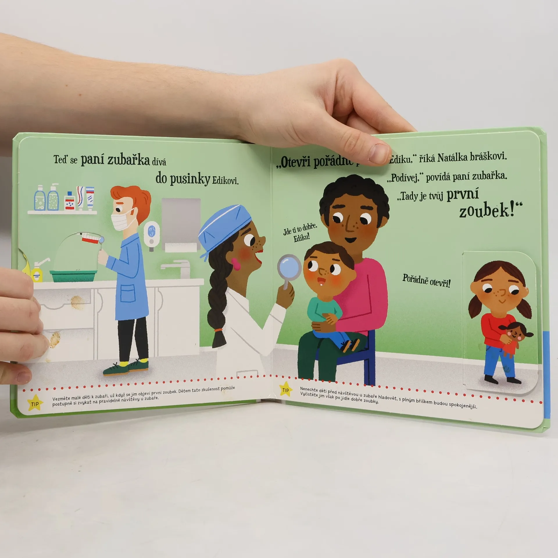 Edík jde dnes úplně poprvé k zubaři, zato jeho starší sestra Natálka už u zubaře byla a ničeho se nebojí! S pomocí této knihy můžete dětem ukázat, že pana zubaře či paní zubařky není potřeba se bát. Na každé dvoustraně najdete radu, jak pomoci s případným strachem ze zubaře či jak děti provést jejich první návštěvou. Návštěva zubaře není nic děsivého a jsou tu hlavně pro to, aby nám pomáhali a pečovali o naše zoubky.