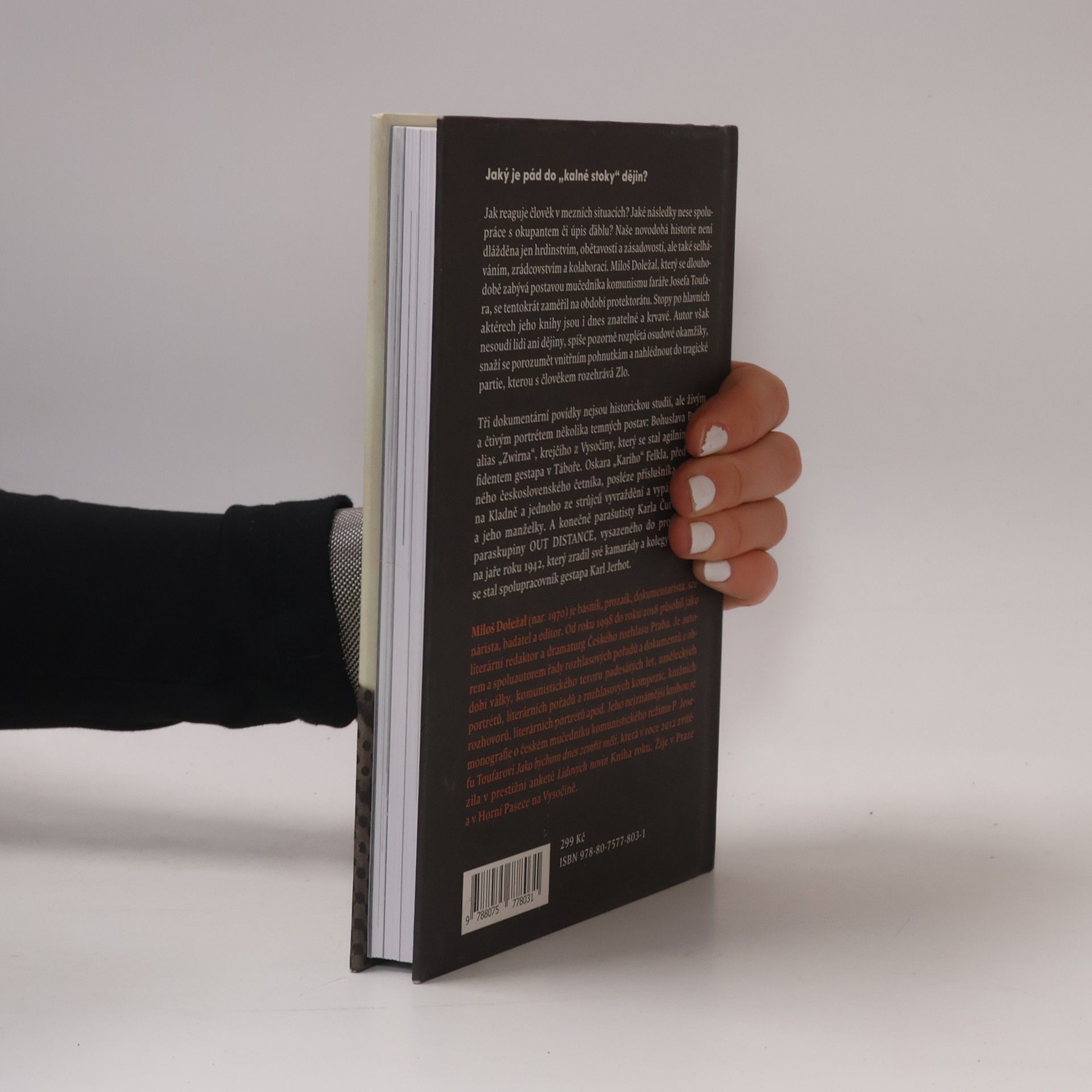 Jaký je pád do „kalné stoky“ dějin? Jak reaguje člověk v mezních situacích? Jaké následky nese spolupráce s okupantem či úpis ďáblu? Naše novodobá historie není dlážděna jen hrdinstvím, obětavostí a zásadovostí, ale také selháváním, zrádcovstvím a kolaborací. Miloš Doležal, který se dlouhodobě zabývá postavou mučedníka komunismu faráře Josefa Toufara, se tentokrát zaměřil na období protektorátu. Stopy po hlavních aktérech jeho knihy jsou i dnes znatelné a krvavé. Autor však nesoudí lidi ani dějiny, spíše pozorně rozplétá osudové okamžiky, snaží se porozumět vnitřním pohnutkám a nahlédnout do tragické partie, kterou s člověkem rozehrává Zlo. Tři dokupovídky nejsou historickou studií, ale živým a čtivým portrétem několika temných postav: Bohuslava Bušty alias „Zwirna“, krejčího z Vysočiny, který se stal agilním konfidentem gestapa v Táboře. Oskara „Kariho“ Felkla, předválečného československého četníka, posléze příslušníka gestapa na Kladně a jednoho ze strůjců vyvraždění a vypálení Lidic, a jeho manželky. A konečně parašutisty Karla Čurdy, člena paraskupiny OUT DISTANCE, vysazeného do protektorátu na jaře 1942, který zradil své kamarády a spolupracovníky a z kterého se stal spolupracovník gestapa Karl Jerhot.