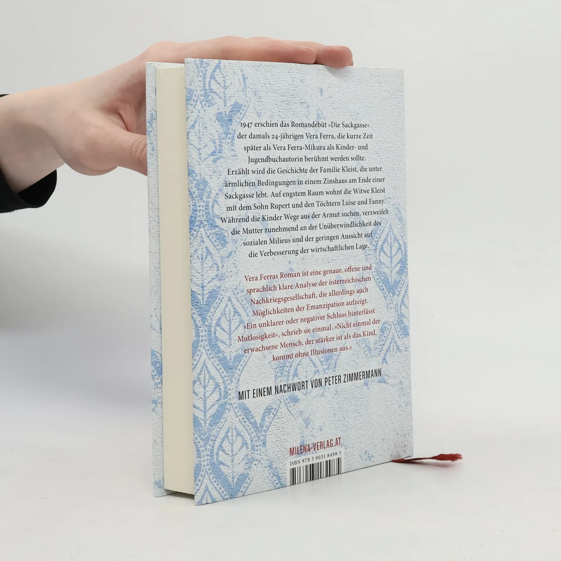 Ohne die Stadt und die Zeit, in der der Roman spielt, explizit zu nennen, erzählt Vera Ferra die Geschichte der Familie Kleist, die unter ärmlichen Bedingungen in einem Zinshaus am Ende einer Sackgasse lebt. Auf engstem Raum lebt die Witwe Kleist mit dem Sohn Rupert und den Töchtern Luise und Fanny. Während die Kinder Wege aus der Armut suchen, verzweifelt die Mutter zunehmend an der Unüberwindlichkeit des sozialen Milieus und der geringen Aussicht auf die Verbesserung der wirtschaftlichen Lage. Unausgesprochen wird klar, dass der Roman im Wien der unmittelbaren Nachkriegszeit spielt und das Haus in der Sackgasse eine Metapher für die Situation Österreichs nach 1945 ist. Die Hausgemeinschaft funktioniert noch immer wie ein Spitzelstaat, in dem willkürliche Anschuldigungen katastrophale Folgen für einzelne Bewohner haben können. Normabweichungen wie etwa ein Schwangerschaftsabbruch werden gesellschaftlich gnadenlos sanktioniert. Neue alte Heilsversprecher versuchen die Jugend wieder zu locken, um sie einer Ideologie zu unterwerfen. Vera Ferras Roman ist eine genaue, offene, mitunter brutale und sprachlich klare Analyse der österreichischen Nachkriegsgesellschaft, die allerdings auch Möglichkeiten der Emanzipation aufzeigt. „Ein unklarer oder negativer Schluss hinterlässt Mutlosigkeit“, schrieb sie einmal. „Nicht einmal der erwachsene Mensch, der stärker ist als das Kind, kommt ohne Illusionen aus.“