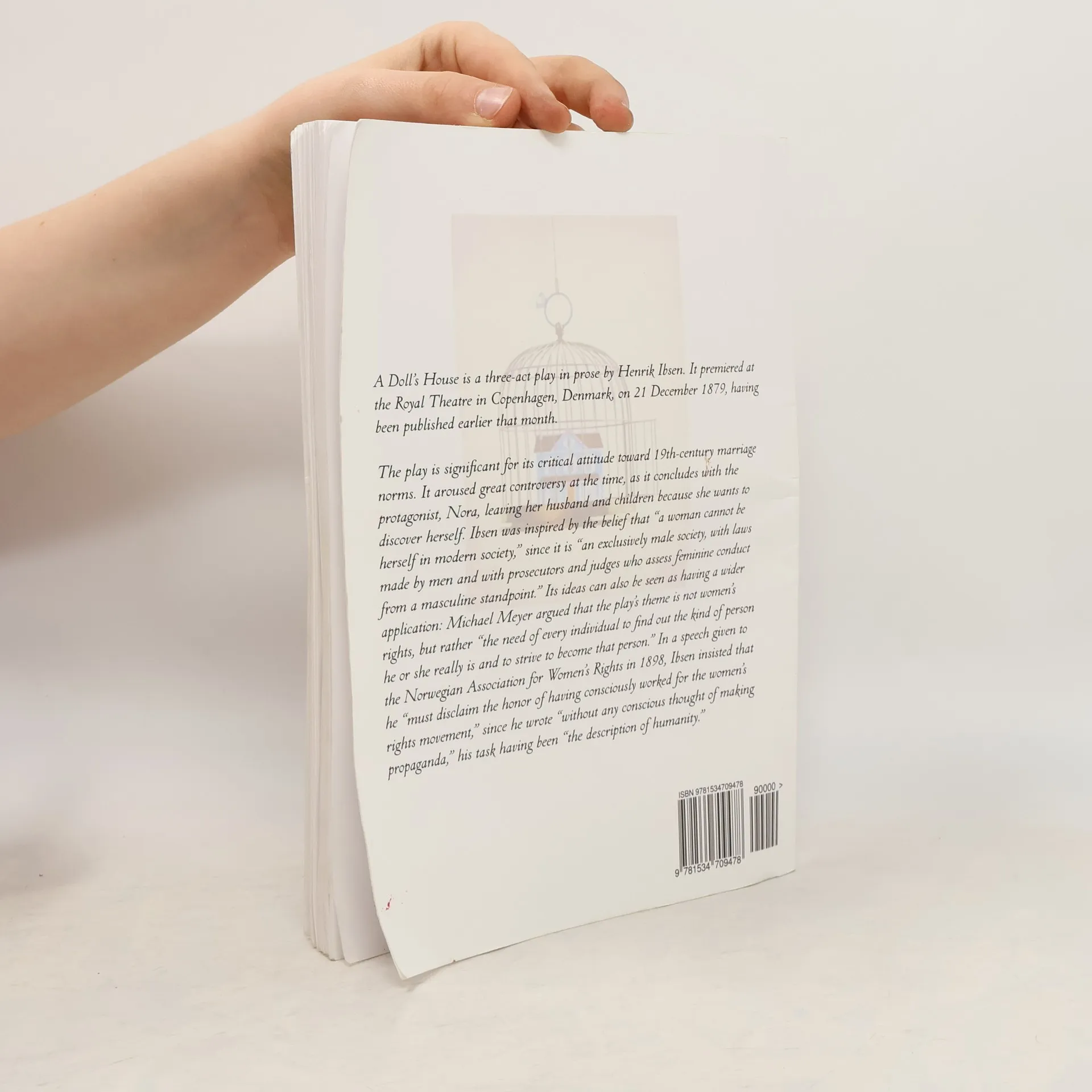 A Doll's House by Henrik Ibsen A Doll's House is a three-act play in prose by Henrik Ibsen. It premiered at the Royal Theatre in Copenhagen, Denmark, on 21 December 1879, having been published earlier that month. The play is significant for its critical attitude toward 19th-century marriage norms. It aroused great controversy at the time, as it concludes with the protagonist, Nora, leaving her husband and children because she wants to discover herself. Ibsen was inspired by the belief that "a woman cannot be herself in modern society," since it is "an exclusively male society, with laws made by men and with prosecutors and judges who assess feminine conduct from a masculine standpoint." Its ideas can also be seen as having a wider application: Michael Meyer argued that the play's theme is not women's rights, but rather "the need of every individual to find out the kind of person he or she really is and to strive to become that person." In a speech given to the Norwegian Association for Women's Rights in 1898, Ibsen insisted that he "must disclaim the honor of having consciously worked for the women's rights movement," since he wrote "without any conscious thought of making propaganda," his task having been "the description of humanity."