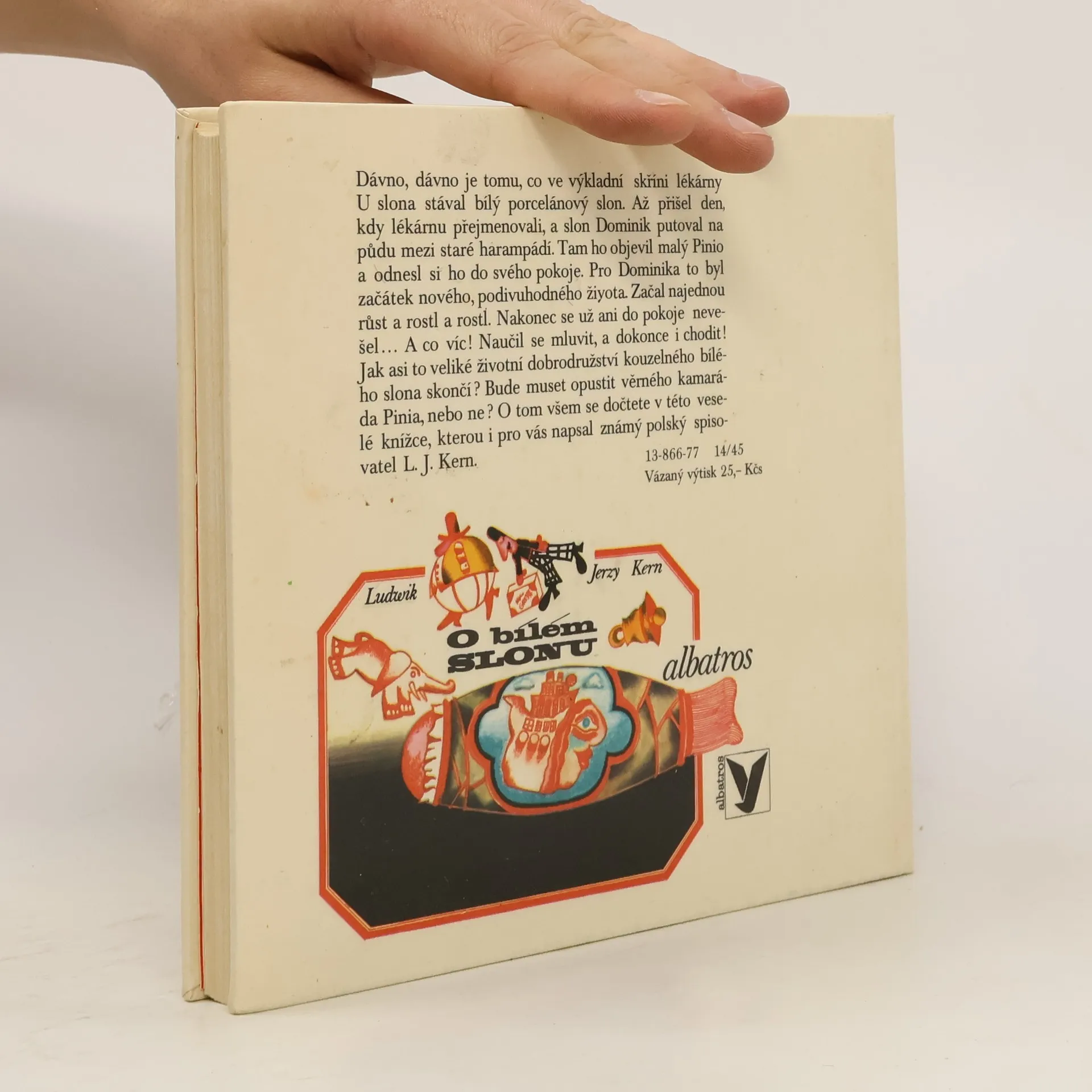 Dávno, dávno je tomu, co ve výkladní skříni lékárny U slona stával bílý porcelánový slon. Až přišel den, kdy lékárnu přejmenovali, a slon Dominik putoval na půdu mezi staré harampádí. Tam ho objevil malý Pinio a odnesl si ho do svého pokoje. Pro Dominika to byl začátek nového, podivuhodného života. Začal najednou růst a rostl a rostl. Nakonec se už ani do pokoje nevešel... A co víc! Naučil se mluvit, a dokonce i chodit! Jak asi to veliké životní dobrodružství kouzelného bílého slona skončí? Bude muset opustit věrného kamaráda Pinia, nebo ne? O tom všem se dočtete v této veselé knížce, kterou i pro vás napsal známý polský spisovatel L. J. Kern.